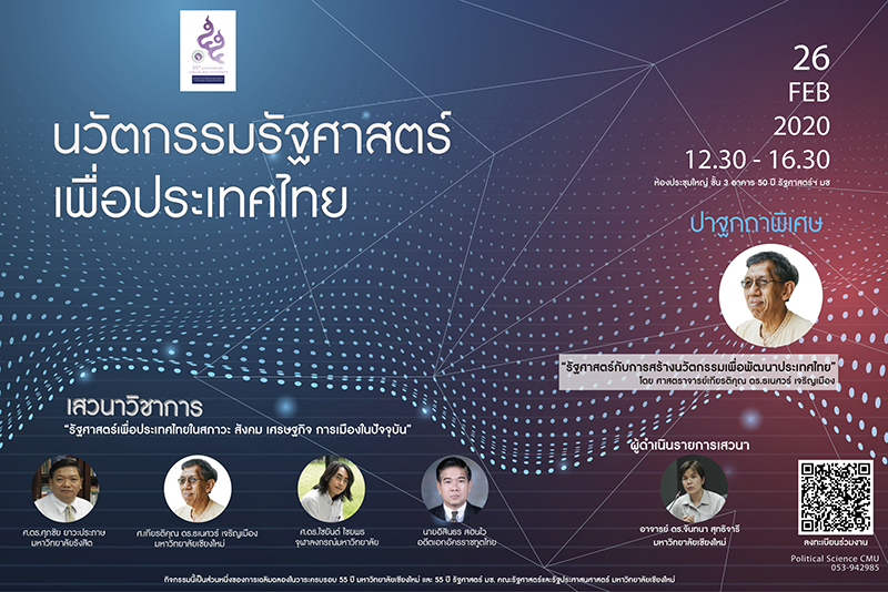 คณะรัฐศาสตร์และรัฐประศาสนศาสตร์ มหาวิทยาลัยเชียงใหม่ จะได้จัดกิจกรรมทางวิชาการ “นวัตกรรมรัฐศาสตร์เพื่อประเทศไทย” ครั้งที่ 1 ขึ้นในวันที่ 26 กุมภาพันธ์ 2563 เวลา 12.30 - 16.30 น. ณ ห้องประชุมใหญ่ ชั้น 3 อาคาร 50 ปี คณะรัฐศาสตร์และรัฐประศาสนศาสตร์ มหาวิทยาลัยเชียงใหม่