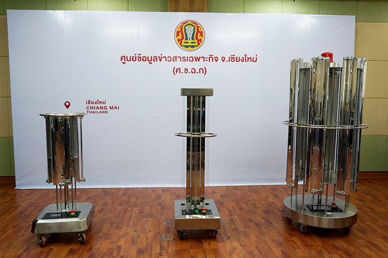 วันที่ 28 เมษายน เวลา 13.30 น. ผศ.ดร.ธัญญานุภาพ อานันทนะ ผู้อำนวยการอุทยานวิทยาศาสตร์และเทคโนโลยี มหาวิทยาลัยเชียงใหม่ และ ผศ.ดร.เกษมศักดิ์ อุทัยชนะ รองผู้อำนวยการฯ พร้อมด้วย คุณไกสร มณีจันทร์ ประธานกรรมการบริษัท มณีจันทร์ ไอโอที โซลูชัน จำกัด Startup ด้าน IOT ภายใต้โครงการบ่มเพาะธุรกิจของอุทยานฯ เดินหน้ามอบผลผลิตนวัตกรรมเครื่องฉายแสง UVC ฆ่าเชื้อแบบเคลื่อนที่ “V-Free By Maneejun” จำนวน 3 เครื่อง รวมมูลค่า 163,000 บาท แก่หน่วยงานราชการจังหวัดเชียงใหม่ โดยมีนายเจริญฤทธิ์ สงวนสัตย์ ผู้ว่าราชการจังหวัดเชียงใหม่ เป็นผู้รับมอบ ณ ศาลากลางจังหวัดเชียงใหม่ เพื่อขยายผลการใช้งานผลผลิตนวัตกรรมให้เข้าถึงกลุ่มคนทุกภาคส่วนมากขึ้นนอกเหนือจากการมอบเพื่อใช้ในสถานพยาบาลจากที่ดำเนินการมอบมาแล้วจำนวนมากกว่า 10 แห่ง โดยหวังช่วยบรรเทาสถานการณ์ความรุนแรงด้านการแพทย์และสาธารณสุขในปัจจุบัน รวมถึงการใช้ประโยชน์แก่ประชาชนในระยะยาว