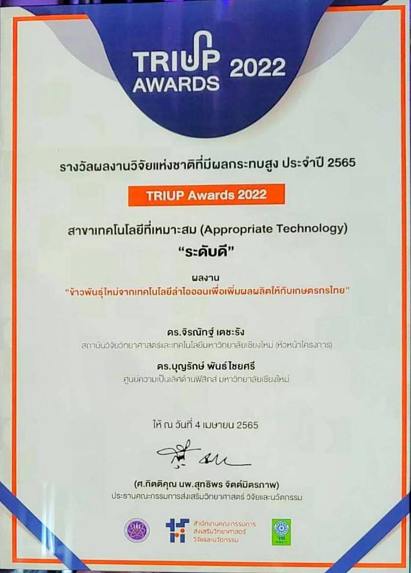 รองศาสตราจารย์ ดร.สัมพันธ์ สิงหราชวราพันธ์ รองอธิการบดีมหาวิทยาลัยเชียงใหม่ ร่วมแสดงความยินดีกับ ดร.จิรณัทฐ์ เตชะรัง (ร่วมกับดร.บุญรักษ์ พันธุ์ไชยศรี) สถาบันวิจัยวิทยาศาสตร์และเทคโนโลยี ในโอกาสที่ได้รับรางวัล Prime Minister's TRIUP Award 2022 รางวัลผลงานวิจัยแห่งชาติที่มีผลกระทบสูง สาขาเทคโนโลยีที่เหมาะสม "ระดับดี" จากผลงาน "ข้าวพันธุ์ใหม่จากเทคโนโลยีลำไอออนเพื่อเพิ่มผลผลิตให้กับเกษตรกรไทย" จาก ศาสตราจารย์กิตติคุณ นพ.สุทธิพร จิตต์มิตรภาพ ประธาน สกสว. ในงาน TRIUP Fair ณ สามย่านมิตรทาวน์ กรุงเทพมหานคร เมื่อวันที่ 4 เมษายน พ.ศ. 2556