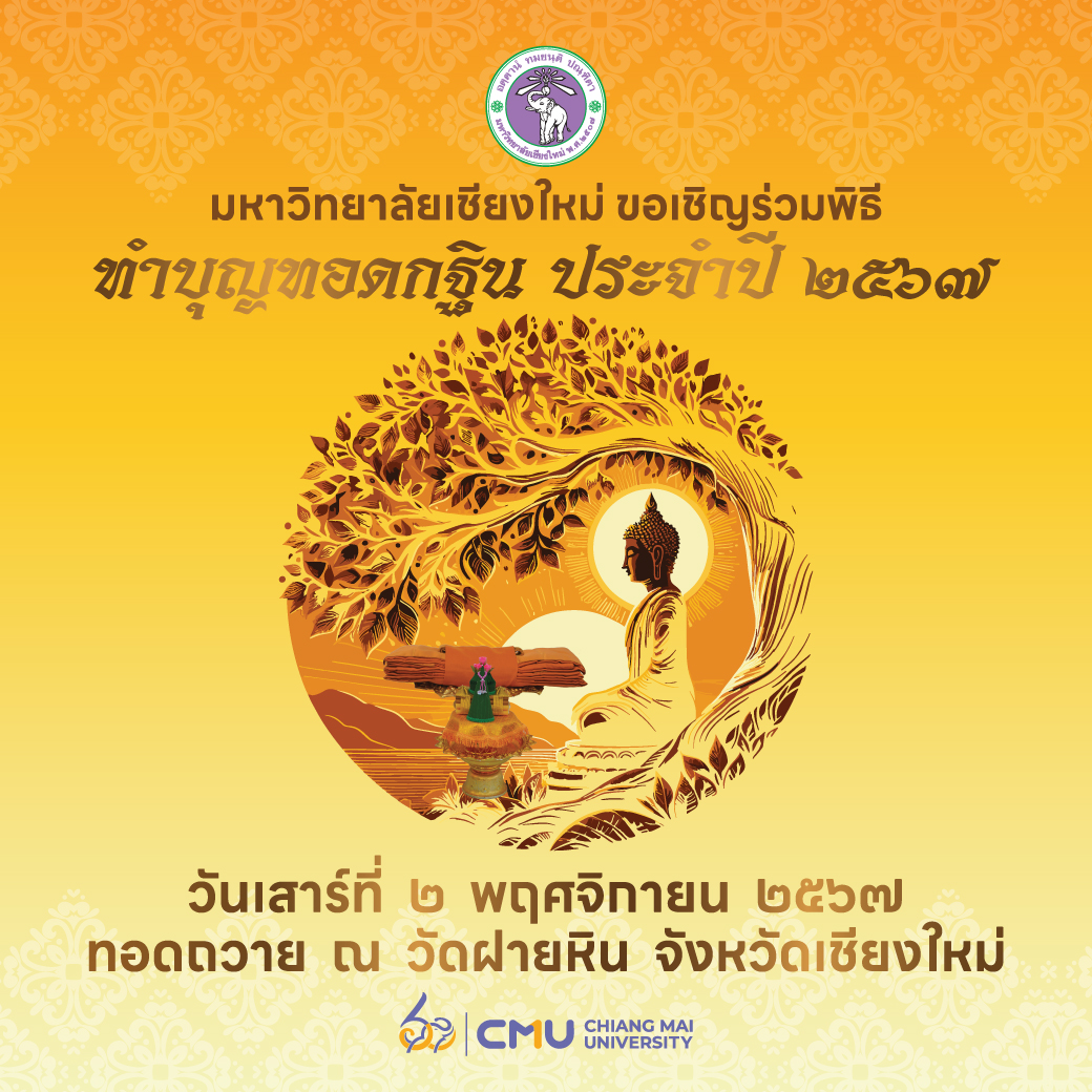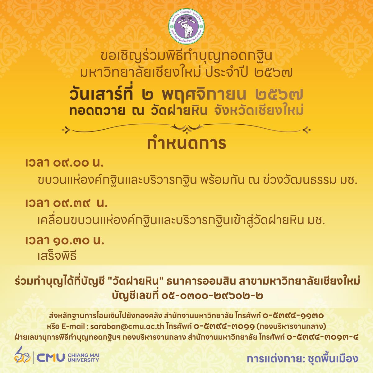 มหาวิทยาลัยเชียงใหม่ จัดพิธีทำบุญทอดกฐินมหาวิทยาลัยเชียงใหม่ ประจำปี 2567 ในวันที่ 2 พฤศจิกายน 2567 ทอดถวาย ณ วัดฝายหิน ตำบลสุเทพ อำเภอเมือง จังหวัดเชียงใหม่