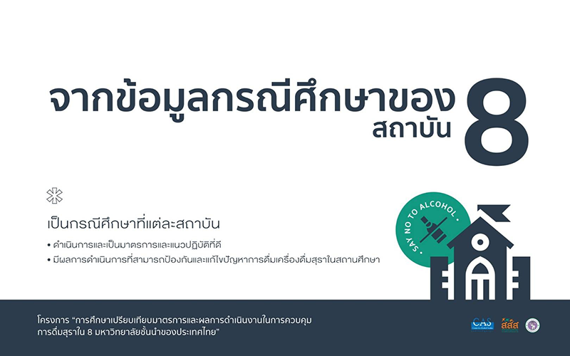 คณะผู้วิจัยมหาวิทยาลัยเชียงใหม่ ประกอบด้วย ผู้ช่วยศาสตราจารย์ ดร. พิชญลักษณ์ พิชญกุล ผู้ช่วยศาสตราจารย์ ดร.สงวนศักดิ์ ธนาพรพูนพงษ์ นายสุเมธ สารศรี และ นายกีรติ กรุงศรี ได้รับการสนับสนุนจากศูนย์วิจัยปัญหาสุรา (ศวส.) ในการดำเนินการศึกษาวิจัยเพื่อเปรียบเทียบมาตรการและผลการดำเนินงานในการควบคุมการดื่มสุราของมหาวิทยาลัยชั้นนำในประเทศไทยเพื่อหาแนวทางที่เป็นเลิศในการจัดการปัญหาการดื่มสุราโดยทำการศึกษาใน 8 มหาวิทยาลัยชั้นนำของประเทศไทยซึ่งกระจายอยู่ทั้งในกรุงเทพ ปริมณฑล และเมืองใหญ่ในภาคเหนือ ภาคอีสาน และภาคใต้ มีนักศึกษาประมาณ 15,000 – 70,000 คน โดยคณะผู้วิจัยได้รวบรวมข้อมูลจากการสัมภาษณ์ผู้บริหารและเจ้าหน้าที่ของแต่ละมหาวิทยาลัยที่ที่รับผิดชอบมาตรการในการควบคุมการดื่มสุราโดยตรง และทำโฟกัสกรุ๊ปกับกลุ่มตัวแทนสโมสรนักศึกษาที่สามารถให้ข้อมูลได้ทั้งในมุมมองของการเป็นสโมสรนักศึกษาผู้มีส่วนร่วมในการดำเนินมาตรการฯและในมุมมองการเป็นนักศึกษาที่อยู่ภายใต้มาตรการควบคุมการดื่มสุราของมหาวิทยาลัย และนำเสนอผลการวิเคราะห์ให้กับกลุ่มผู้เชี่ยวชาญด้านปัญหาสุราแล้วจึงสรุปเป็นแนวทางที่เป็นเลิศในการจัดการปัญหาการดื่มสุราในมหาวิทยาลัย