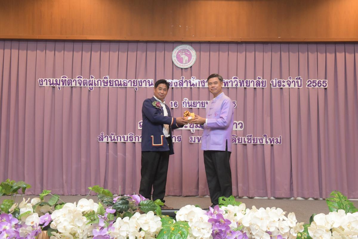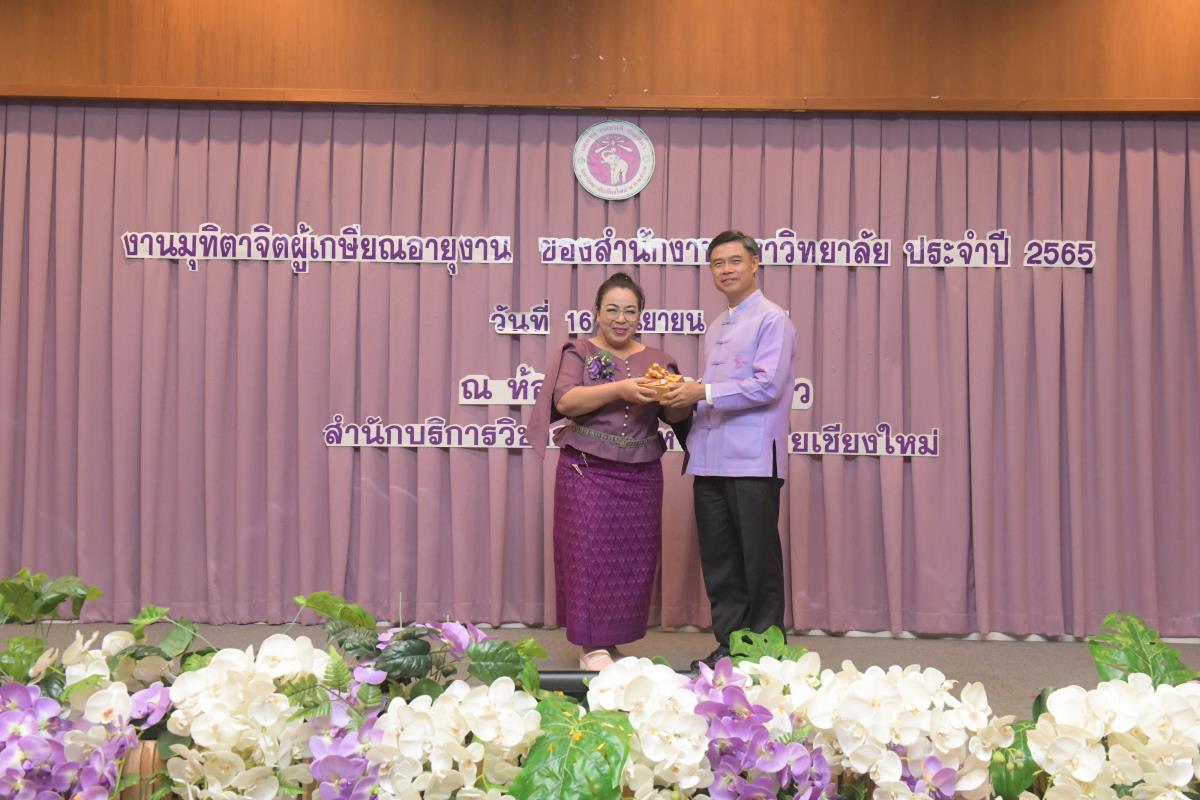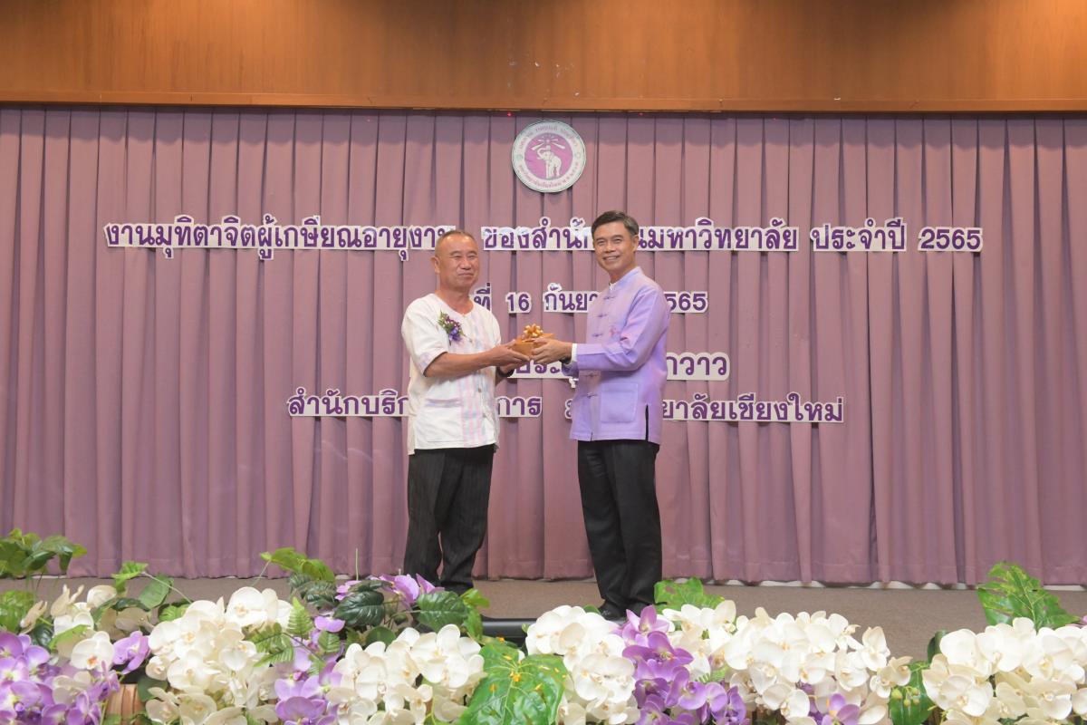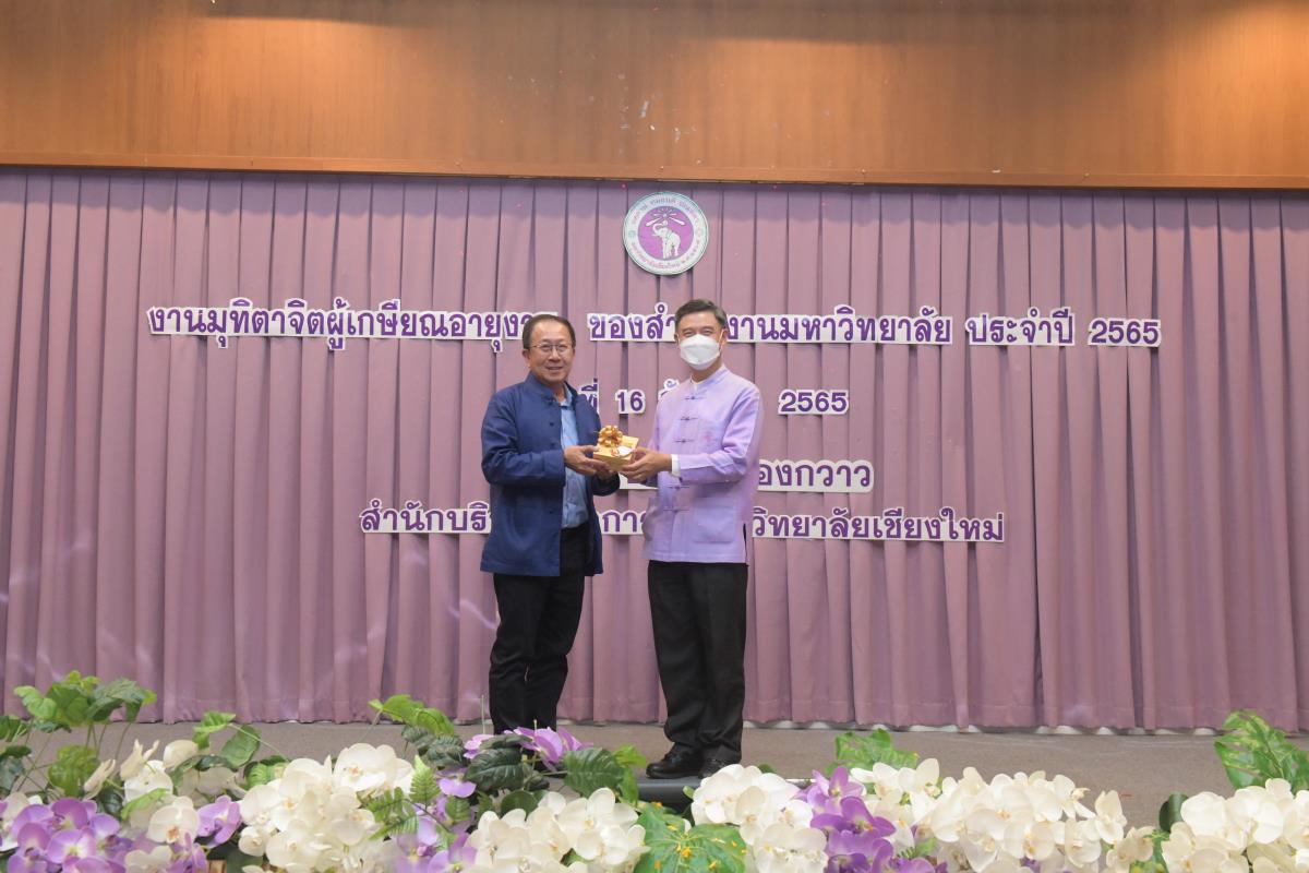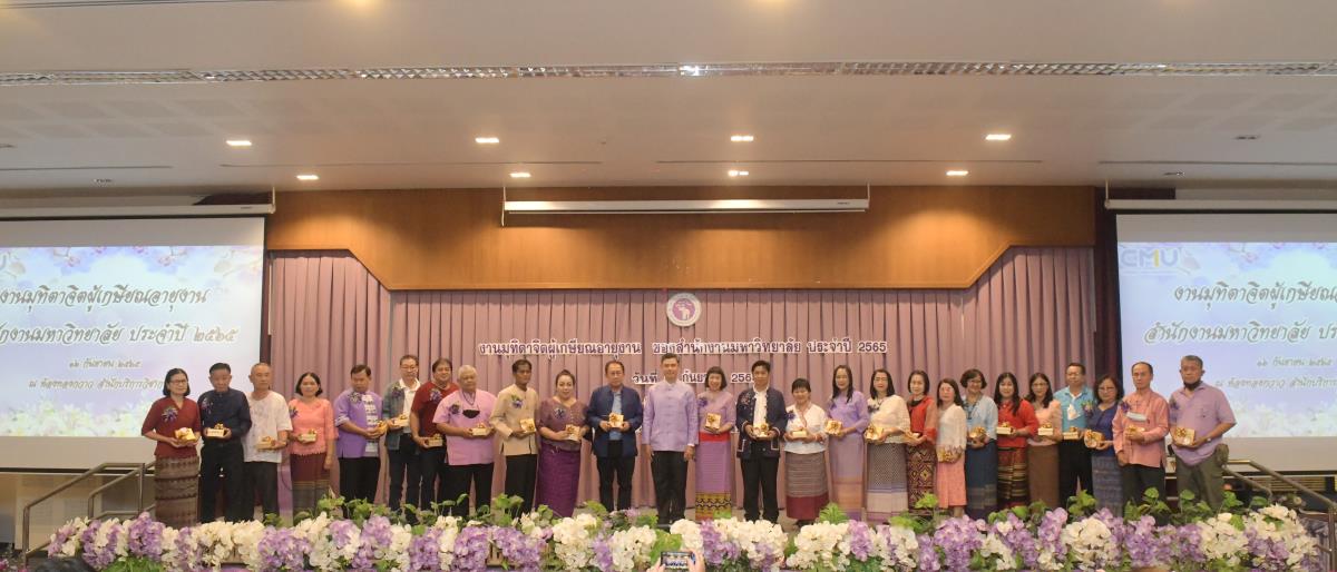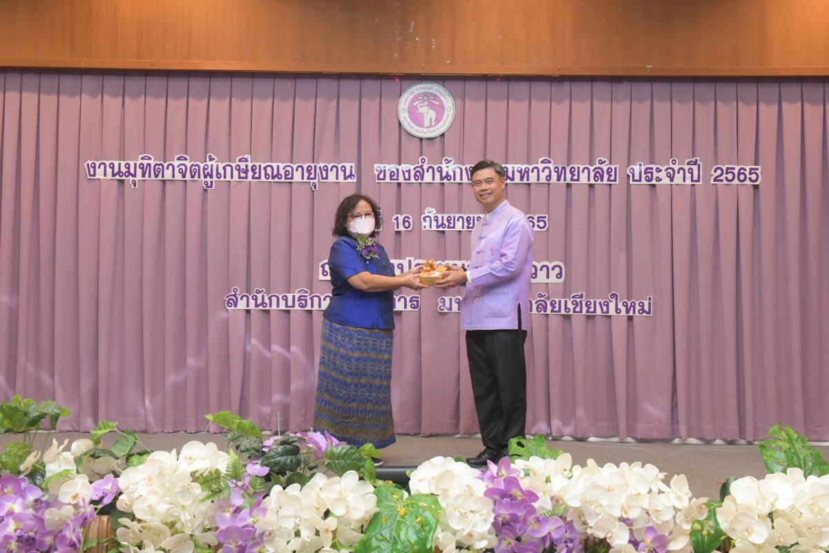 ศาสตราจารย์ ดร.นพ.พงษ์รักษ์ ศรีบัณฑิตมงคล อธิการบดีมหาวิทยาลัยเชียงใหม่ เป็นประธานในพิธีมุทิตาจิต บุคลากรสังกัดสำนักงานมหาวิทยาลัย มหาวิทยาลัยเชียงใหม่ ที่เกษียณอายุงานประจำปี 2565 โดยมีคณะผู้บริหาร หัวหน้างาน และเจ้าหน้าที่ ร่วมงาน เพื่อแสดงความขอบคุณและยกย่องในเกียรติ คุณงามความดี ที่ได้เสียสละและอุทิศตนในการทำงานให้แก่มหาวิทยาลัยเชียงใหม่ตลอดระยะเวลาที่ผ่านมา ณ ห้องทองกวาว สำนักบริการวิชาการ มหาวิทยาลัยเชียงใหม่ เมื่อวันศุกร์ที่ 16 กันยายน พ.ศ. 2565 ซึ่งผู้ร่วมงานทุกท่านได้มีการตรวจและส่งผล ATK ก่อนร่วมงานพร้อมทั้งปฏิบัติตามแนวด้านสาธารณสุขเพื่อป้องกันการแพร่ระบาดของโรคติดเชื้อไวรัสโคโรนา 2019