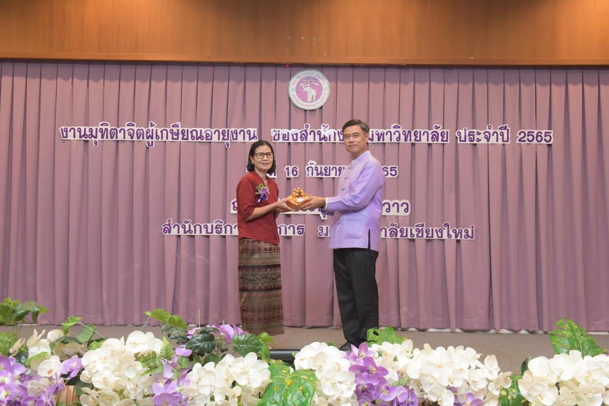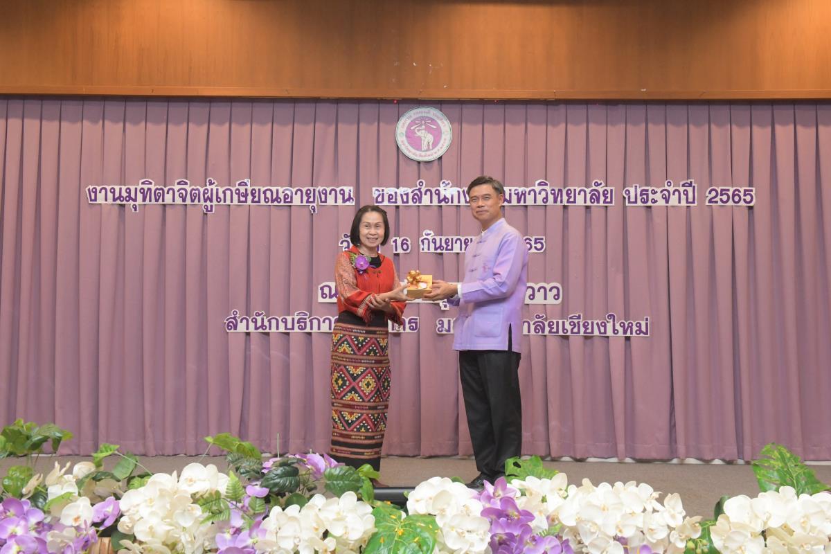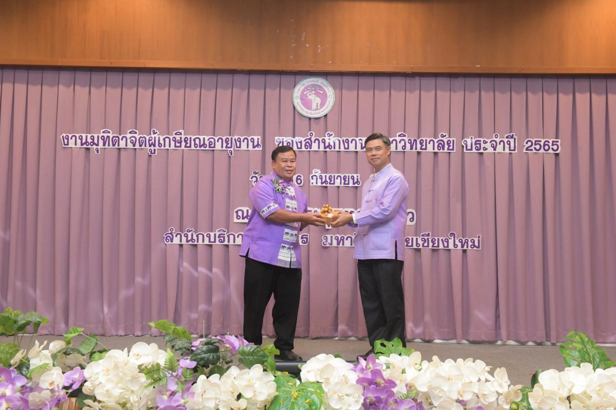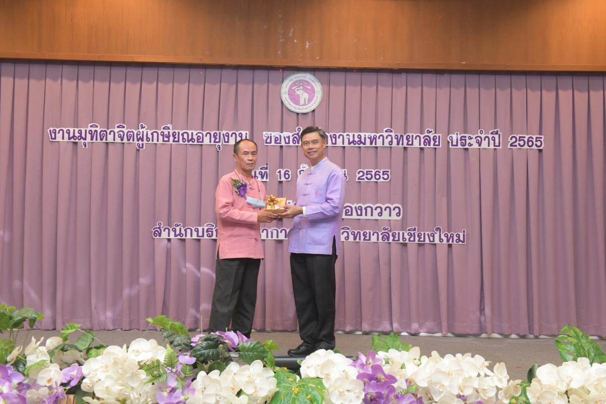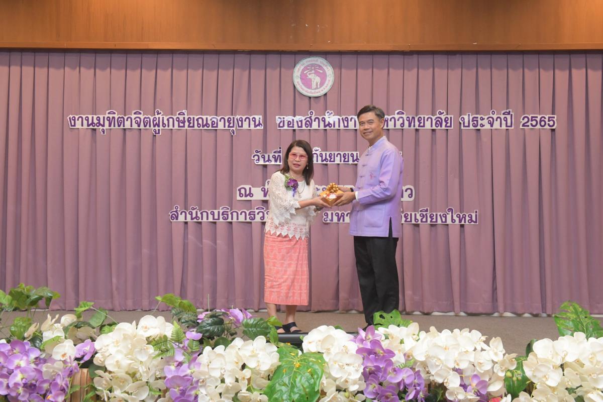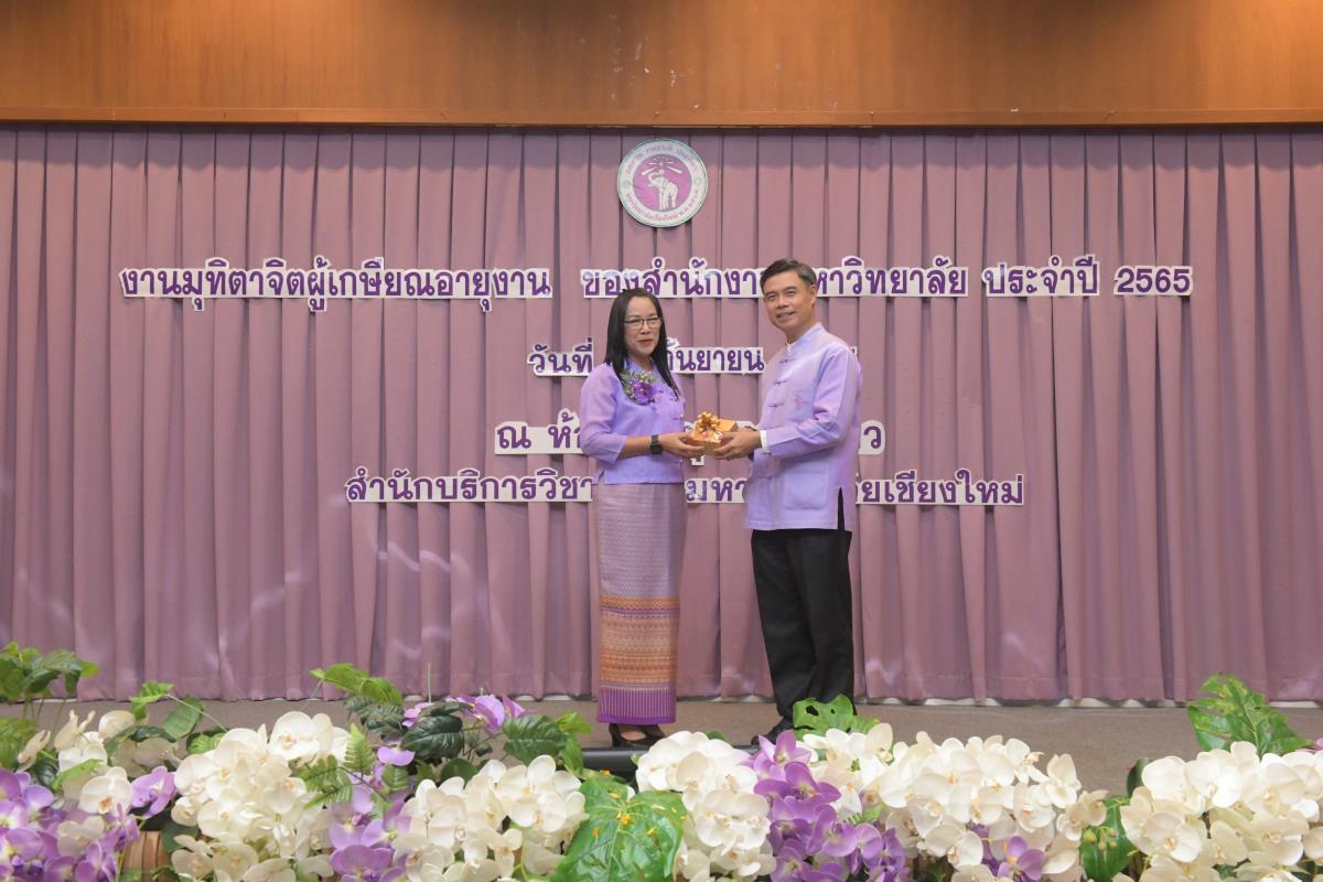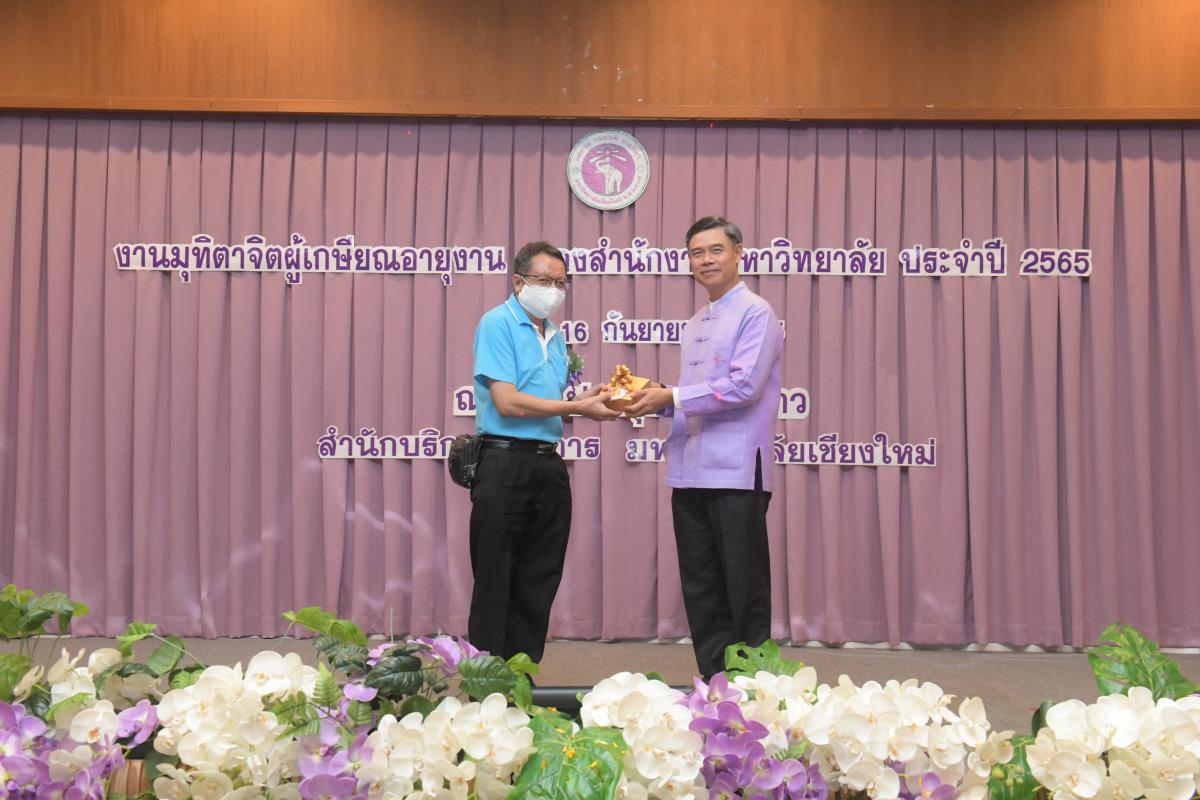 ศาสตราจารย์ ดร.นพ.พงษ์รักษ์ ศรีบัณฑิตมงคล อธิการบดีมหาวิทยาลัยเชียงใหม่ เป็นประธานในพิธีมุทิตาจิต บุคลากรสังกัดสำนักงานมหาวิทยาลัย มหาวิทยาลัยเชียงใหม่ ที่เกษียณอายุงานประจำปี 2565 โดยมีคณะผู้บริหาร หัวหน้างาน และเจ้าหน้าที่ ร่วมงาน เพื่อแสดงความขอบคุณและยกย่องในเกียรติ คุณงามความดี ที่ได้เสียสละและอุทิศตนในการทำงานให้แก่มหาวิทยาลัยเชียงใหม่ตลอดระยะเวลาที่ผ่านมา ณ ห้องทองกวาว สำนักบริการวิชาการ มหาวิทยาลัยเชียงใหม่ เมื่อวันศุกร์ที่ 16 กันยายน พ.ศ. 2565 ซึ่งผู้ร่วมงานทุกท่านได้มีการตรวจและส่งผล ATK ก่อนร่วมงานพร้อมทั้งปฏิบัติตามแนวด้านสาธารณสุขเพื่อป้องกันการแพร่ระบาดของโรคติดเชื้อไวรัสโคโรนา 2019