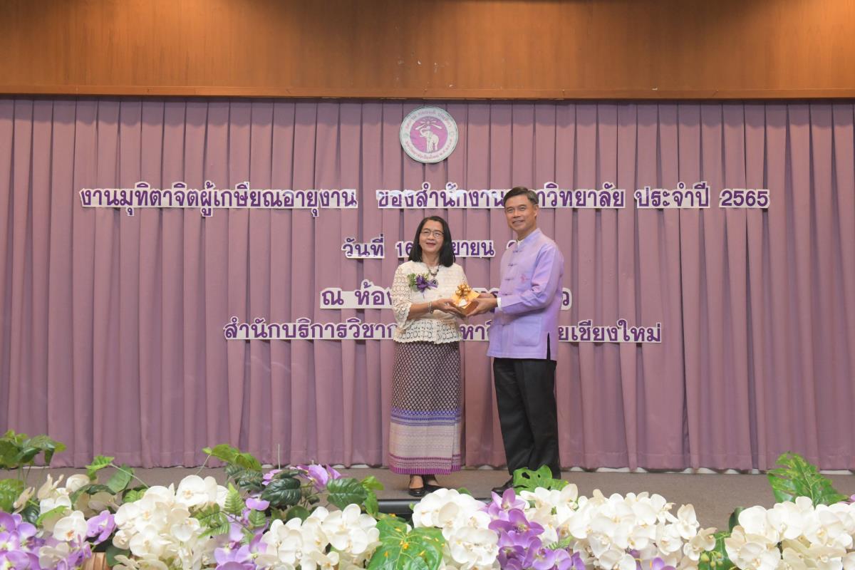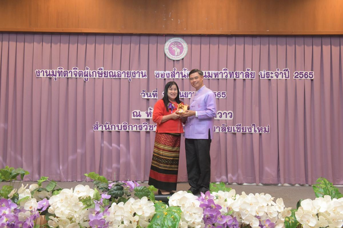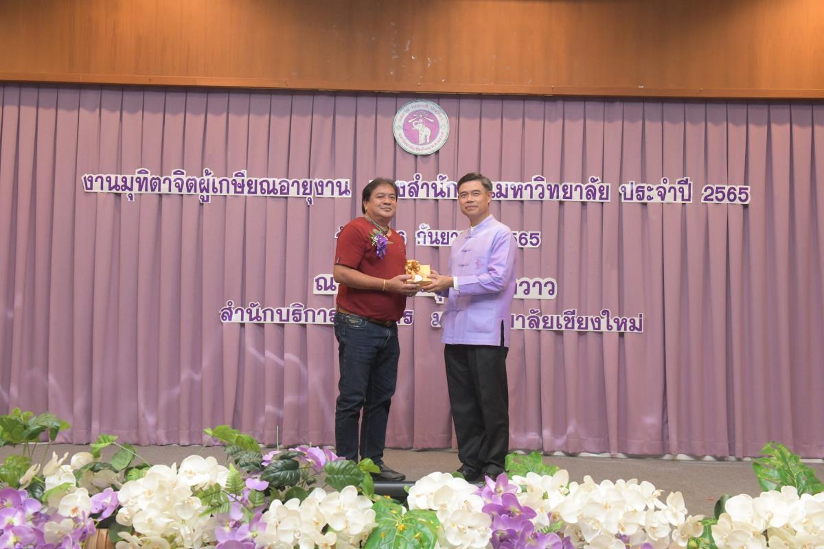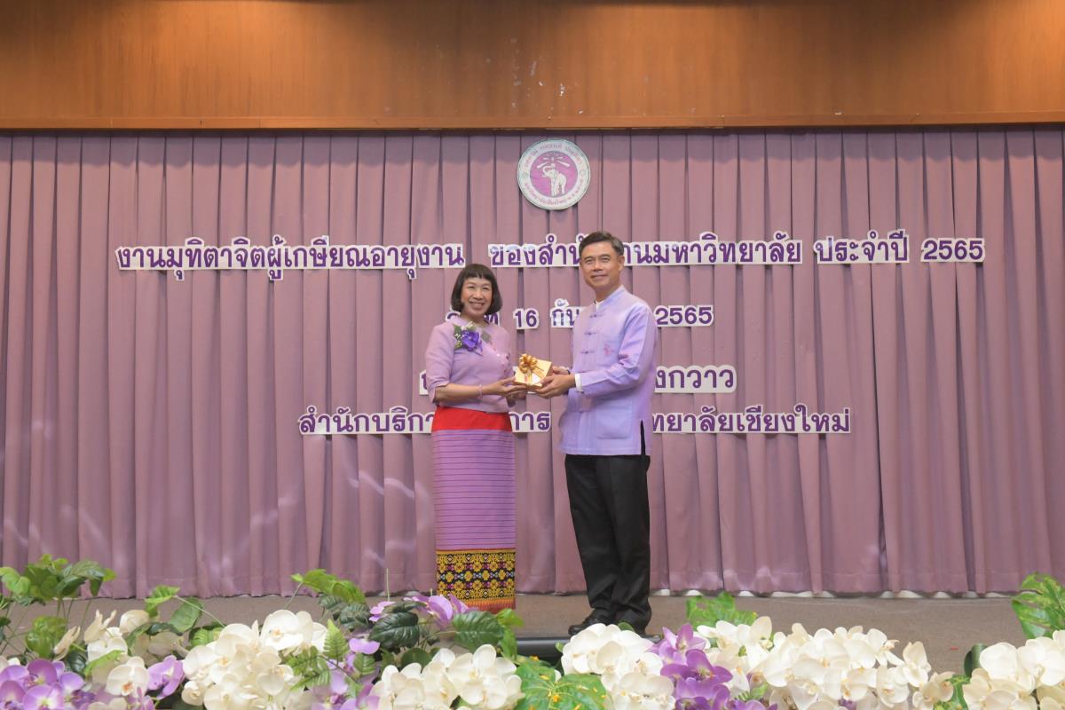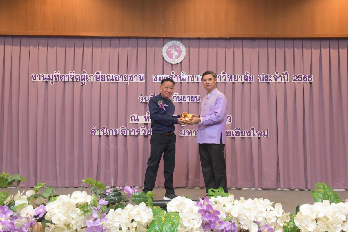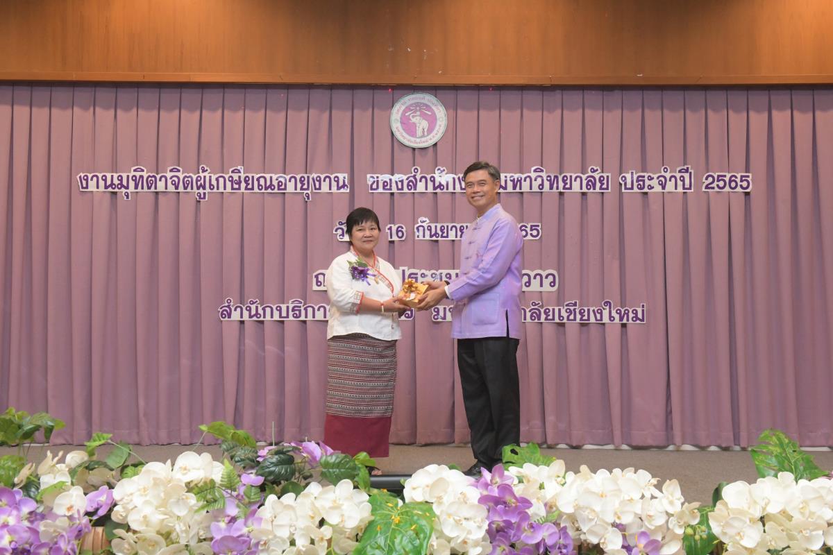 ศาสตราจารย์ ดร.นพ.พงษ์รักษ์ ศรีบัณฑิตมงคล อธิการบดีมหาวิทยาลัยเชียงใหม่ เป็นประธานในพิธีมุทิตาจิต บุคลากรสังกัดสำนักงานมหาวิทยาลัย มหาวิทยาลัยเชียงใหม่ ที่เกษียณอายุงานประจำปี 2565 โดยมีคณะผู้บริหาร หัวหน้างาน และเจ้าหน้าที่ ร่วมงาน เพื่อแสดงความขอบคุณและยกย่องในเกียรติ คุณงามความดี ที่ได้เสียสละและอุทิศตนในการทำงานให้แก่มหาวิทยาลัยเชียงใหม่ตลอดระยะเวลาที่ผ่านมา ณ ห้องทองกวาว สำนักบริการวิชาการ มหาวิทยาลัยเชียงใหม่ เมื่อวันศุกร์ที่ 16 กันยายน พ.ศ. 2565 ซึ่งผู้ร่วมงานทุกท่านได้มีการตรวจและส่งผล ATK ก่อนร่วมงานพร้อมทั้งปฏิบัติตามแนวด้านสาธารณสุขเพื่อป้องกันการแพร่ระบาดของโรคติดเชื้อไวรัสโคโรนา 2019