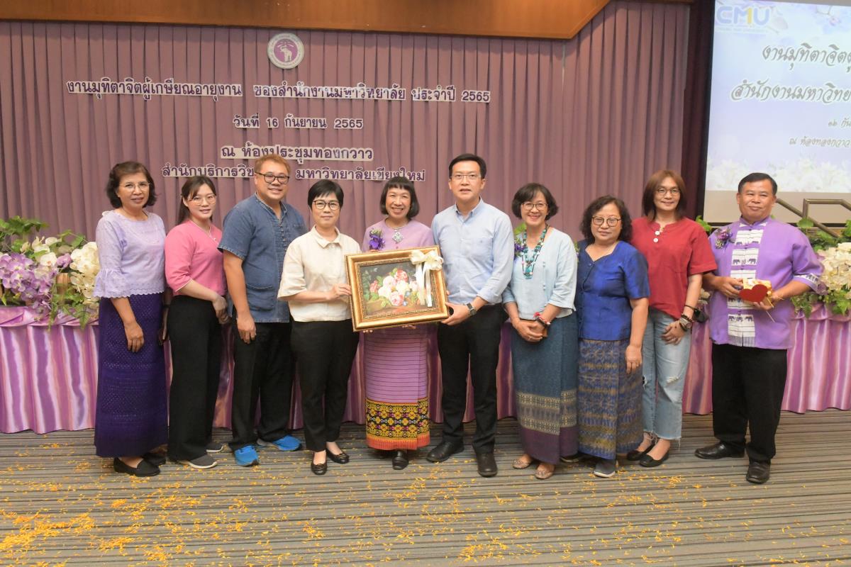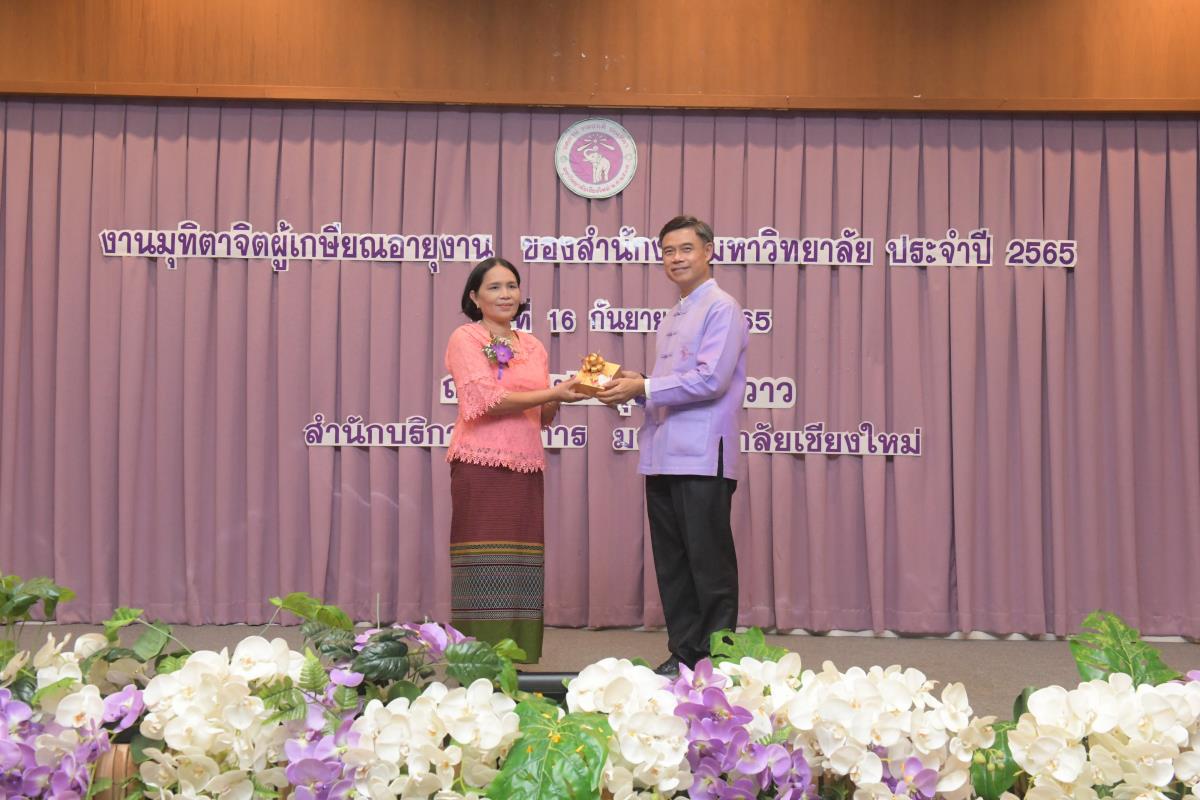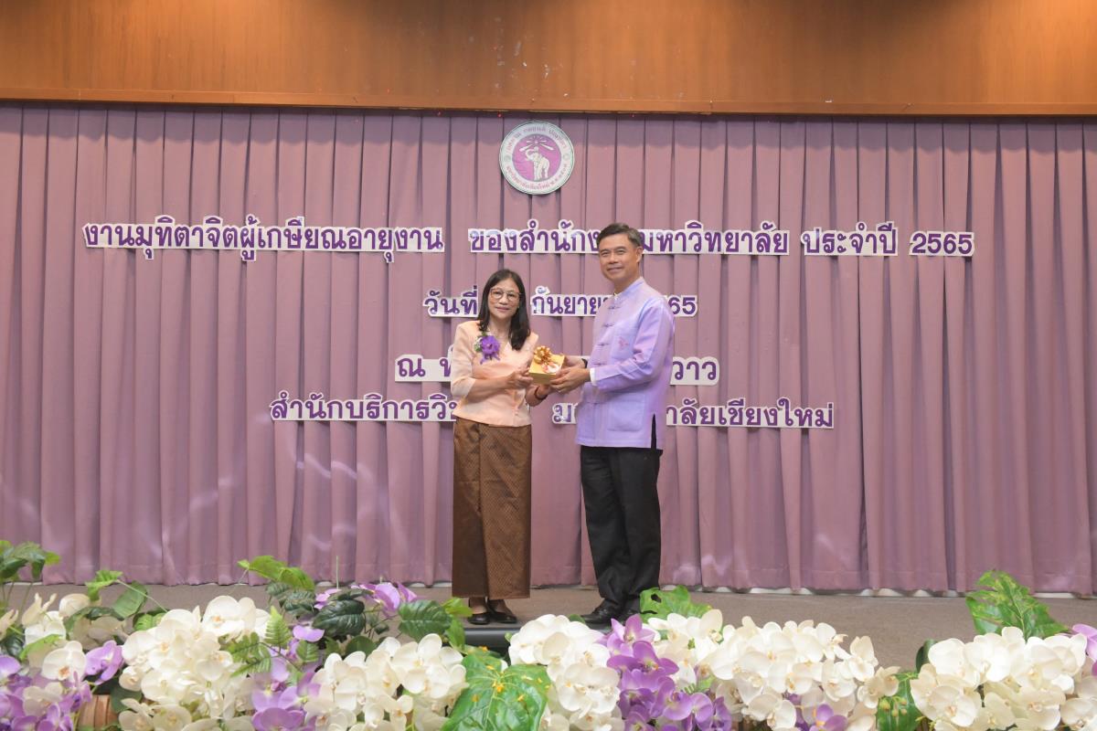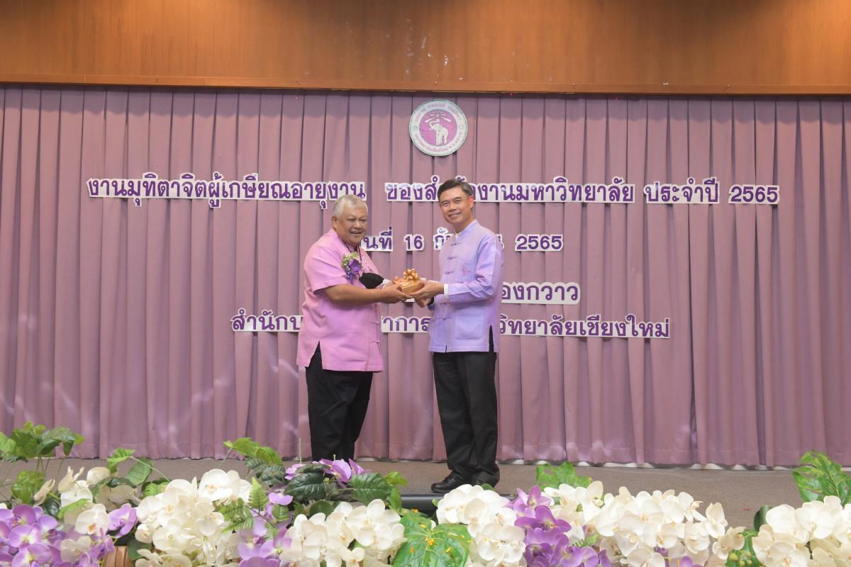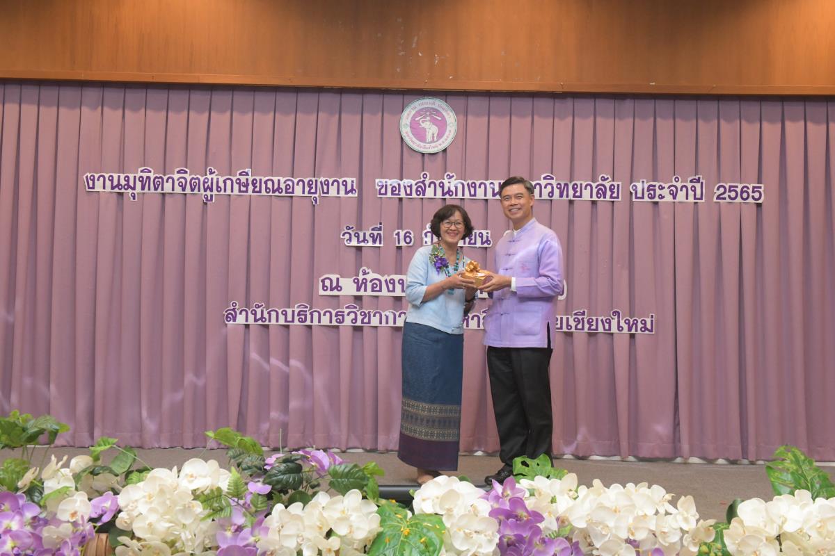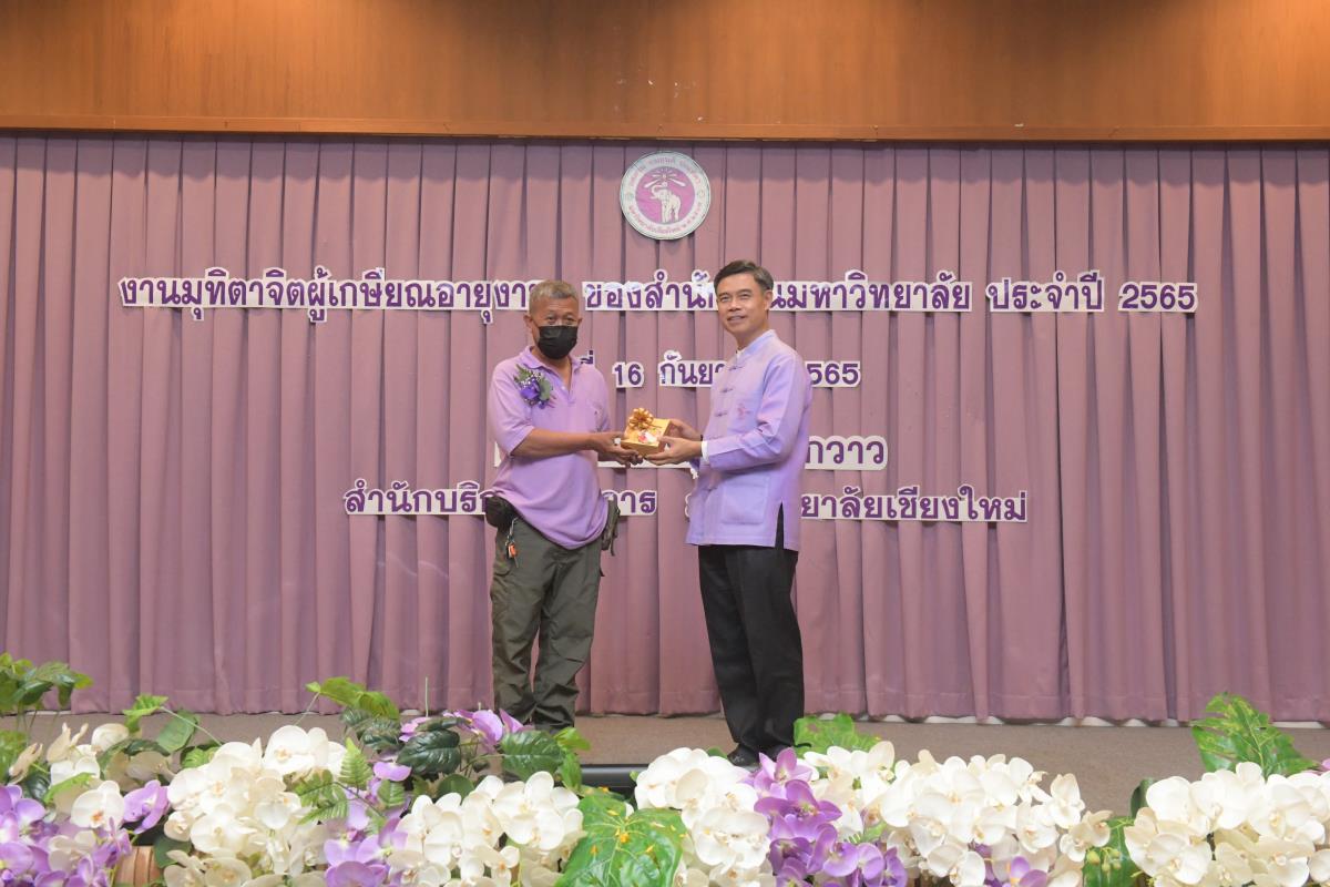 ศาสตราจารย์ ดร.นพ.พงษ์รักษ์ ศรีบัณฑิตมงคล อธิการบดีมหาวิทยาลัยเชียงใหม่ เป็นประธานในพิธีมุทิตาจิต บุคลากรสังกัดสำนักงานมหาวิทยาลัย มหาวิทยาลัยเชียงใหม่ ที่เกษียณอายุงานประจำปี 2565 โดยมีคณะผู้บริหาร หัวหน้างาน และเจ้าหน้าที่ ร่วมงาน เพื่อแสดงความขอบคุณและยกย่องในเกียรติ คุณงามความดี ที่ได้เสียสละและอุทิศตนในการทำงานให้แก่มหาวิทยาลัยเชียงใหม่ตลอดระยะเวลาที่ผ่านมา ณ ห้องทองกวาว สำนักบริการวิชาการ มหาวิทยาลัยเชียงใหม่ เมื่อวันศุกร์ที่ 16 กันยายน พ.ศ. 2565 ซึ่งผู้ร่วมงานทุกท่านได้มีการตรวจและส่งผล ATK ก่อนร่วมงานพร้อมทั้งปฏิบัติตามแนวด้านสาธารณสุขเพื่อป้องกันการแพร่ระบาดของโรคติดเชื้อไวรัสโคโรนา 2019
