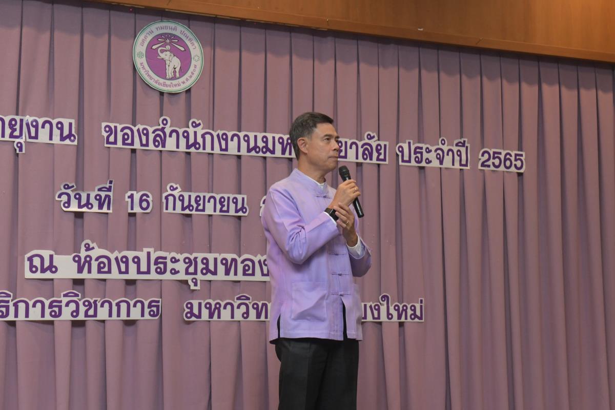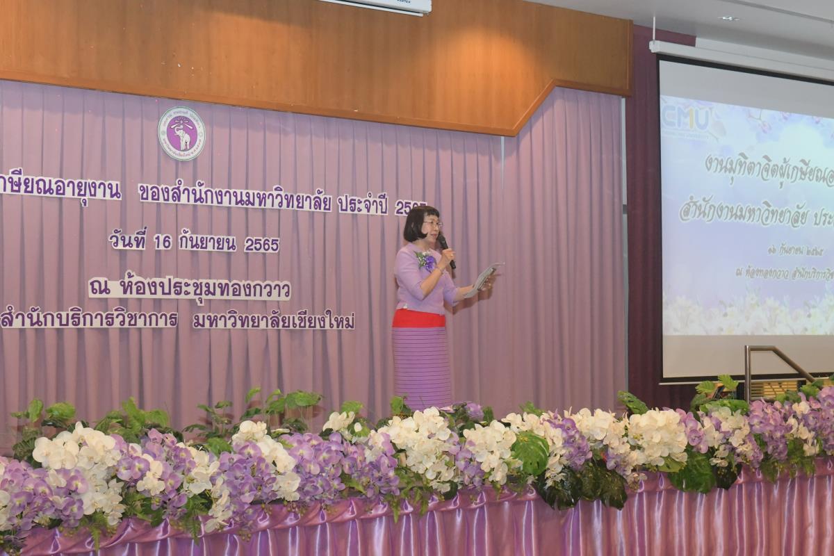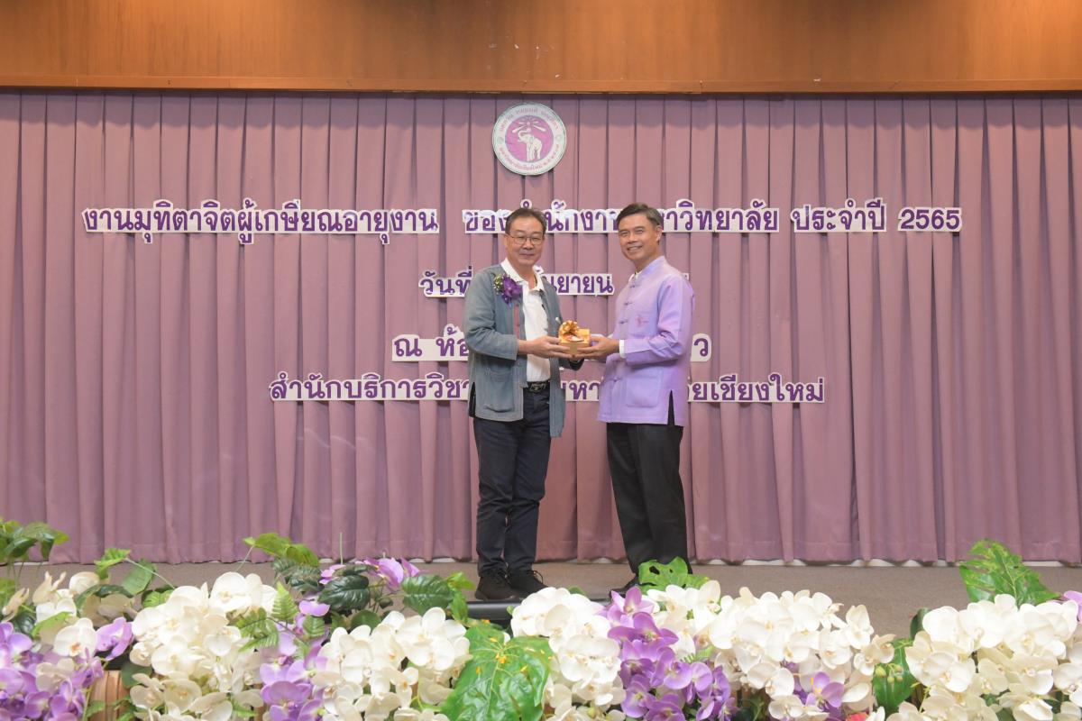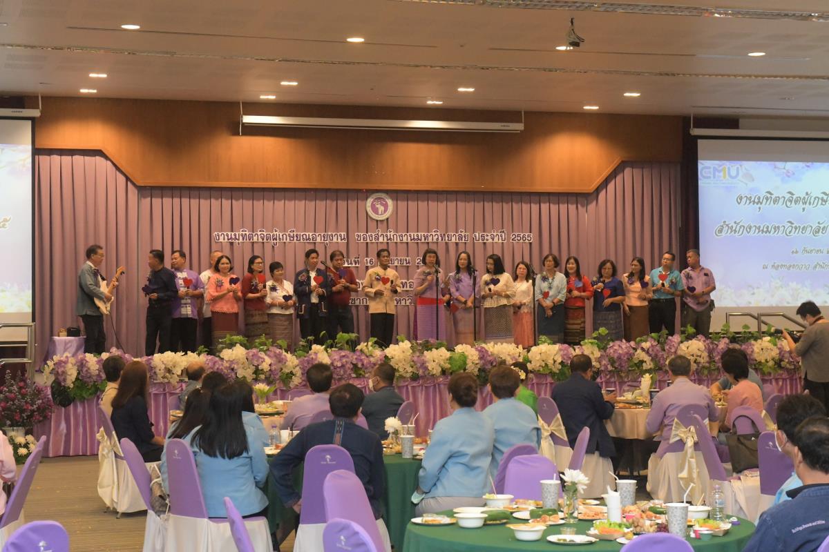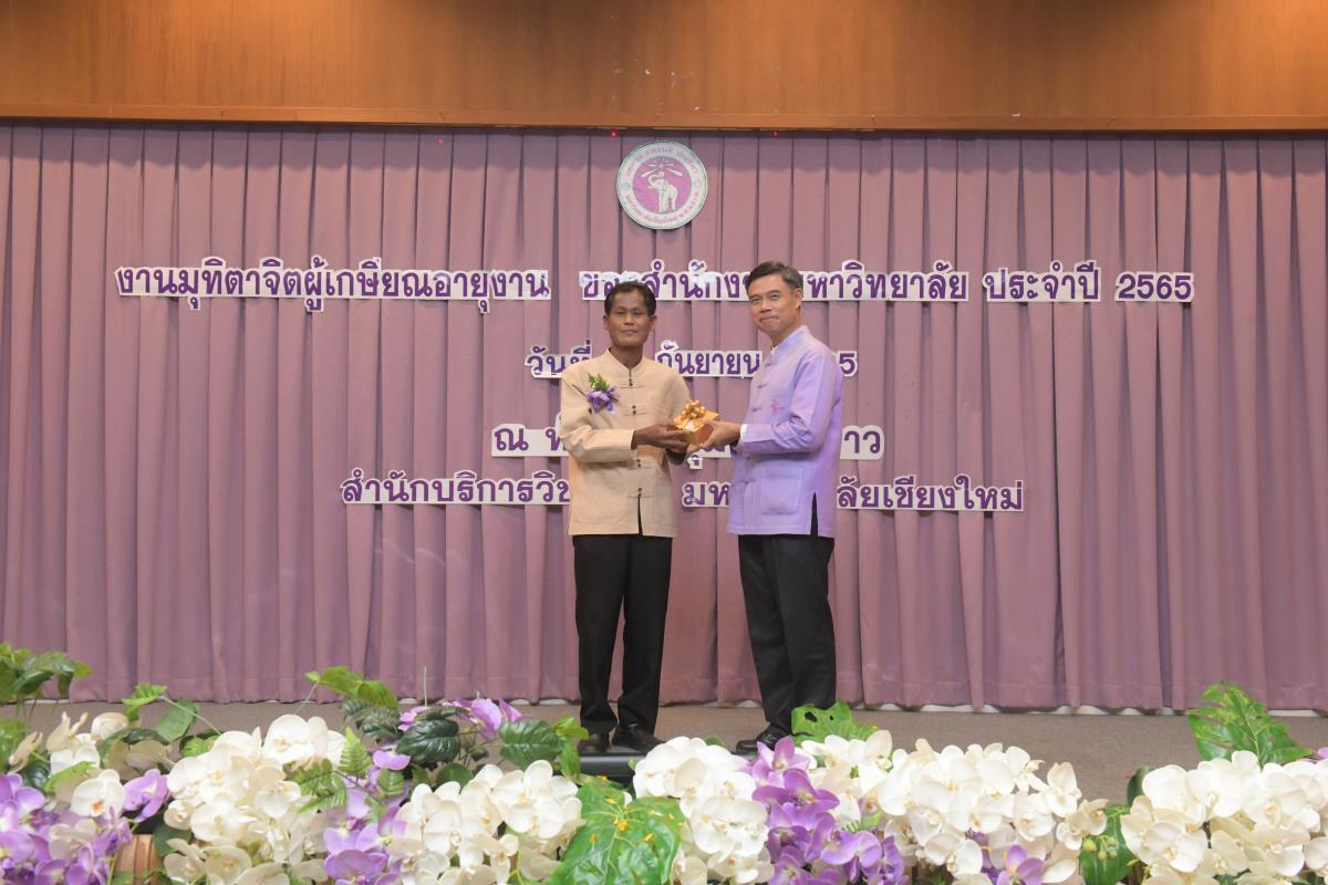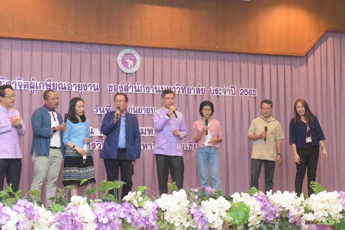 ศาสตราจารย์ ดร.นพ.พงษ์รักษ์ ศรีบัณฑิตมงคล อธิการบดีมหาวิทยาลัยเชียงใหม่ เป็นประธานในพิธีมุทิตาจิต บุคลากรสังกัดสำนักงานมหาวิทยาลัย มหาวิทยาลัยเชียงใหม่ ที่เกษียณอายุงานประจำปี 2565 โดยมีคณะผู้บริหาร หัวหน้างาน และเจ้าหน้าที่ ร่วมงาน เพื่อแสดงความขอบคุณและยกย่องในเกียรติ คุณงามความดี ที่ได้เสียสละและอุทิศตนในการทำงานให้แก่มหาวิทยาลัยเชียงใหม่ตลอดระยะเวลาที่ผ่านมา ณ ห้องทองกวาว สำนักบริการวิชาการ มหาวิทยาลัยเชียงใหม่ เมื่อวันศุกร์ที่ 16 กันยายน พ.ศ. 2565 ซึ่งผู้ร่วมงานทุกท่านได้มีการตรวจและส่งผล ATK ก่อนร่วมงานพร้อมทั้งปฏิบัติตามแนวด้านสาธารณสุขเพื่อป้องกันการแพร่ระบาดของโรคติดเชื้อไวรัสโคโรนา 2019