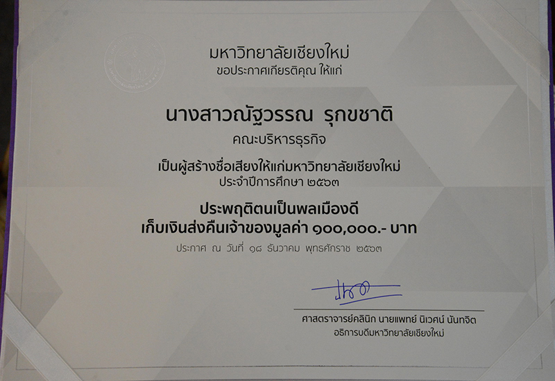 ศาสตราจารย์คลินิก นพ.นิเวศน์ นันทจิต อธิการบดีมหาวิทยาลัยเชียงใหม่ มอบประกาศเกียรติคุณ แก่ นางสาวณัฐวรรณ รุกขชาติ นักศึกษาคณะบริหารธุรกิจ รหัสนักศึกษา 621510092 และนาย ฌัลล์ชล ณ ลำพูน นักศึกษาคณะมนุษยศาสตร์ มหาวิทยาลัยเชียงใหม่ รหัสนักศึกษา 620110253 เนื่องจากนักศึกษาเก็บเงินได้จำนวน 100,000 บาท (หนึ่งแสนบาท) และได้นำส่งคืนเจ้าของ เพื่อยกย่องชมเชยนักศึกษาที่ประพฤติตนเป็นพลเมืองดี มีคุณธรรม ซื่อสัตย์ สุจริต และนำชื่อเสียงมาสู่มหาวิทยาลัยเชียงใหม่ โดยมีคณะผู้บริหารและเจ้าหน้าที่ร่วมแสดงความยินดี ณ ห้องรับรอง อาคารยุทธศาสตร์ สำนักงานมหาวิทยาลัย มหาวิทยาลัยเชียงใหม่ วันจันทร์ที่ 21 ธันวาคม พ.ศ. 2563