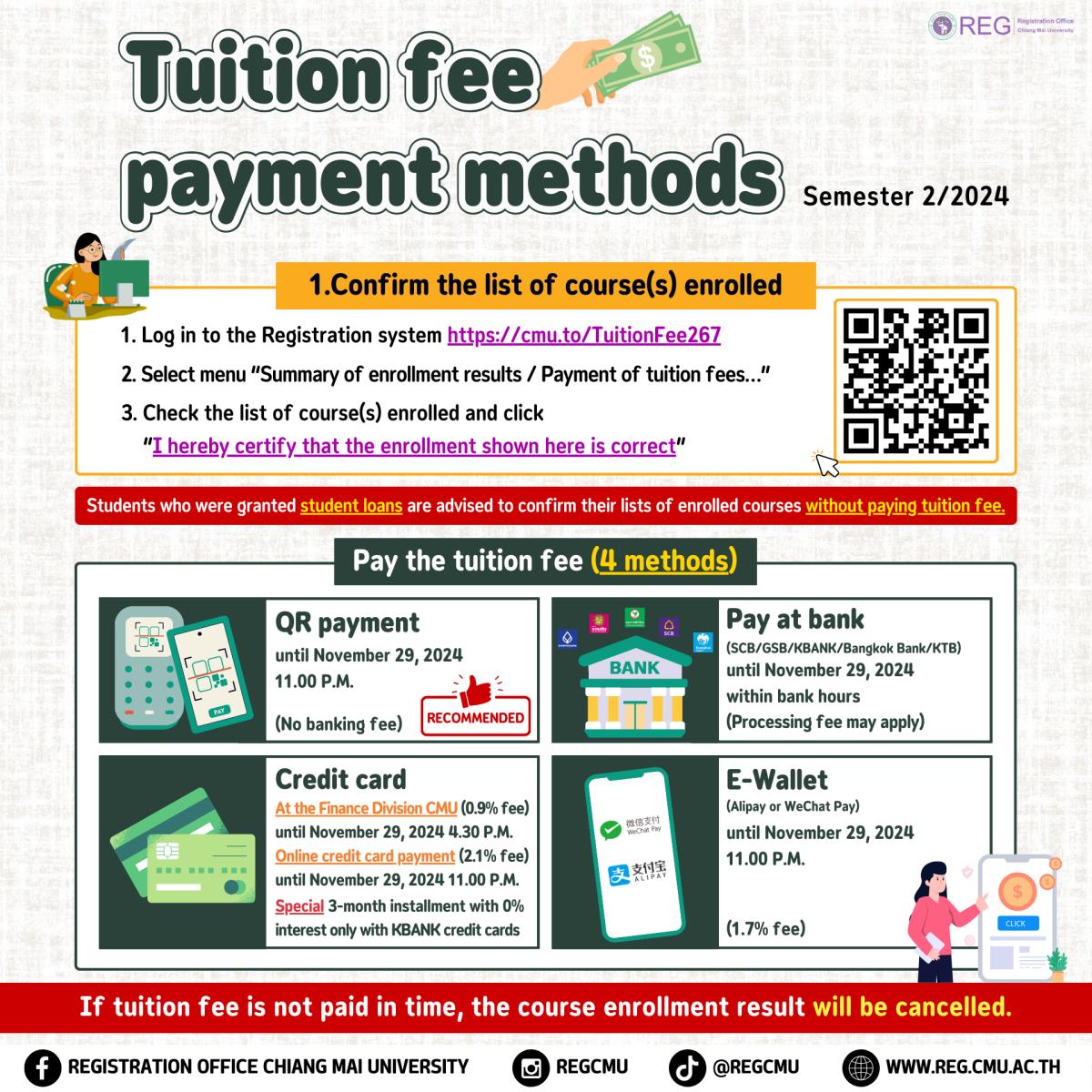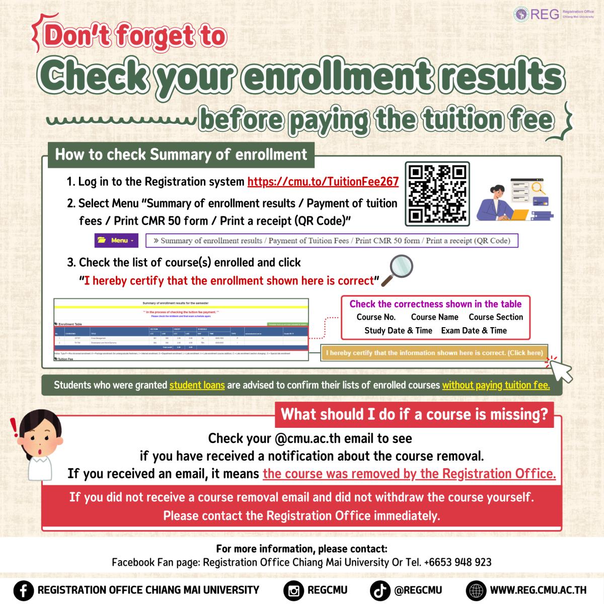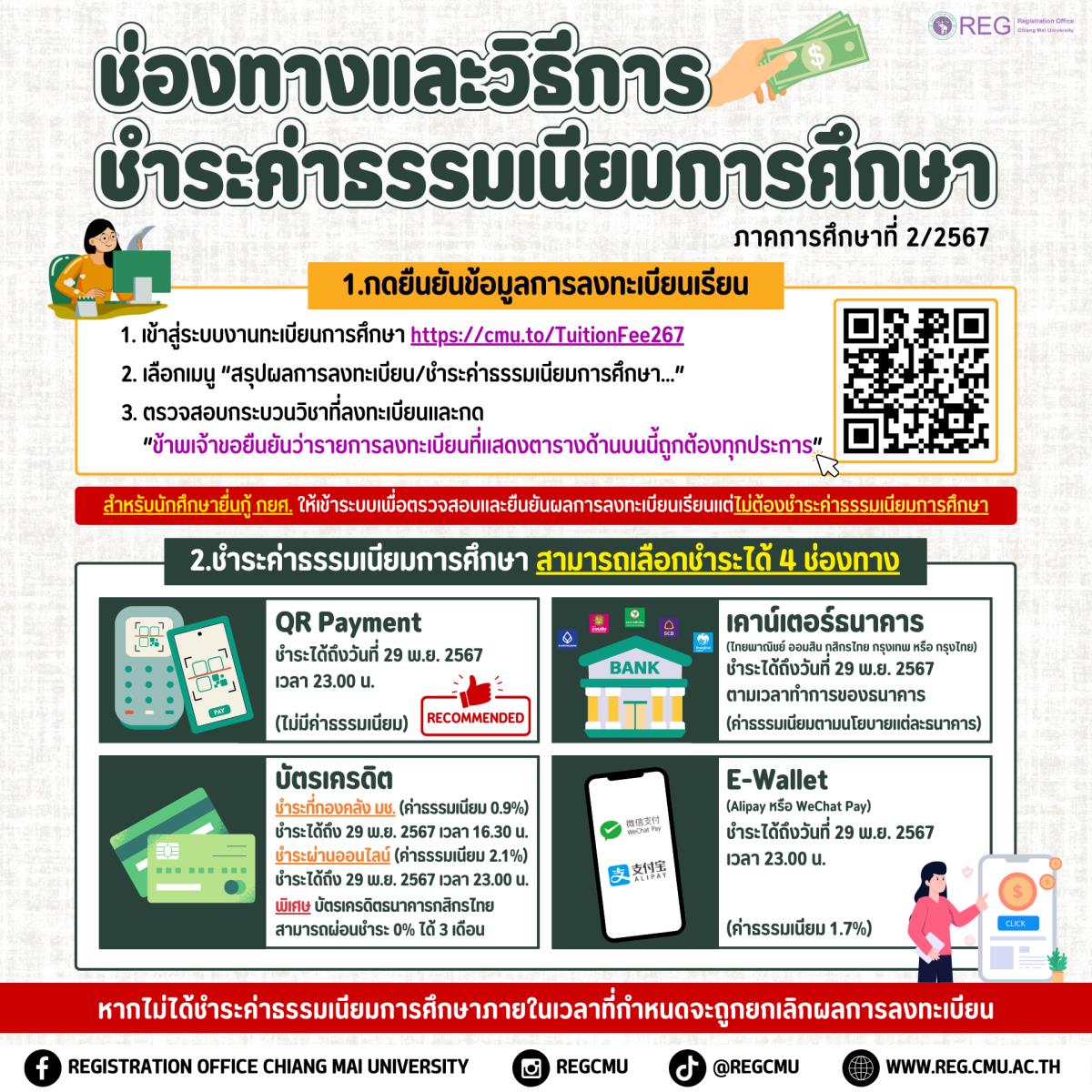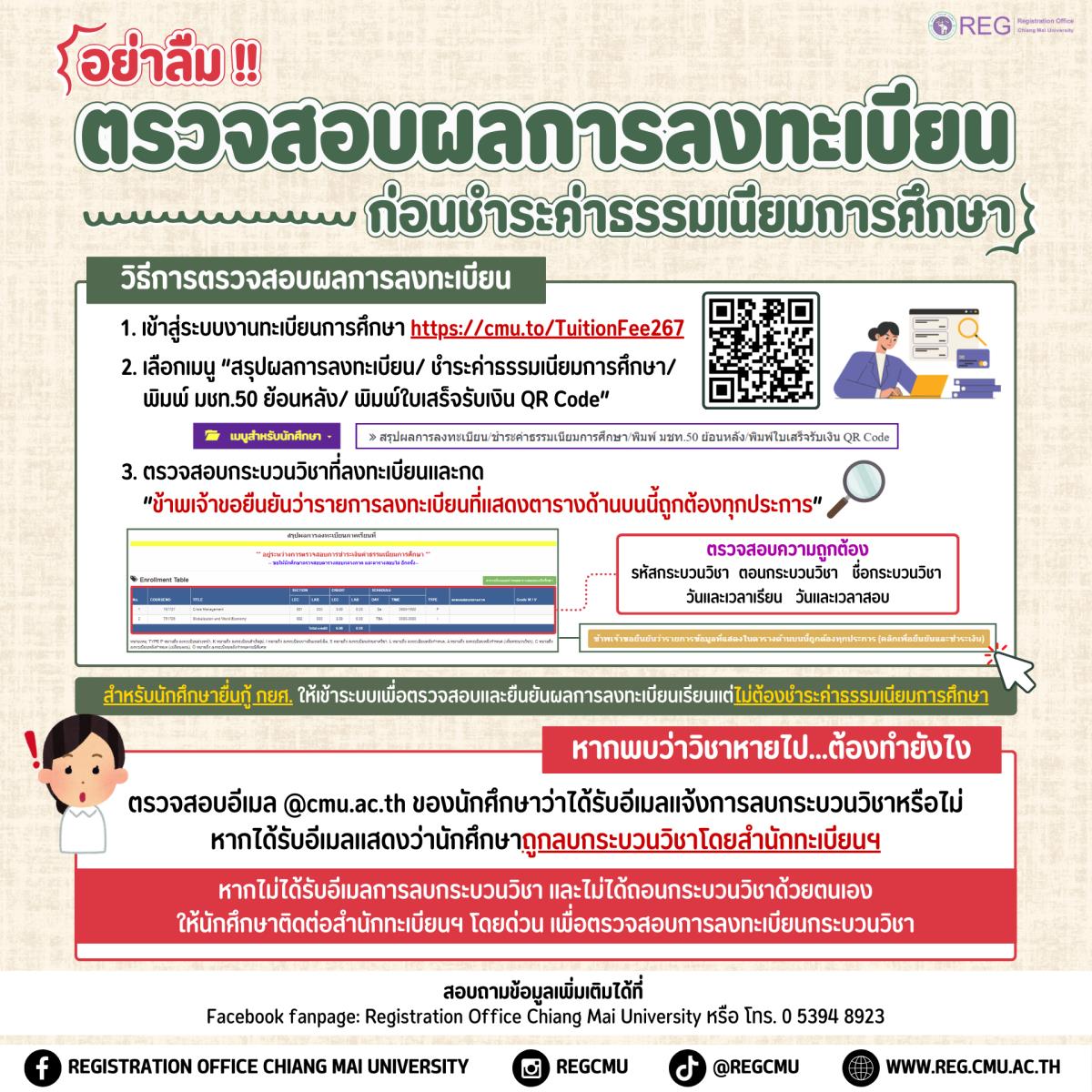 *นักศึกษากดยืนยันตรวจสอบข้อมูลลงทะเบียน หน้าสรุปผลการลงทะเบียนก่อนชำระเงิน ที่ https://cmu.to/TuitionFee267