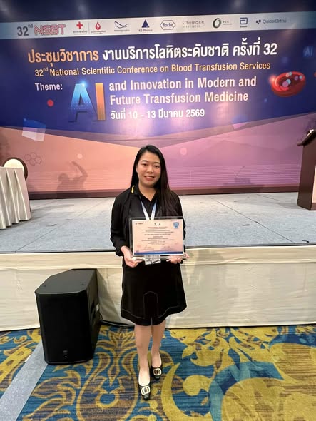 ทนพญ.ชลธิชา ศิริกุล นักเทคนิคการแพทย์ ประจำแขนงวิชาวิทยาศาสตร์การบริการโลหิต ภาควิชาเทคนิคการแพทย์ คณะเทคนิคการแพทย์ มหาวิทยาลัยเชียงใหม่ คว้ารางวัลชมเชย จากการนำเสนอผลงานโปสเตอร์ เรื่อง Improved ABO blood group Genotyping platform with enhanced data quality and SNP analysis ในงานประชุมวิชาการงานบริการโลหิตระดับชาติ ครั้งที่ 32 (32nd National Scientific Conference on Blood Transfusion Services: 32nd NSBT) ใน Theme : AI and innovation in modern and future Transfusion Medicine ที่จัดขึ้นระหว่างวันที่ 10 - 13 มีนาคม 2569 ณ ห้องประชุม Mayfair Grand Ballroom ชั้น 11 โรงแรม เดอะ เบอร์เคลีย์ ประตูน้ำ กรุงเทพมหานครฯ