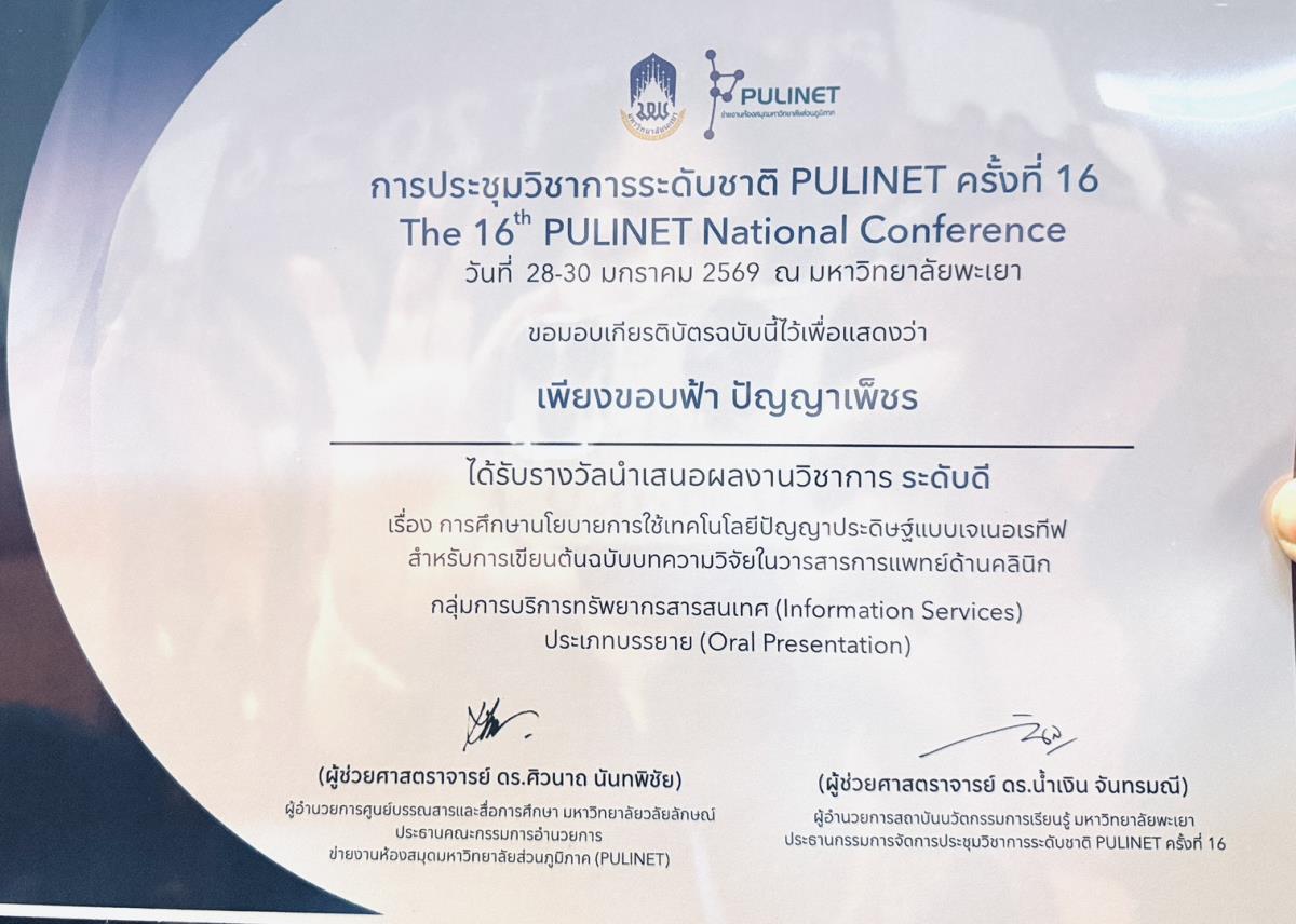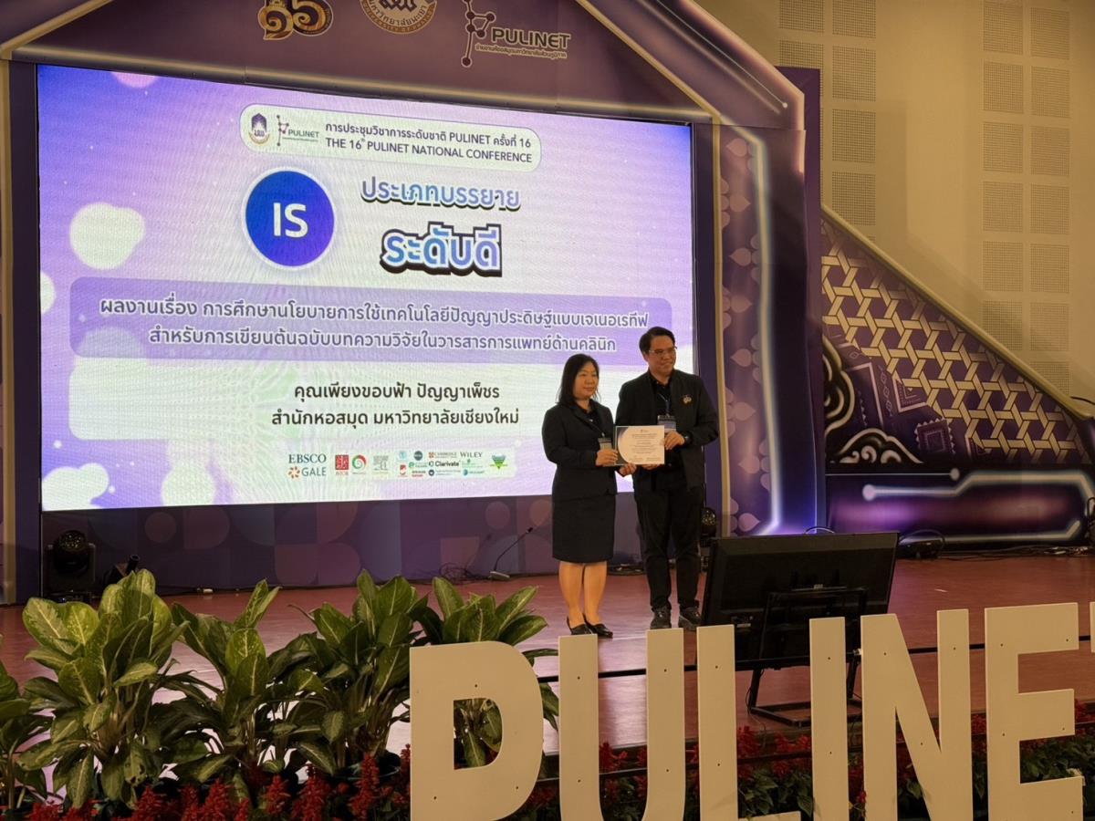 บุคลากรสำนักหอสมุด มหาวิทยาลัยเชียงใหม่ ได้รับรางวัลการนำเสนอผลงานวิชาการ ประเภทบรรยาย ระดับดี กลุ่มการบริการสารสนเทศ (Information Service : IS) เรื่อง "การศึกษานโยบายการใช้เทคโนโลยีปัญญาประดิษฐ์แบบเจเนอเรทีฟ สำหรับการเขียนต้นฉบับบทความวิจัยในวารสารการแพทย์ด้านคลินิก" โดย นางเพียงขอบฟ้า ปัญญาเพ็ชร หัวหน้างานห้องสมุดคณะแพทยศาสตร์ ในการประชุมวิชาการระดับชาติ PULINET ครั้งที่ 16 (The 16th PULINET National Conference-PULINET 2026) ภายใต้แนวคิด "Innovative Learning: Library for All" จัดโดย สถาบันนวัตกรรมการเรียนรู้ ร่วมกับข่ายงานห้องสมุดมหาวิทยาลัยส่วนภูมิภาค (PULINET) ณ อาคาร 99 ปี พระอุบาลีคุณูปมาจารย์ (ปวง ธมมปญฺโญ) มหาวิทยาลัยพะเยา จังหวัดพะเยา ระหว่างวันที่ 28 - 30 มกราคม พ.ศ. 2569