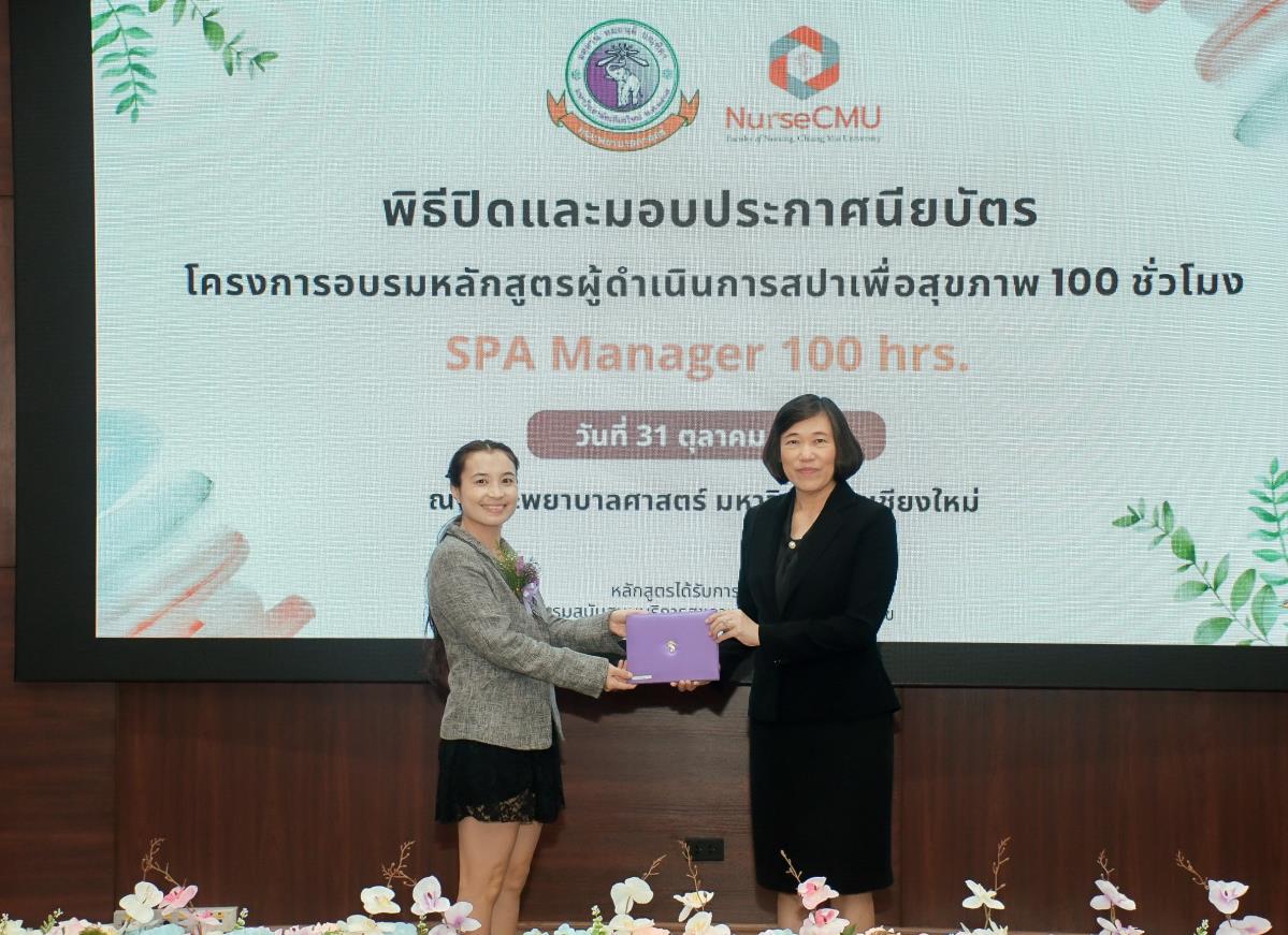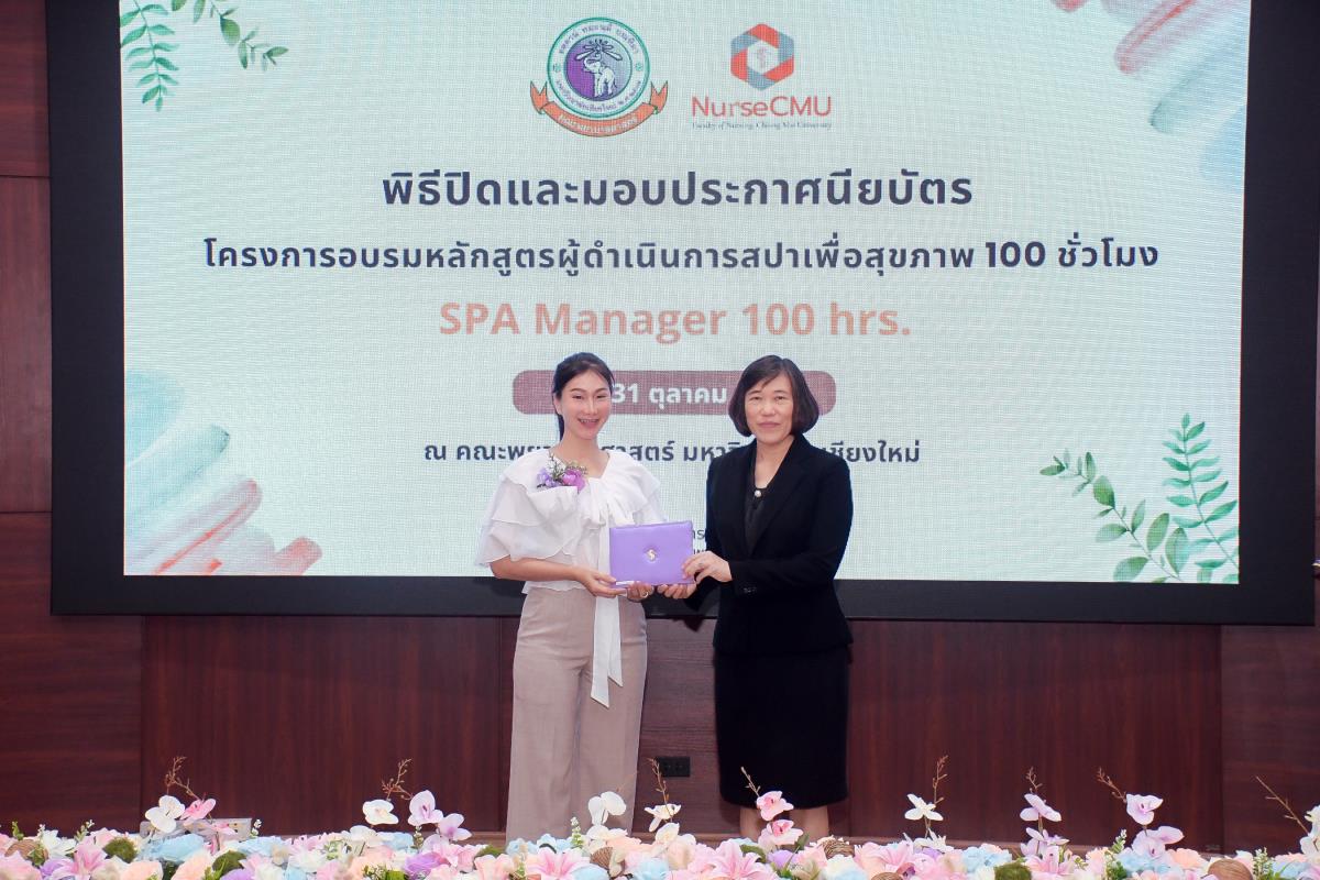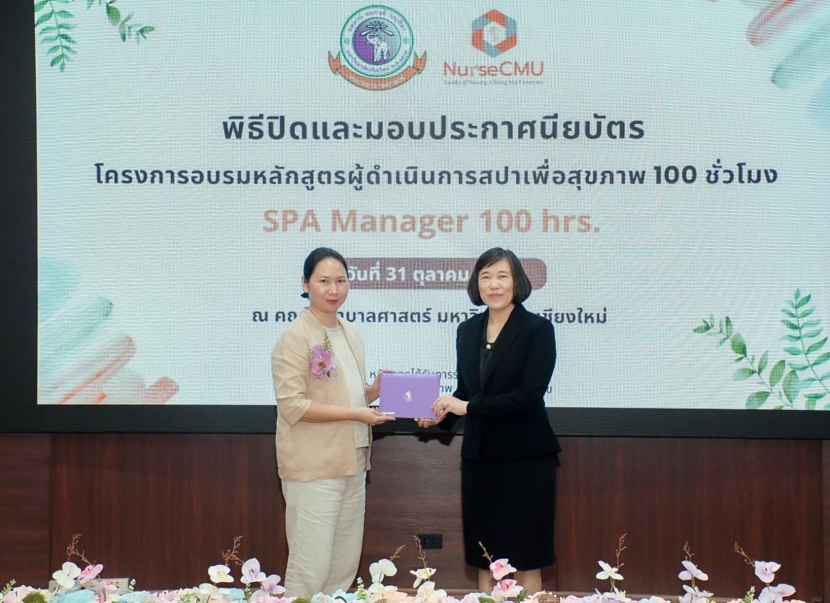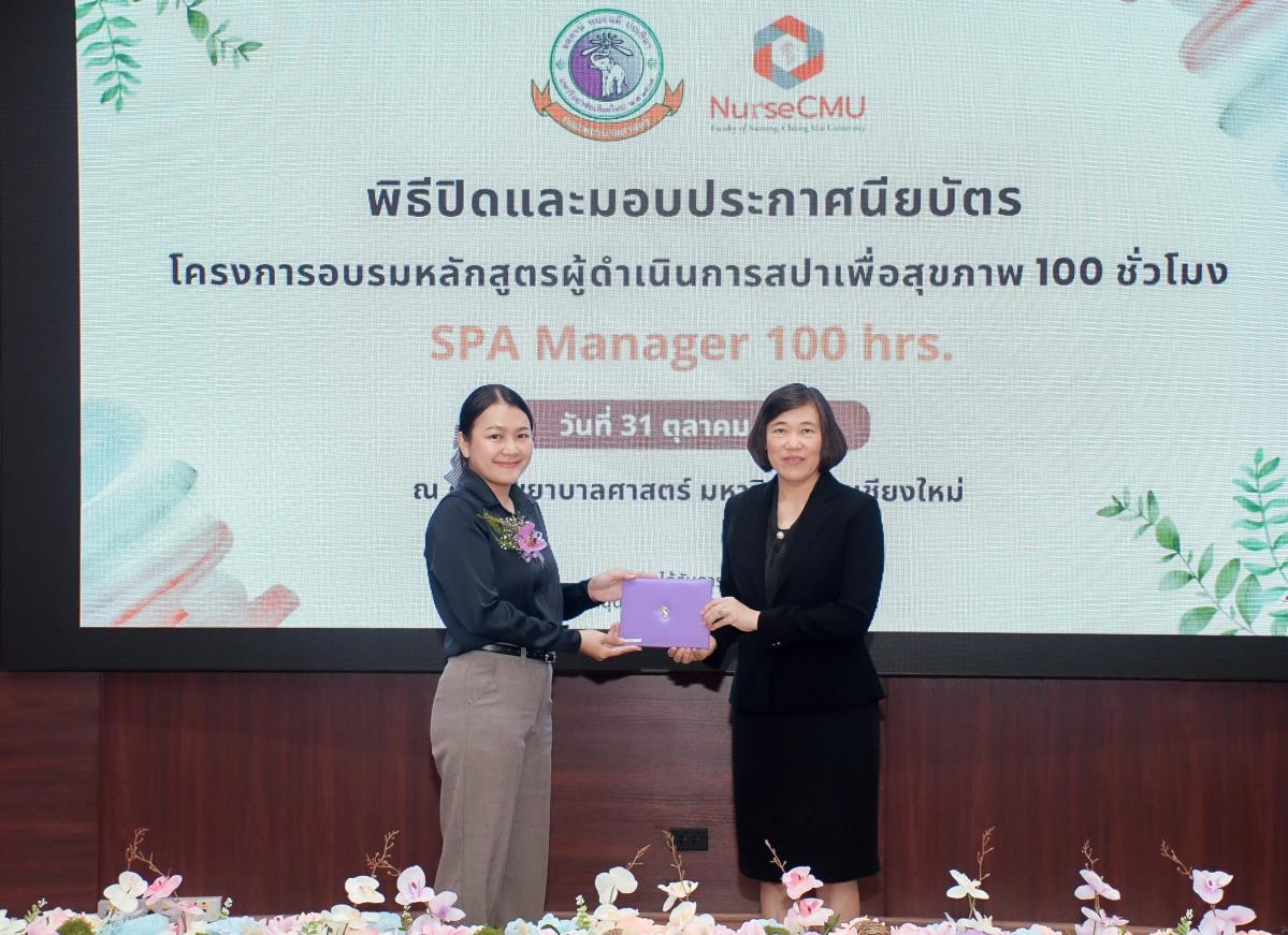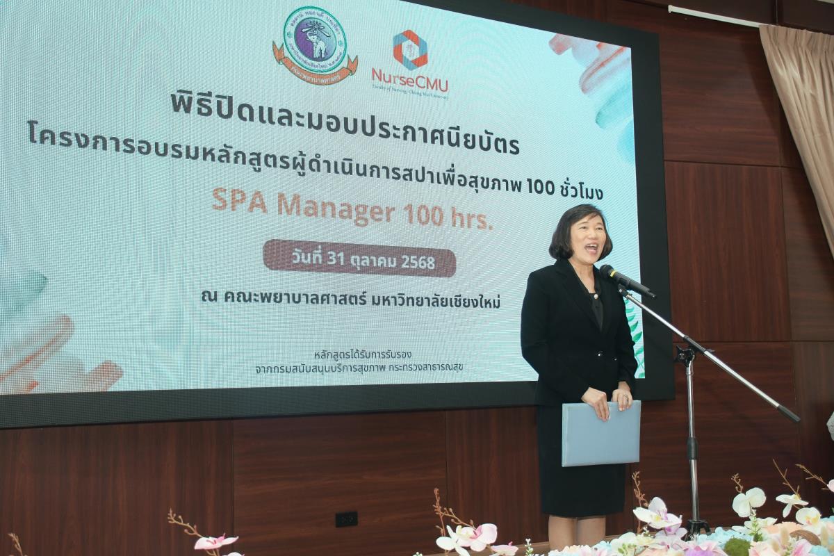 ในวันศุกร์ที่ 31 ตุลาคม 2568 ผู้ช่วยศาสตราจารย์ ดร.สุภารัตน์ วังศรีคูณ คณบดีคณะพยาบาลศาสตร์ มหาวิทยาลัยเชียงใหม่ เป็นประธานในพิธีปิดและมอบประกาศนียบัตรการอบรมหลักสูตรผู้ดำเนินการสปาเพื่อสุขภาพ (Spa Manager) จำนวน 100 ชั่วโมง ประจำปี 2568 โดยมี รองศาสตราจารย์ ดร.พนิดา จันทโสภีพันธ์ รองคณบดีคณะพยาบาลศาสตร์ กล่าวรายงาน ณ ห้องประชุมชั้น 5 อาคาร 4
