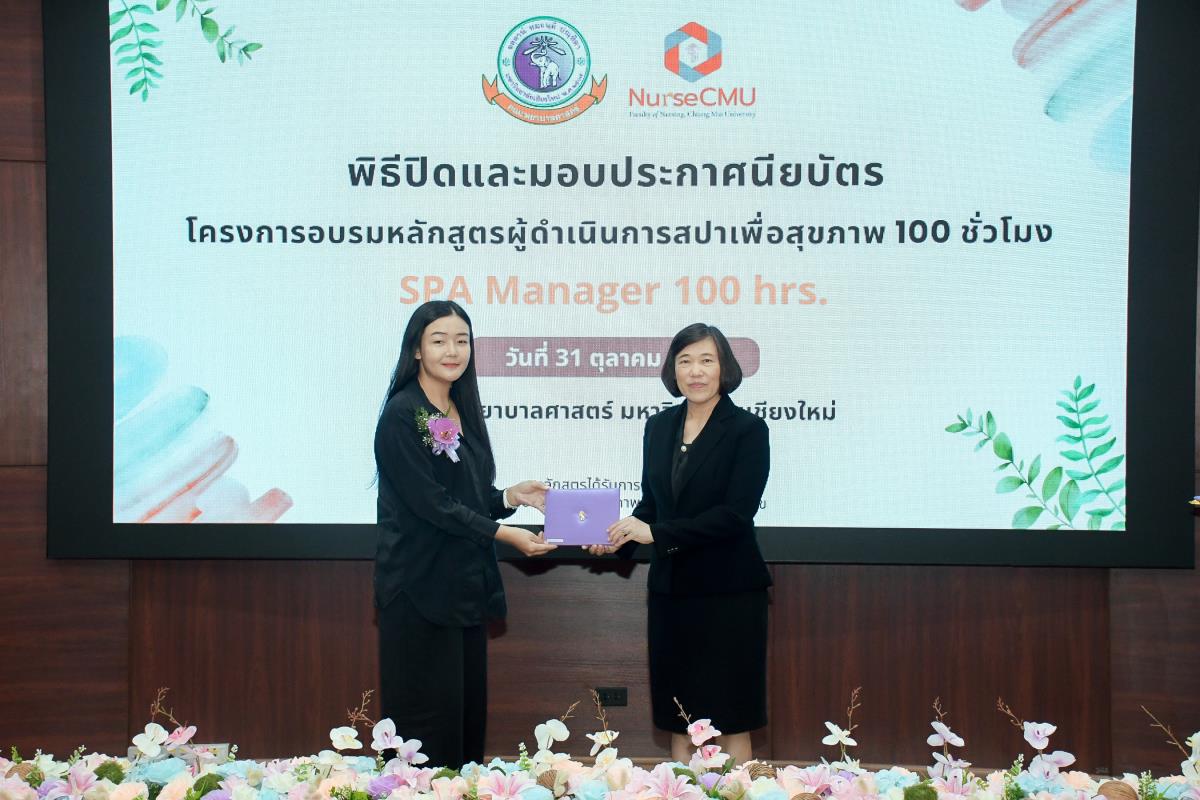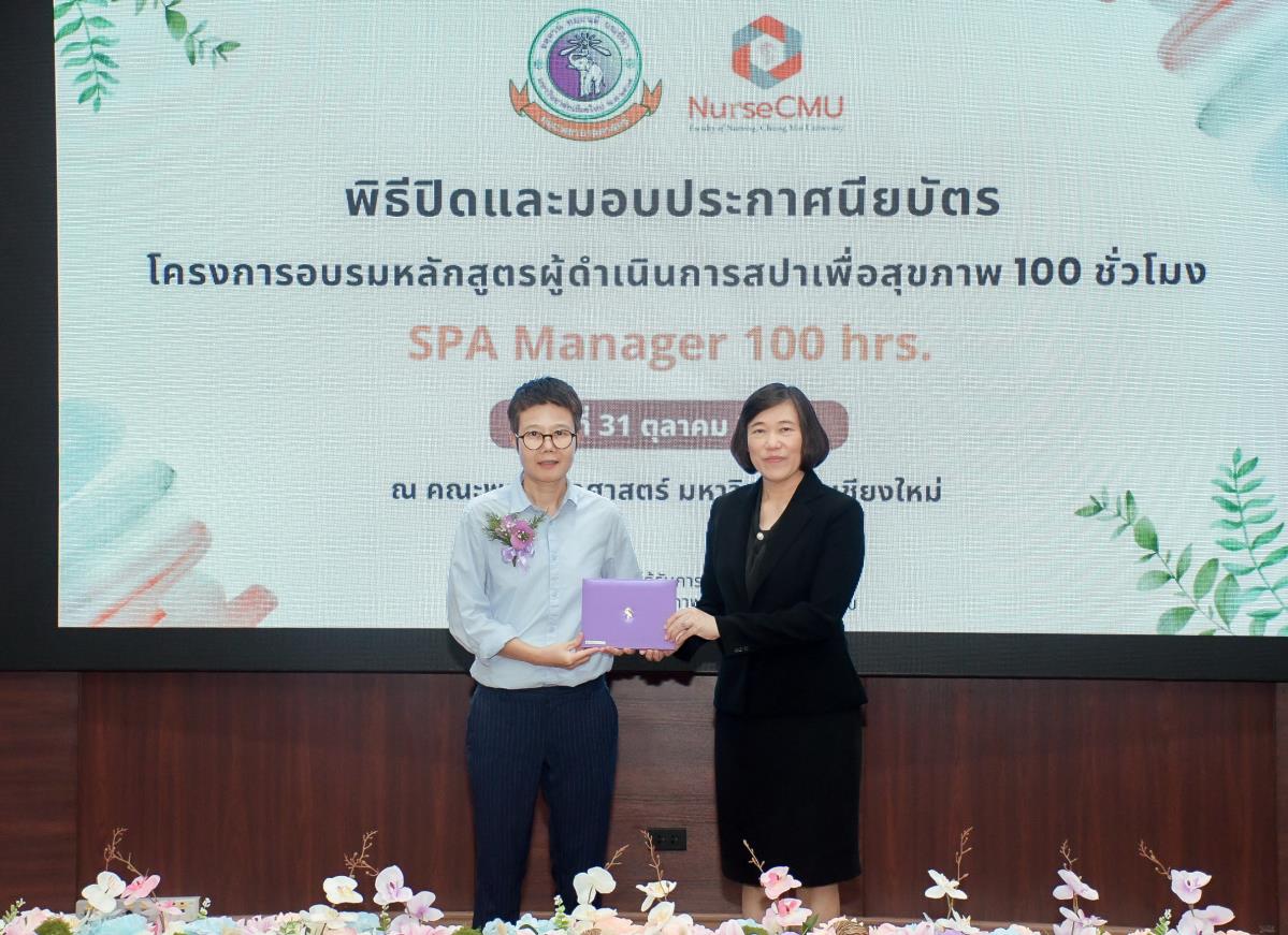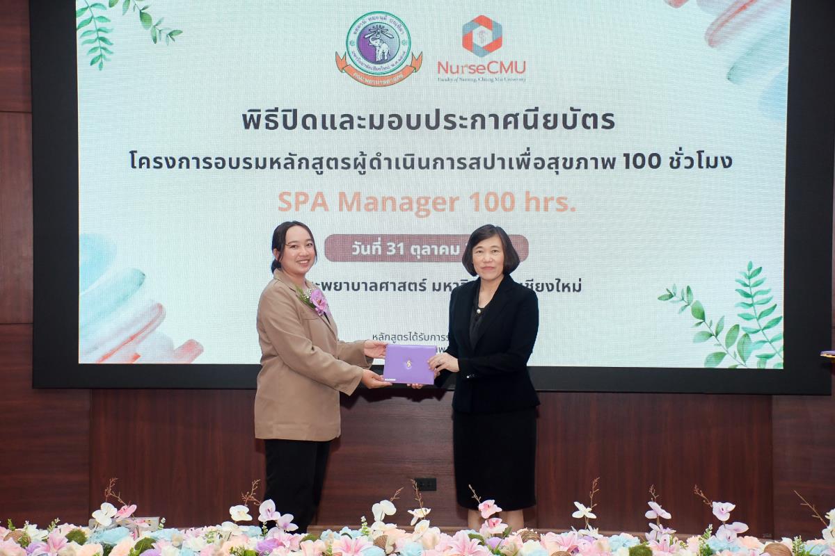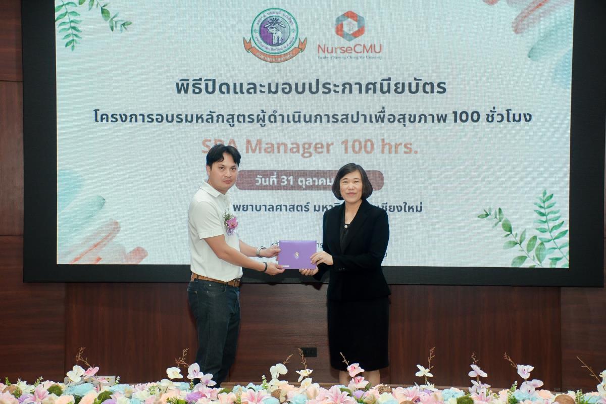 ในวันศุกร์ที่ 31 ตุลาคม 2568 ผู้ช่วยศาสตราจารย์ ดร.สุภารัตน์ วังศรีคูณ คณบดีคณะพยาบาลศาสตร์ มหาวิทยาลัยเชียงใหม่ เป็นประธานในพิธีปิดและมอบประกาศนียบัตรการอบรมหลักสูตรผู้ดำเนินการสปาเพื่อสุขภาพ (Spa Manager) จำนวน 100 ชั่วโมง ประจำปี 2568 โดยมี รองศาสตราจารย์ ดร.พนิดา จันทโสภีพันธ์ รองคณบดีคณะพยาบาลศาสตร์ กล่าวรายงาน ณ ห้องประชุมชั้น 5 อาคาร 4