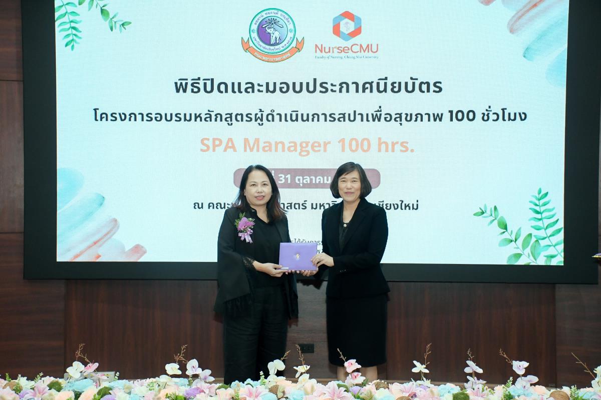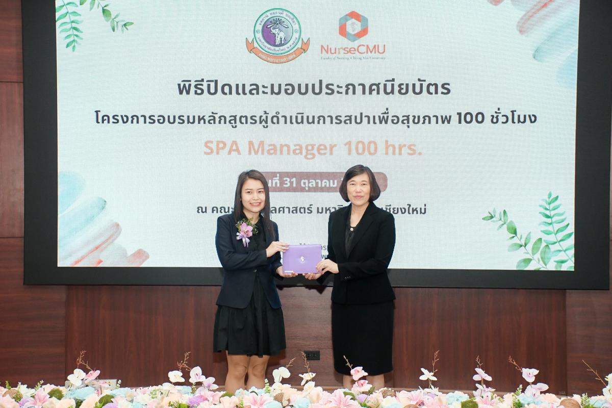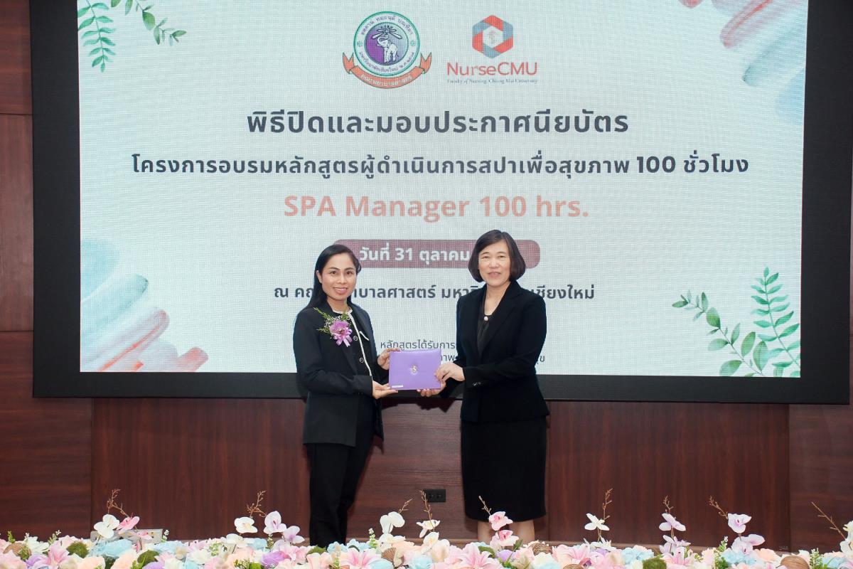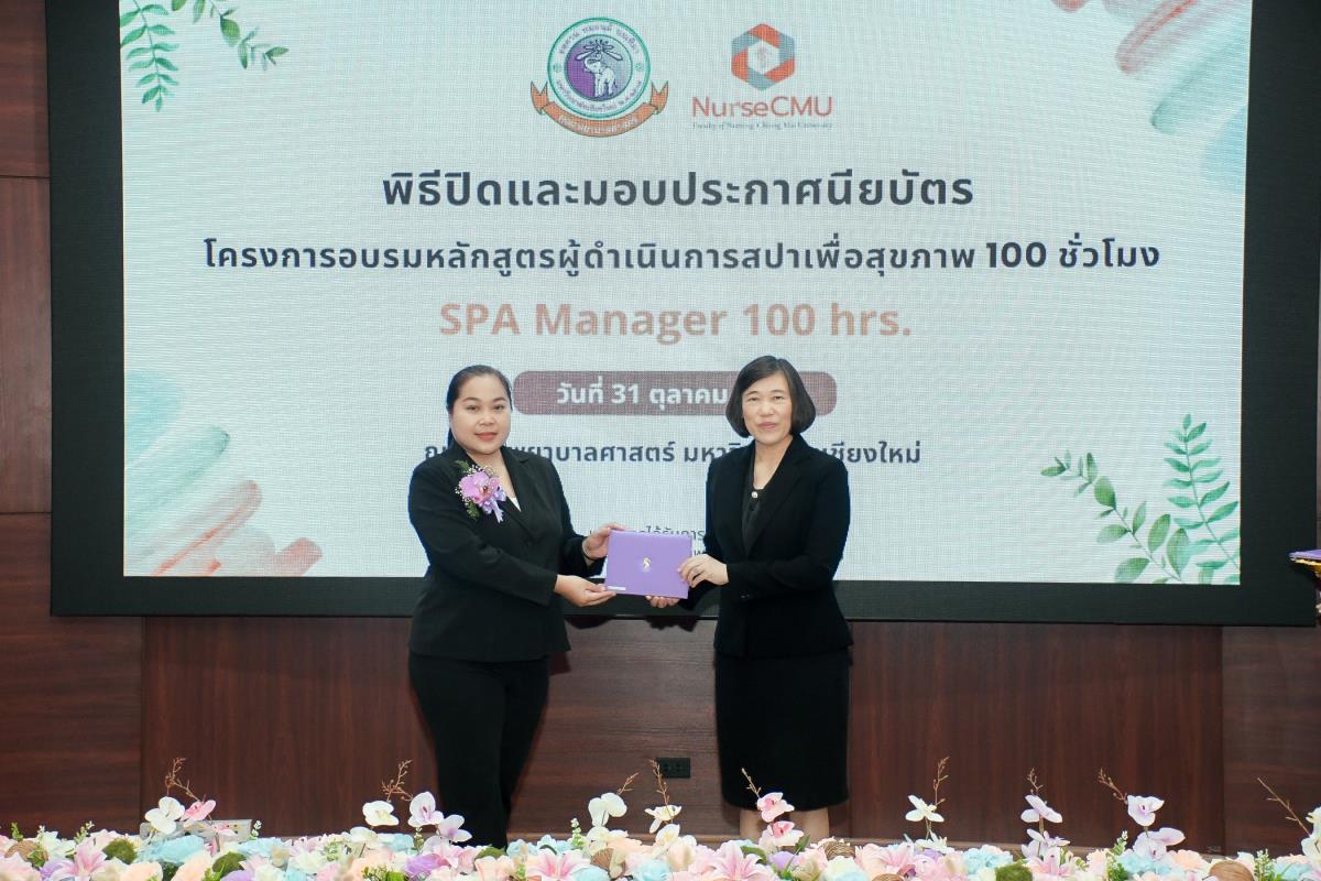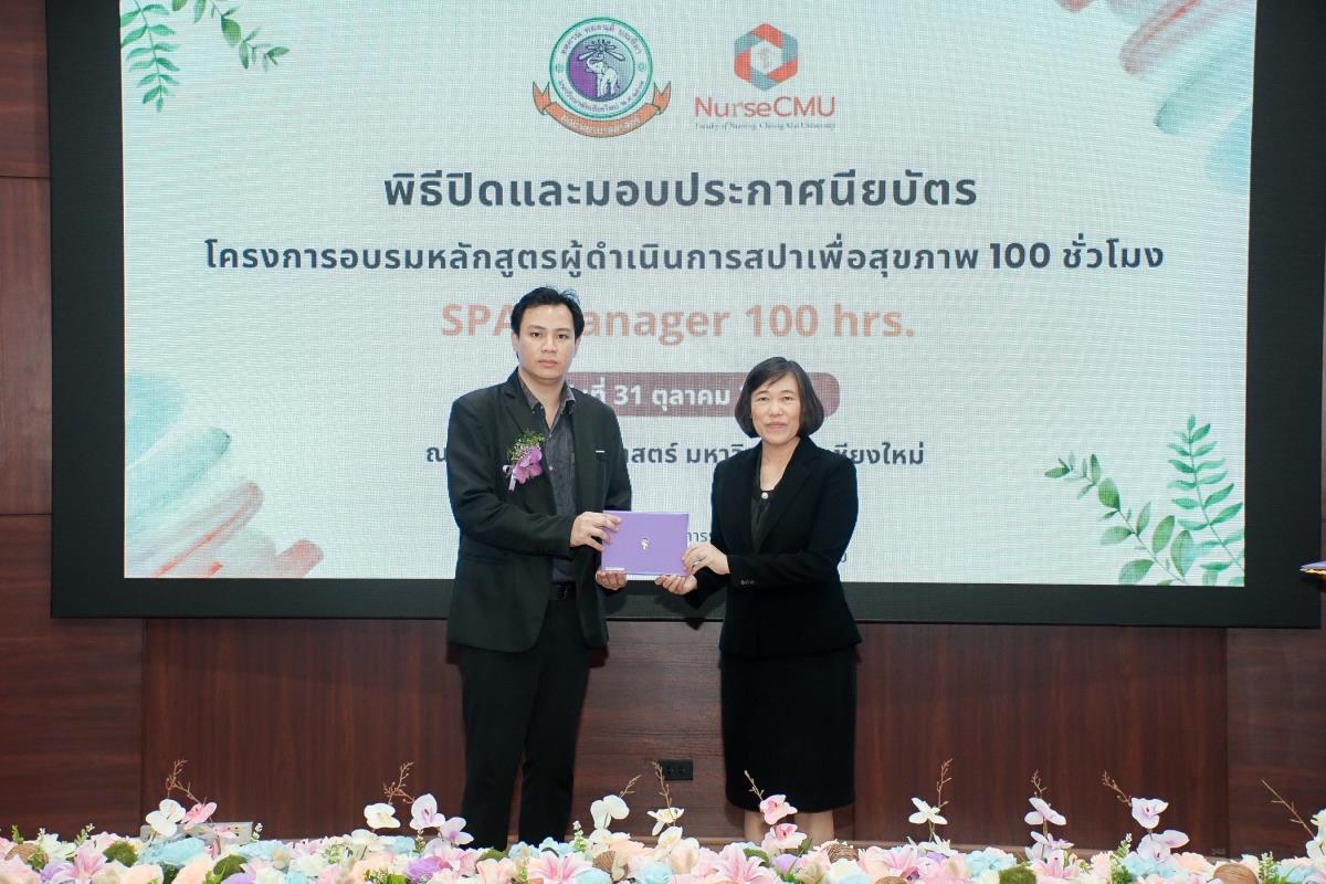 ในวันศุกร์ที่ 31 ตุลาคม 2568 ผู้ช่วยศาสตราจารย์ ดร.สุภารัตน์ วังศรีคูณ คณบดีคณะพยาบาลศาสตร์ มหาวิทยาลัยเชียงใหม่ เป็นประธานในพิธีปิดและมอบประกาศนียบัตรการอบรมหลักสูตรผู้ดำเนินการสปาเพื่อสุขภาพ (Spa Manager) จำนวน 100 ชั่วโมง ประจำปี 2568 โดยมี รองศาสตราจารย์ ดร.พนิดา จันทโสภีพันธ์ รองคณบดีคณะพยาบาลศาสตร์ กล่าวรายงาน ณ ห้องประชุมชั้น 5 อาคาร 4