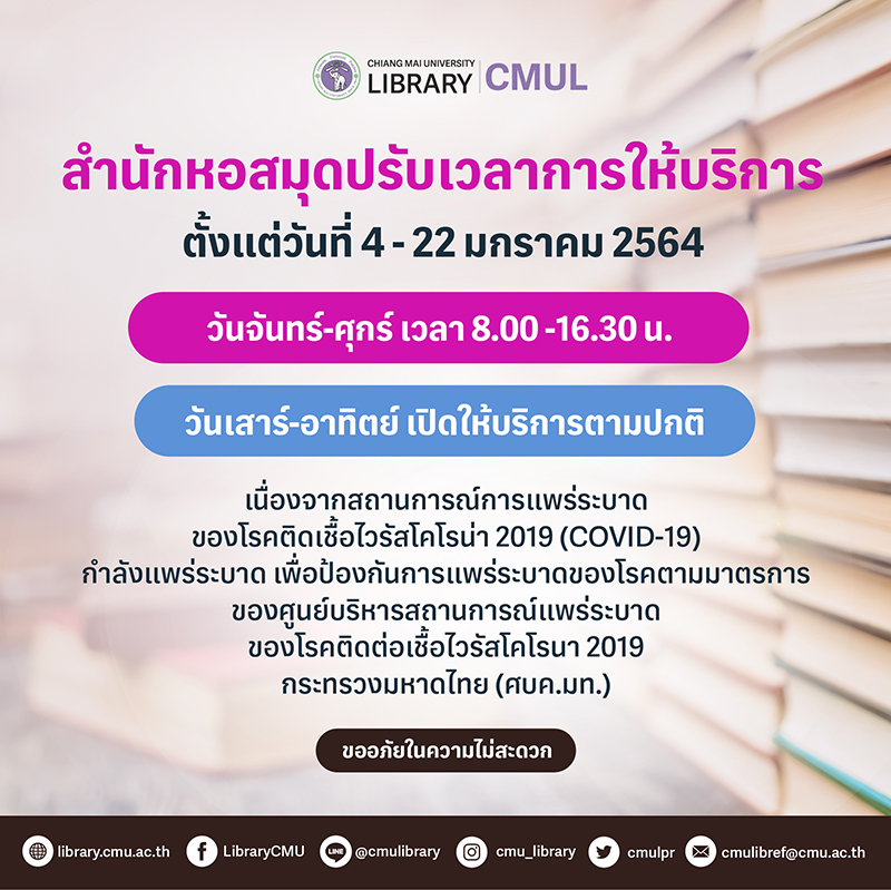 สำนักหอสมุดปรับเวลาการให้บริการ ตั้งแต่วันที่ 4 - 22 มกราคม 2564 ในวันจันทร์-ศุกร์ เวลา 8.00 -16.30 น. และวันเสาร์-อาทิตย์ เปิดให้บริการตามปกติ เนื่องจากสถานการณ์การแพร่ระบาดของโรคติดเชื้อไวรัสโคโรน่า 2019 (COVID-19) กำลังแพร่ระบาด เพื่อป้องกันการแพร่ระบาดของโรคตามมาตรการของศูนย์บริหารสถานการณ์แพร่ระบาดของโรคติดต่อเชื้อไวรัสโคโรนา 2019 กระทรวงมหาดไทย (ศบค.มท.)