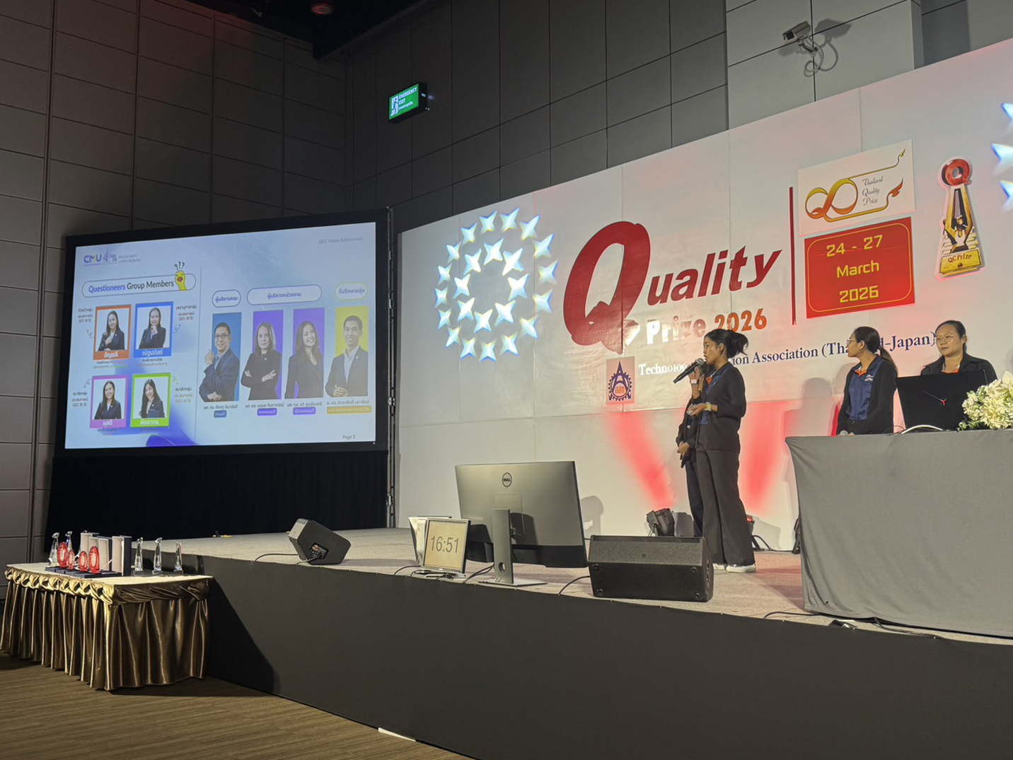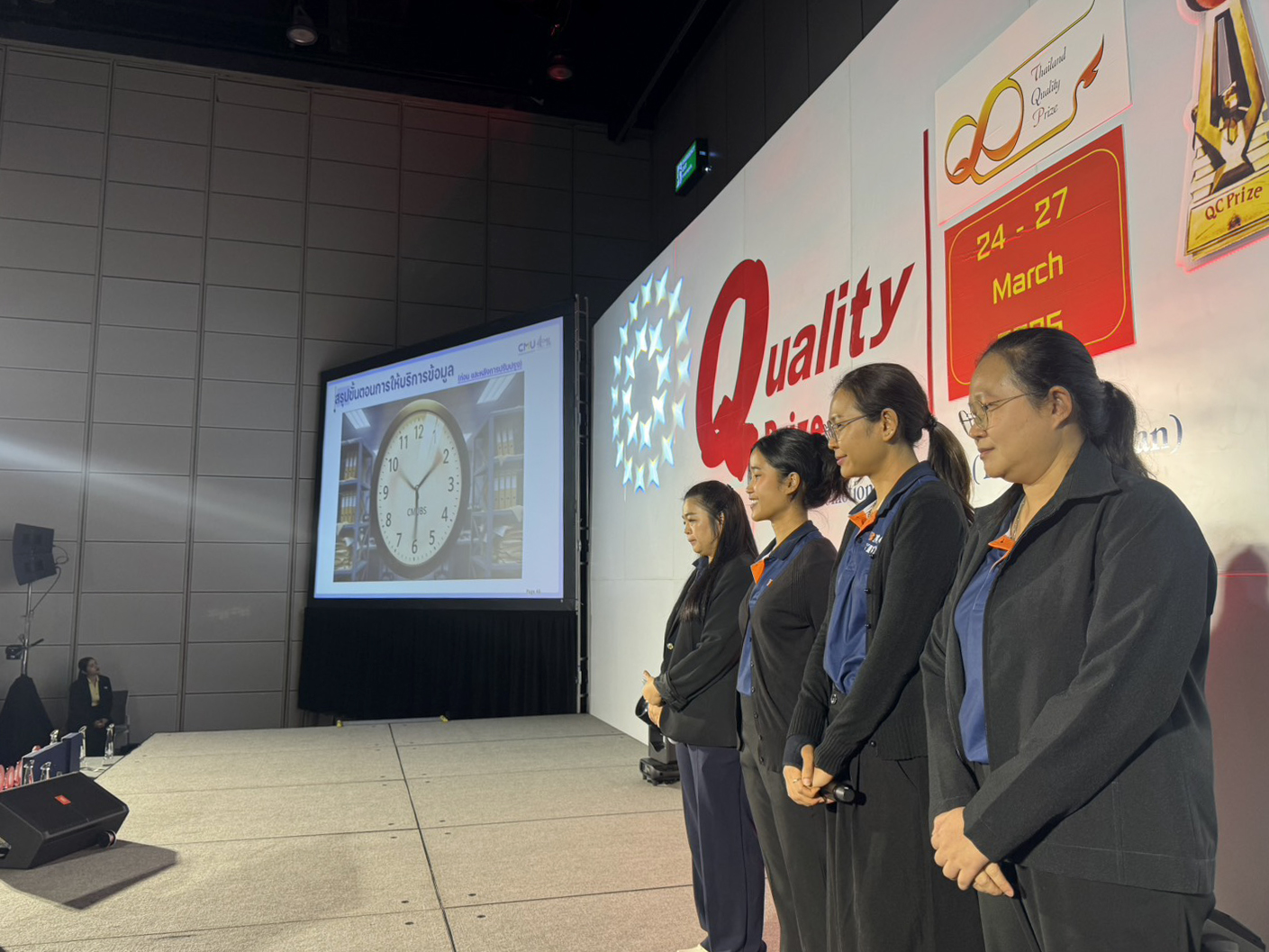 ในการแข่งขันครั้งนี้ ผศ. ดร.สายนที เฉินบำรุง รองคณบดีคณะบริหารธุรกิจ ให้เกียรติในนามผู้บริหารคณะฯ ขึ้นเวทีนำเสนอภาพรวมการพัฒนาระบบ QCC ของคณะ พร้อมแนะนำทีม “Questioneers” นำโดยคุณอัญชลี วิเลิศศักดิ์ และสมาชิกทีม ได้แก่ คุณณัฐปภัสร์ บวรภัสพงศ์ คุณผุสดี ใจชุ่มใจ และคุณพิชชากร เกตุเนียม ก่อนร่วมกันนำเสนอผลงานหัวข้อ “เพิ่มประสิทธิภาพการให้ข้อมูล กฎระเบียบ และข้อบังคับด้านงานวิจัย คณะบริหารธุรกิจ มหาวิทยาลัยเชียงใหม่” ซึ่งแสดงให้เห็นถึงการนำเทคโนโลยีสารสนเทศมาพัฒนากระบวนการทำงานอย่างเป็นรูปธรรม