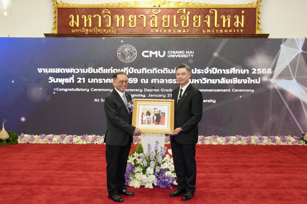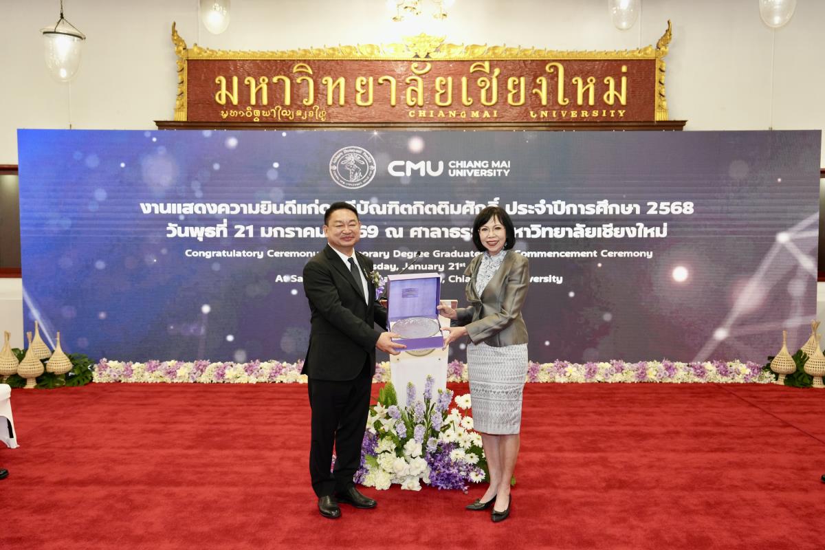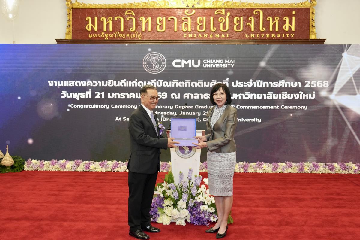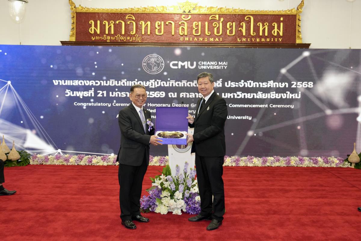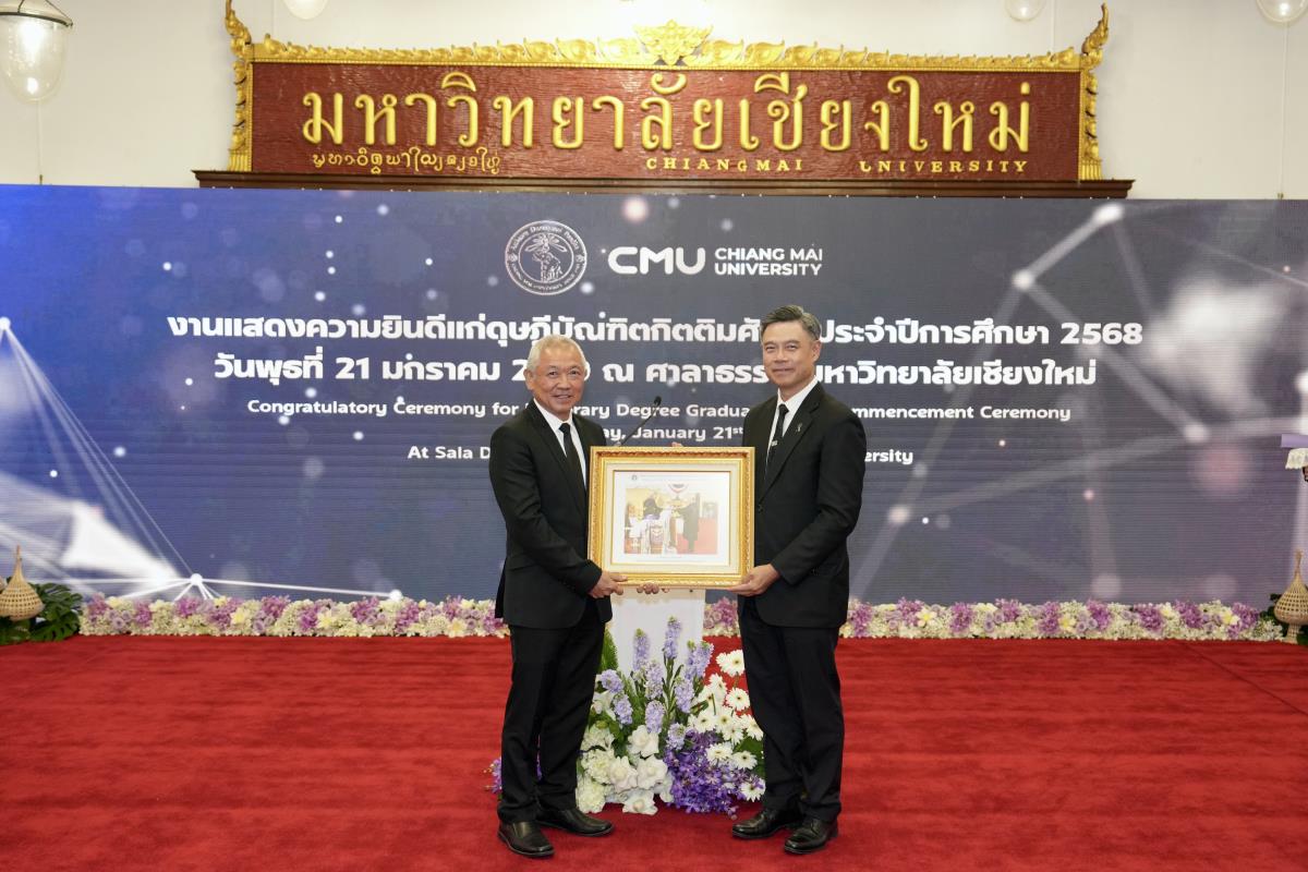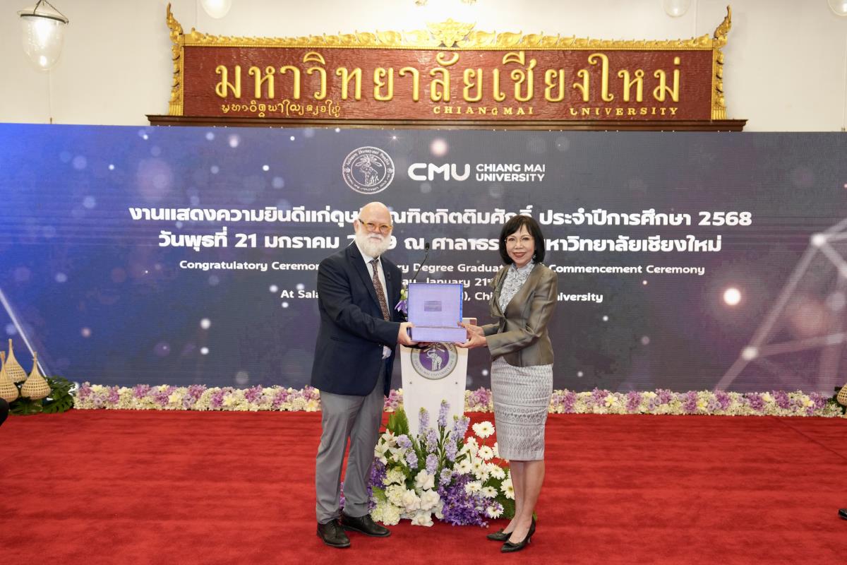 มหาวิทยาลัยเชียงใหม่ จัดงานแสดงความยินดีผู้ที่ได้รับพระราชทานปริญญากิตติมศักดิ์ ในงานพิธีพระราชทานปริญญาบัตร ครั้งที่ 60 ประจำปีการศึกษา 2567-2568 โดยมีศาสตราจารย์พิเศษ ดร.สุรเกียรติ์ เสถียรไทย นายกสภามหาวิทยาลัยเชียงใหม่ กล่าวแสดงความยินดี มอบเกียรติบัตร และมอบดอกไม้ ศาสตราจารย์ ดร.นพ.พงษ์รักษ์ ศรีบัณฑิตมงคล อธิการบดีมหาวิทยาลัยเชียงใหม่ มอบภาพถ่ายฯ พร้อมด้วย นายสุมิตร เพชราภิรัชต์ นายกสมาคมนักศึกษาเก่ามหาวิทยาลัยเชียงใหม่ คุณนารีรัตน์ จันทรมังกร ประธานกรรมการส่งเสริมมหาวิทยาลัยเชียงใหม่ มอบของที่ระลึก แก่ผู้ที่ได้รับพระราชทานปริญญากิตติมศักดิ์ ณ ศาลาธรรม มหาวิทยาลัยเชียงใหม่ เมื่อวันพุธที่ 21 มกราคม 2569