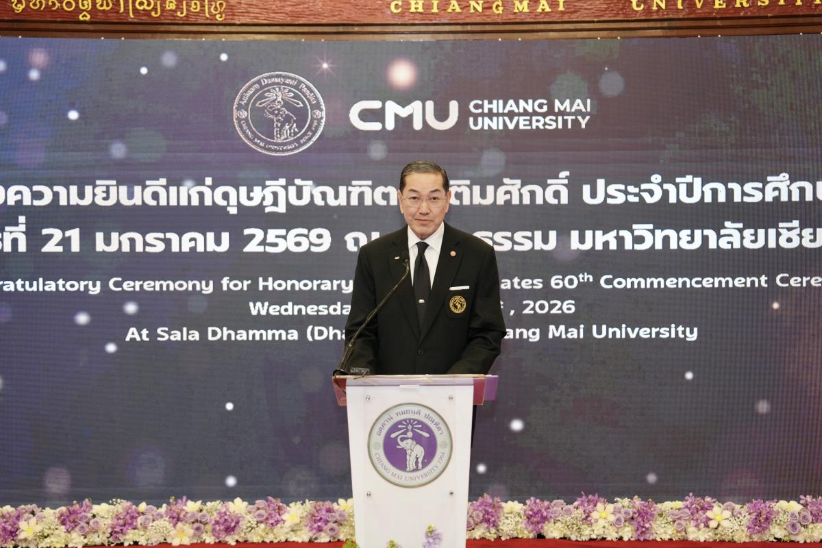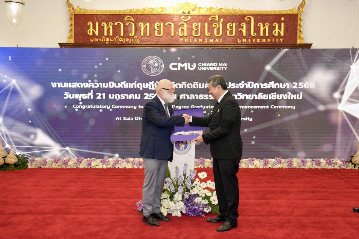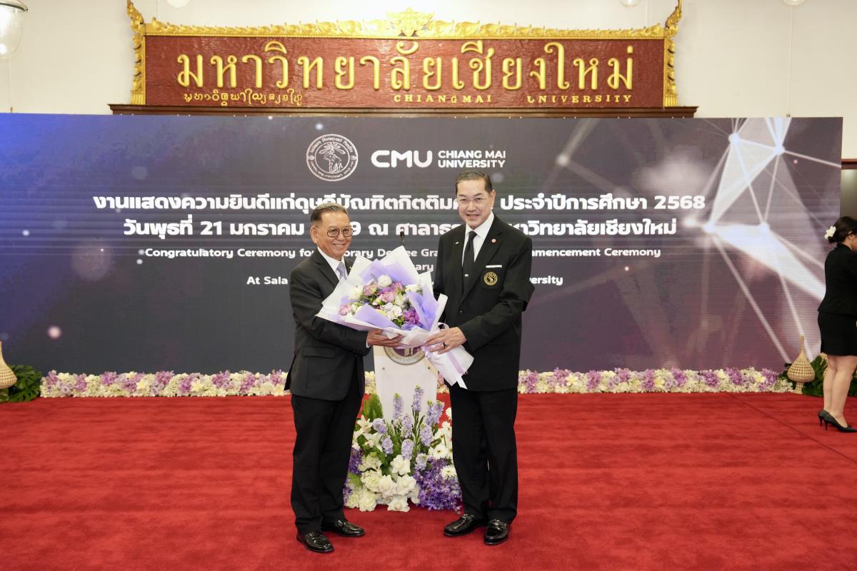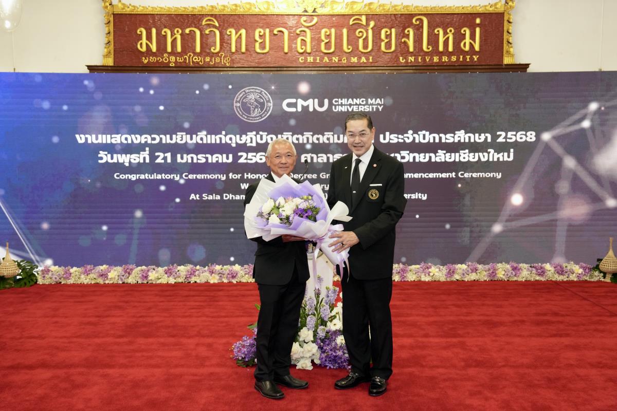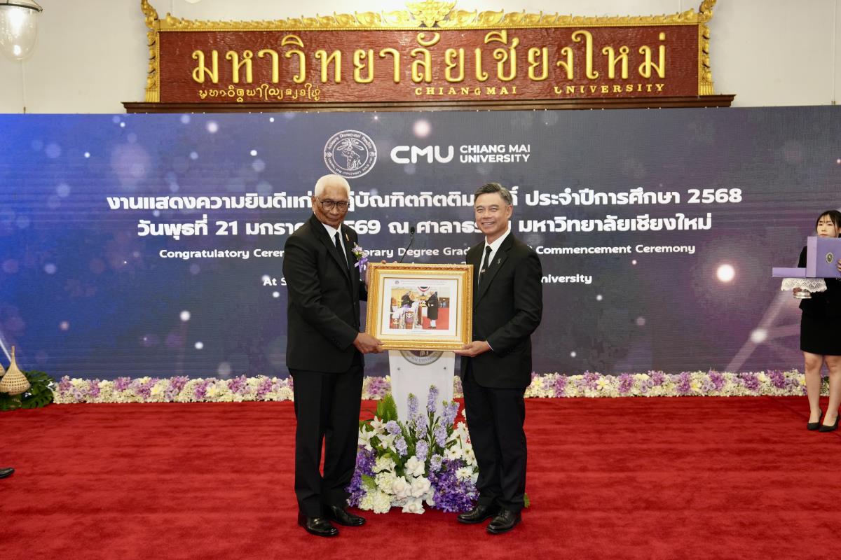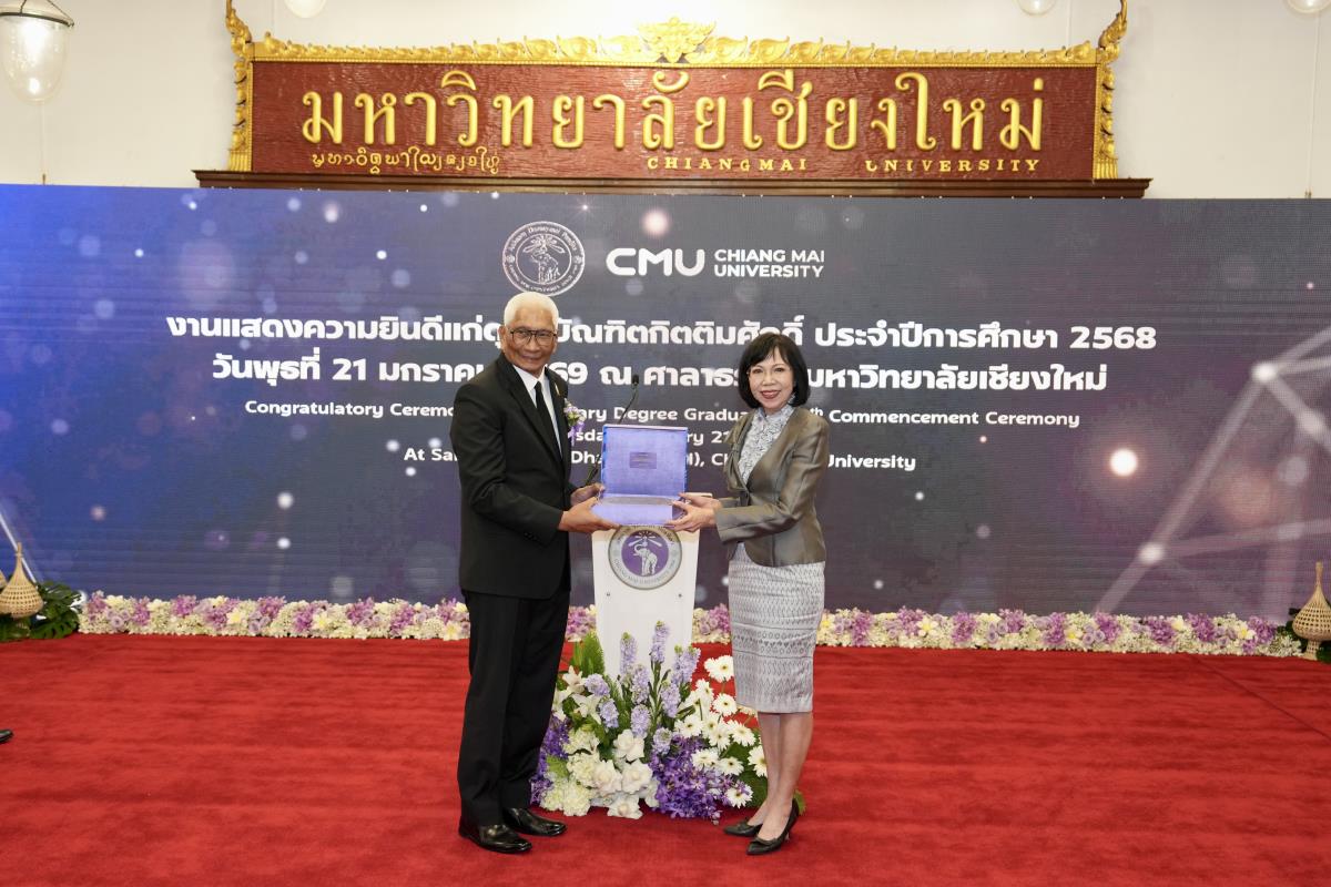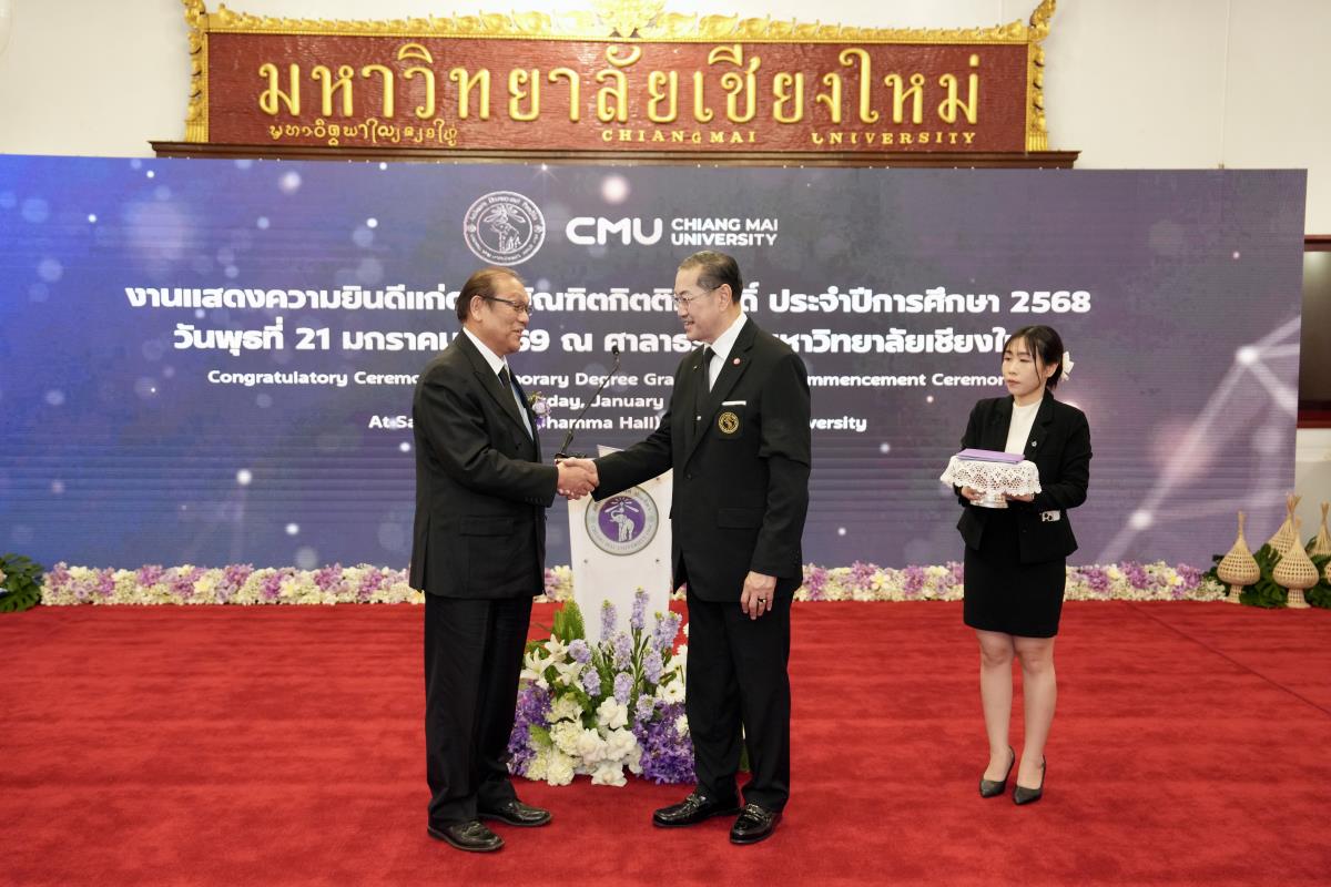 มหาวิทยาลัยเชียงใหม่ จัดงานแสดงความยินดีผู้ที่ได้รับพระราชทานปริญญากิตติมศักดิ์ ในงานพิธีพระราชทานปริญญาบัตร ครั้งที่ 60 ประจำปีการศึกษา 2567-2568 โดยมีศาสตราจารย์พิเศษ ดร.สุรเกียรติ์ เสถียรไทย นายกสภามหาวิทยาลัยเชียงใหม่ กล่าวแสดงความยินดี มอบเกียรติบัตร และมอบดอกไม้ ศาสตราจารย์ ดร.นพ.พงษ์รักษ์ ศรีบัณฑิตมงคล อธิการบดีมหาวิทยาลัยเชียงใหม่ มอบภาพถ่ายฯ พร้อมด้วย นายสุมิตร เพชราภิรัชต์ นายกสมาคมนักศึกษาเก่ามหาวิทยาลัยเชียงใหม่ คุณนารีรัตน์ จันทรมังกร ประธานกรรมการส่งเสริมมหาวิทยาลัยเชียงใหม่ มอบของที่ระลึก แก่ผู้ที่ได้รับพระราชทานปริญญากิตติมศักดิ์ ณ ศาลาธรรม มหาวิทยาลัยเชียงใหม่ เมื่อวันพุธที่ 21 มกราคม 2569