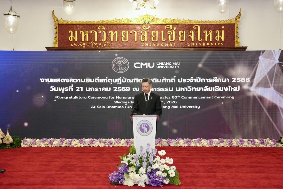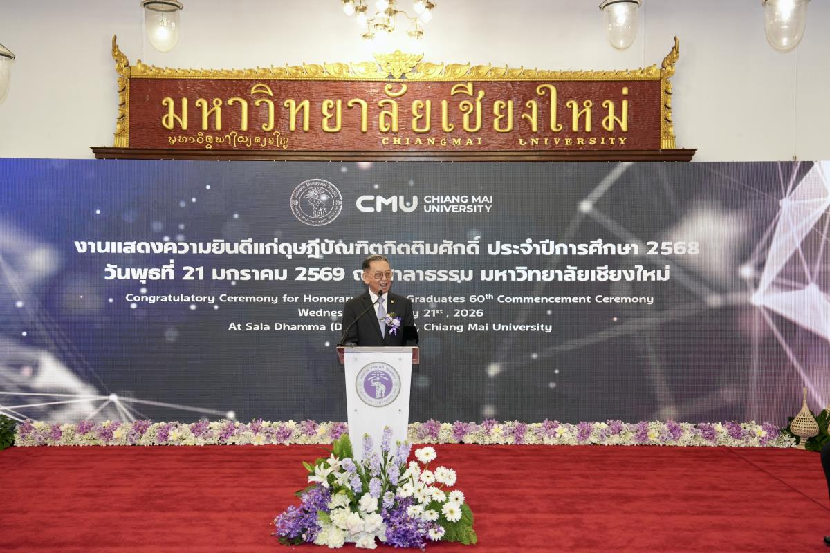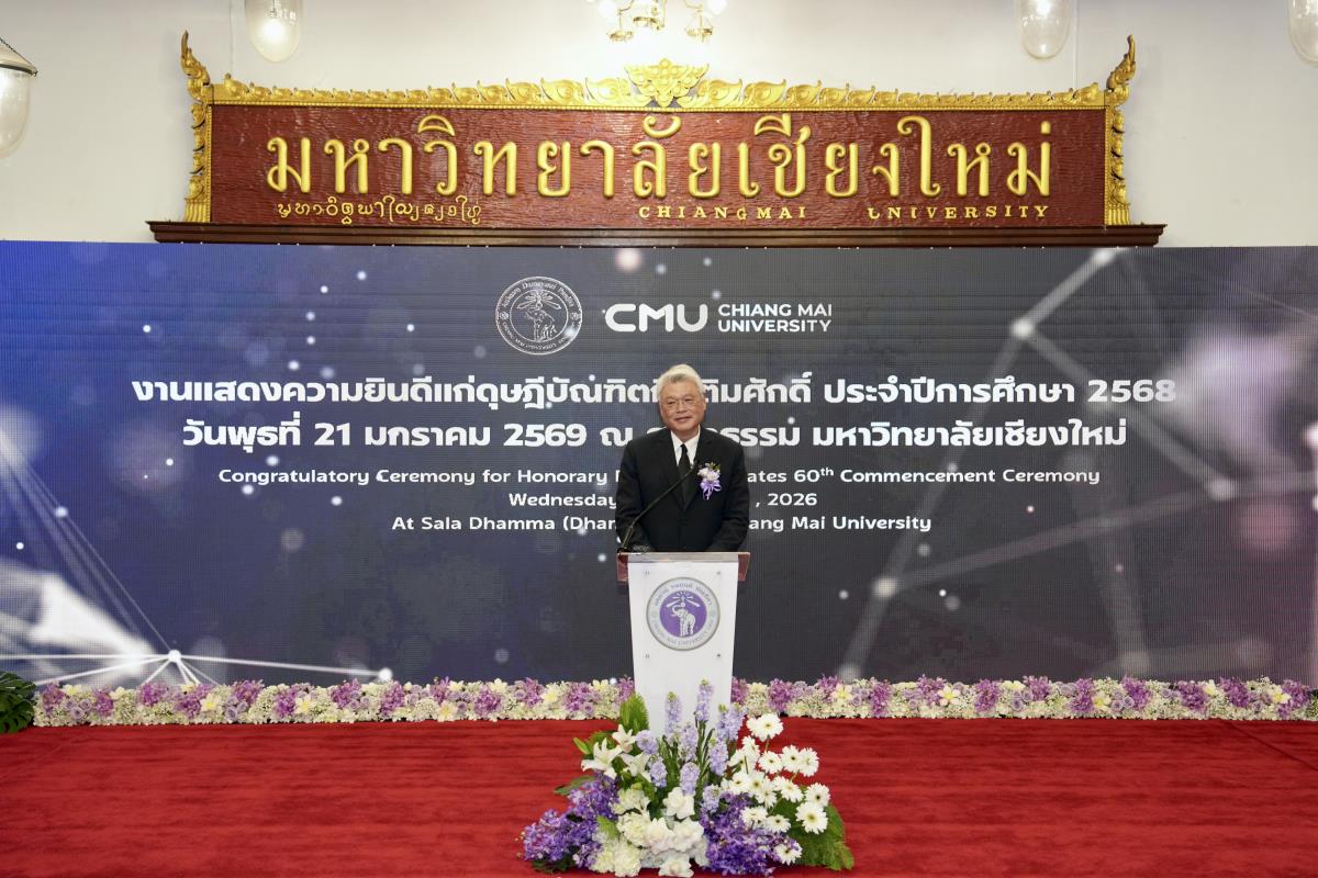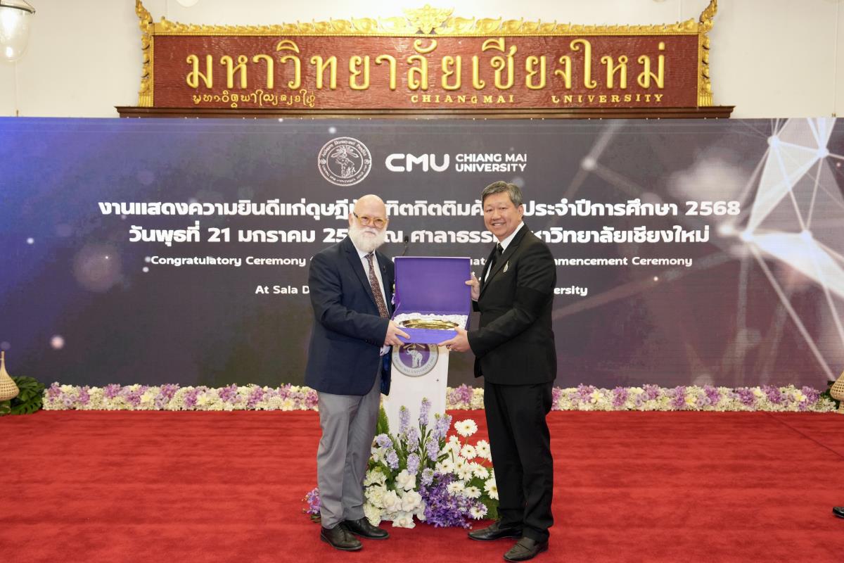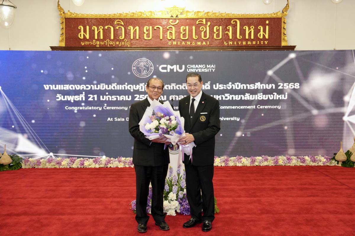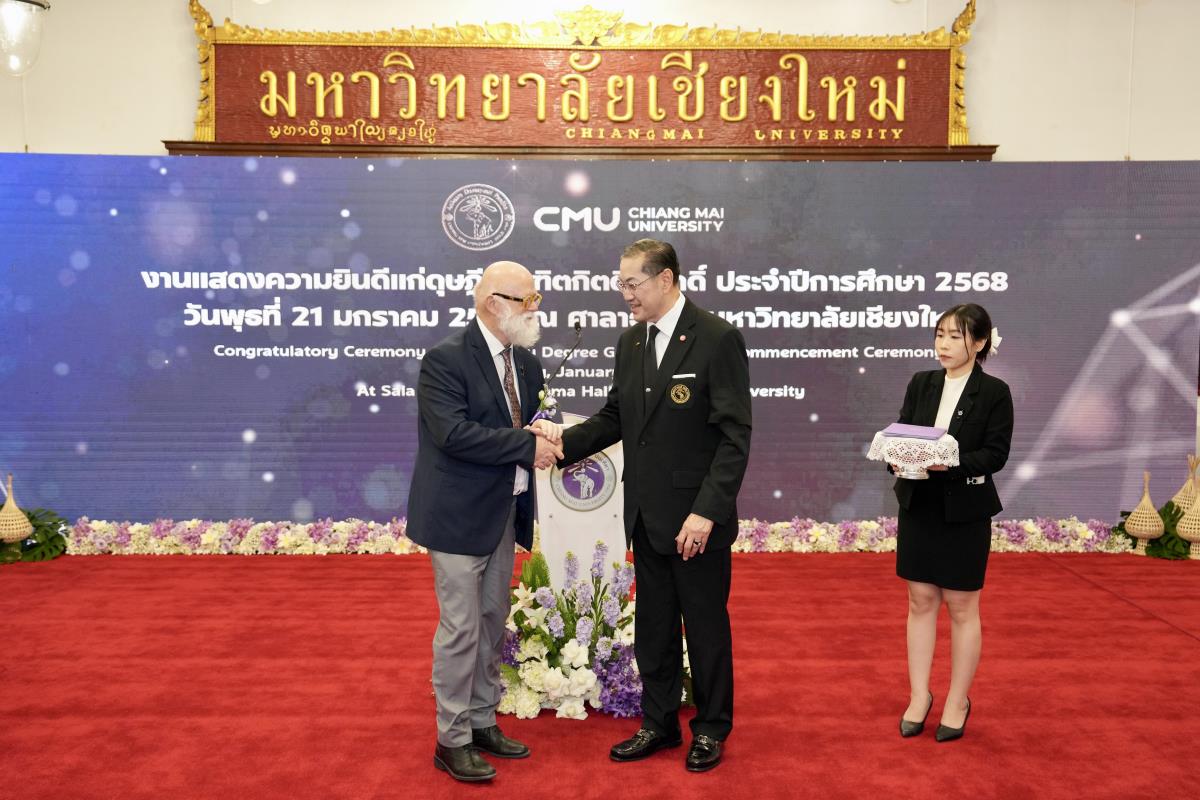มหาวิทยาลัยเชียงใหม่ จัดงานแสดงความยินดีผู้ที่ได้รับพระราชทานปริญญากิตติมศักดิ์ ในงานพิธีพระราชทานปริญญาบัตร ครั้งที่ 60 ประจำปีการศึกษา 2567-2568 โดยมีศาสตราจารย์พิเศษ ดร.สุรเกียรติ์ เสถียรไทย นายกสภามหาวิทยาลัยเชียงใหม่ กล่าวแสดงความยินดี มอบเกียรติบัตร และมอบดอกไม้ ศาสตราจารย์ ดร.นพ.พงษ์รักษ์ ศรีบัณฑิตมงคล อธิการบดีมหาวิทยาลัยเชียงใหม่ มอบภาพถ่ายฯ พร้อมด้วย นายสุมิตร เพชราภิรัชต์ นายกสมาคมนักศึกษาเก่ามหาวิทยาลัยเชียงใหม่ คุณนารีรัตน์ จันทรมังกร ประธานกรรมการส่งเสริมมหาวิทยาลัยเชียงใหม่ มอบของที่ระลึก แก่ผู้ที่ได้รับพระราชทานปริญญากิตติมศักดิ์ ณ ศาลาธรรม มหาวิทยาลัยเชียงใหม่ เมื่อวันพุธที่ 21 มกราคม 2569