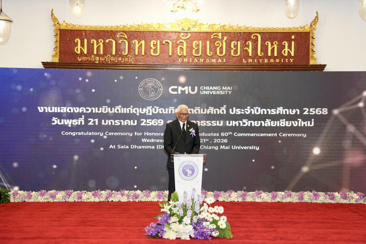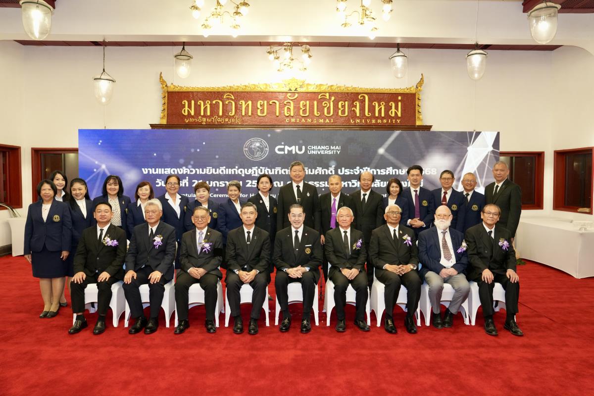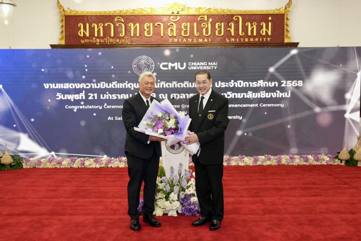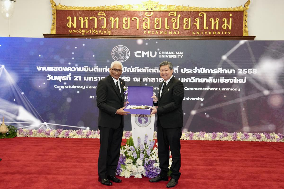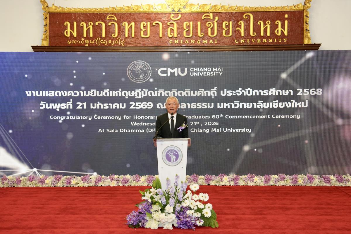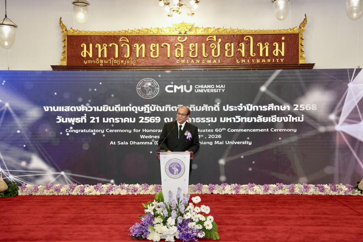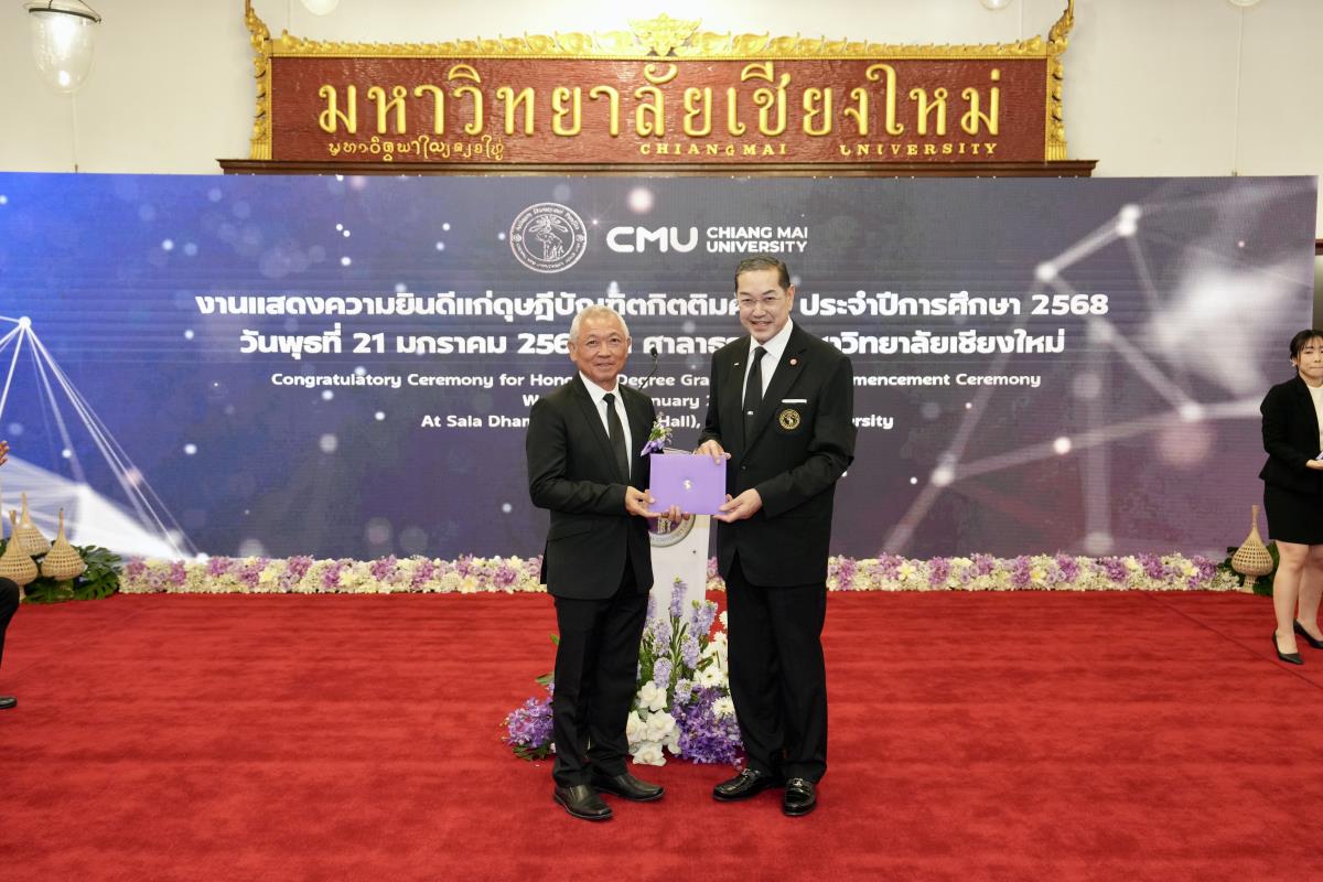 มหาวิทยาลัยเชียงใหม่ จัดงานแสดงความยินดีผู้ที่ได้รับพระราชทานปริญญากิตติมศักดิ์ ในงานพิธีพระราชทานปริญญาบัตร ครั้งที่ 60 ประจำปีการศึกษา 2567-2568 โดยมีศาสตราจารย์พิเศษ ดร.สุรเกียรติ์ เสถียรไทย นายกสภามหาวิทยาลัยเชียงใหม่ กล่าวแสดงความยินดี มอบเกียรติบัตร และมอบดอกไม้ ศาสตราจารย์ ดร.นพ.พงษ์รักษ์ ศรีบัณฑิตมงคล อธิการบดีมหาวิทยาลัยเชียงใหม่ มอบภาพถ่ายฯ พร้อมด้วย นายสุมิตร เพชราภิรัชต์ นายกสมาคมนักศึกษาเก่ามหาวิทยาลัยเชียงใหม่ คุณนารีรัตน์ จันทรมังกร ประธานกรรมการส่งเสริมมหาวิทยาลัยเชียงใหม่ มอบของที่ระลึก แก่ผู้ที่ได้รับพระราชทานปริญญากิตติมศักดิ์ ณ ศาลาธรรม มหาวิทยาลัยเชียงใหม่ เมื่อวันพุธที่ 21 มกราคม 2569