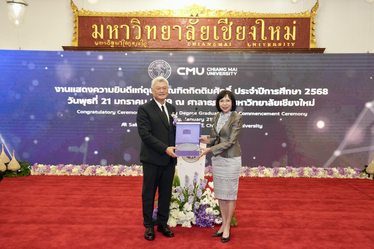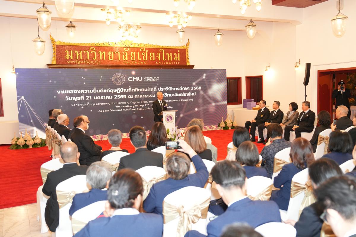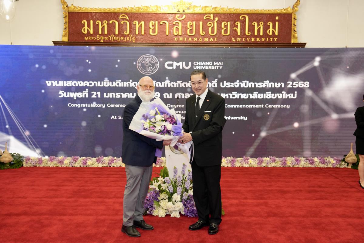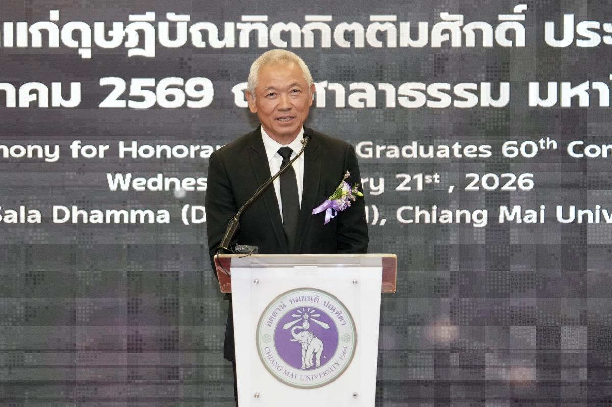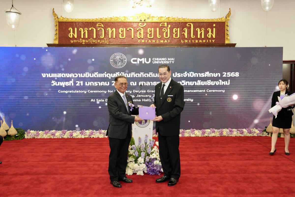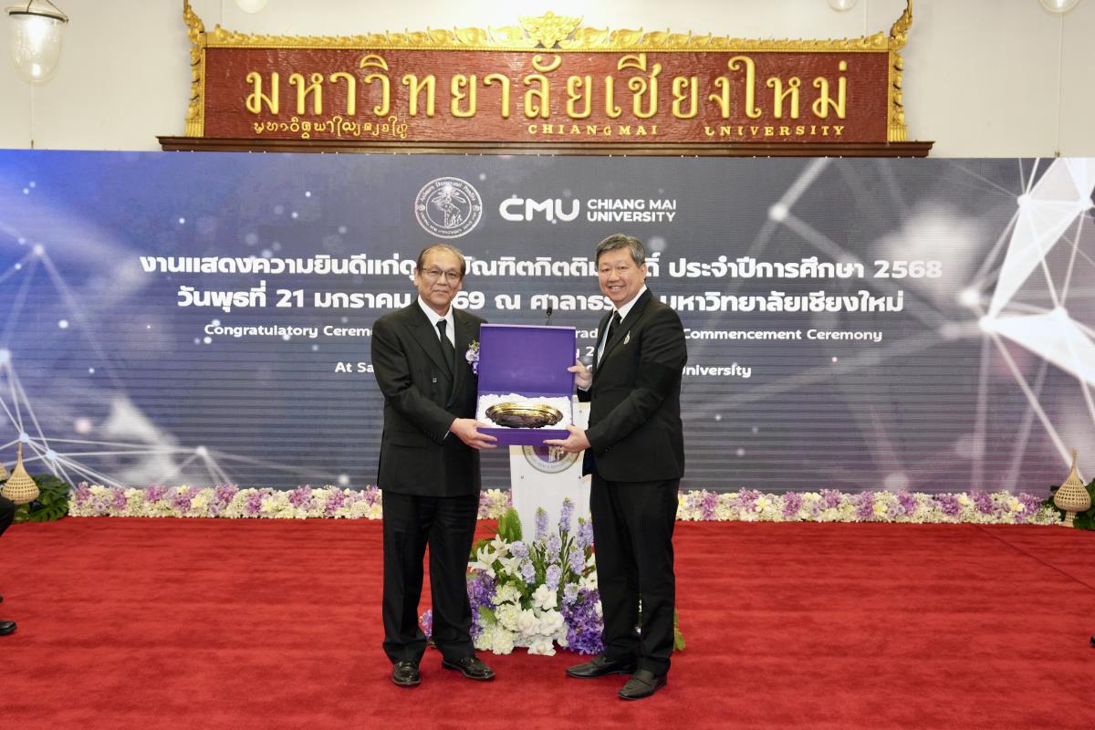 มหาวิทยาลัยเชียงใหม่ จัดงานแสดงความยินดีผู้ที่ได้รับพระราชทานปริญญากิตติมศักดิ์ ในงานพิธีพระราชทานปริญญาบัตร ครั้งที่ 60 ประจำปีการศึกษา 2567-2568 โดยมีศาสตราจารย์พิเศษ ดร.สุรเกียรติ์ เสถียรไทย นายกสภามหาวิทยาลัยเชียงใหม่ กล่าวแสดงความยินดี มอบเกียรติบัตร และมอบดอกไม้ ศาสตราจารย์ ดร.นพ.พงษ์รักษ์ ศรีบัณฑิตมงคล อธิการบดีมหาวิทยาลัยเชียงใหม่ มอบภาพถ่ายฯ พร้อมด้วย นายสุมิตร เพชราภิรัชต์ นายกสมาคมนักศึกษาเก่ามหาวิทยาลัยเชียงใหม่ คุณนารีรัตน์ จันทรมังกร ประธานกรรมการส่งเสริมมหาวิทยาลัยเชียงใหม่ มอบของที่ระลึก แก่ผู้ที่ได้รับพระราชทานปริญญากิตติมศักดิ์ ณ ศาลาธรรม มหาวิทยาลัยเชียงใหม่ เมื่อวันพุธที่ 21 มกราคม 2569