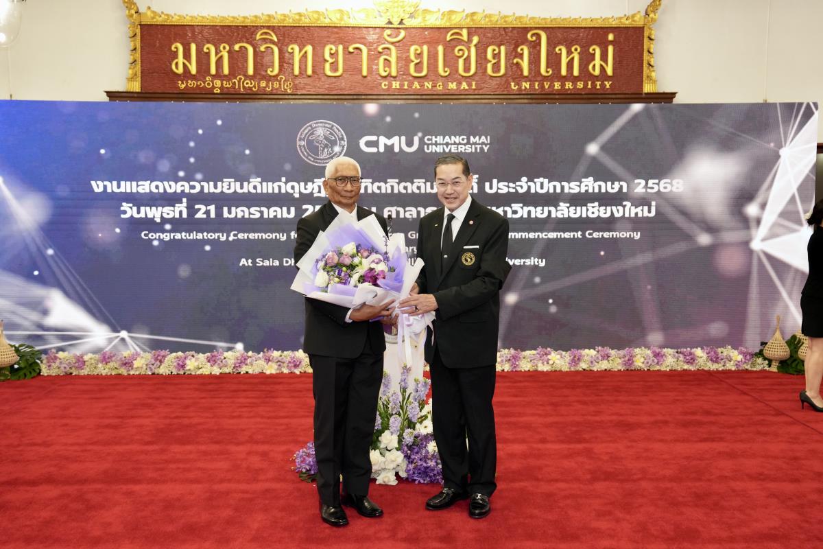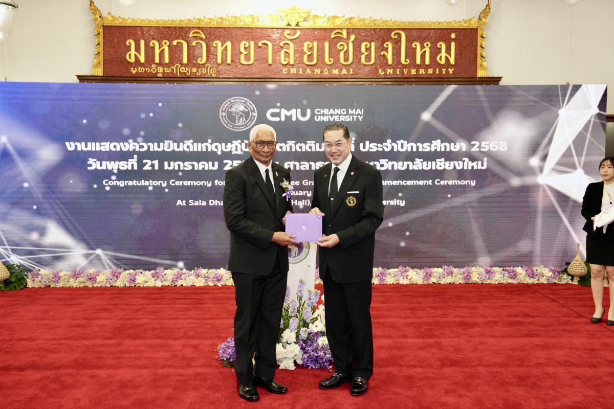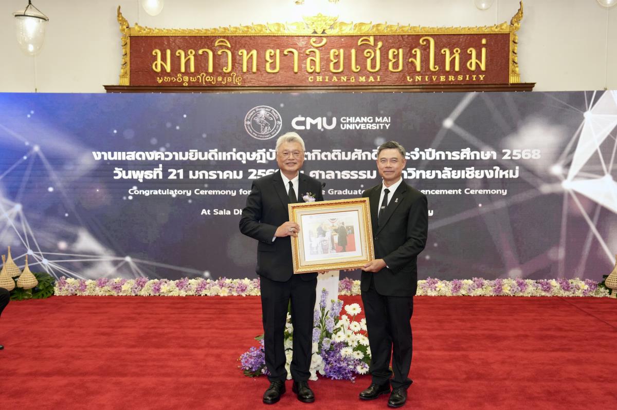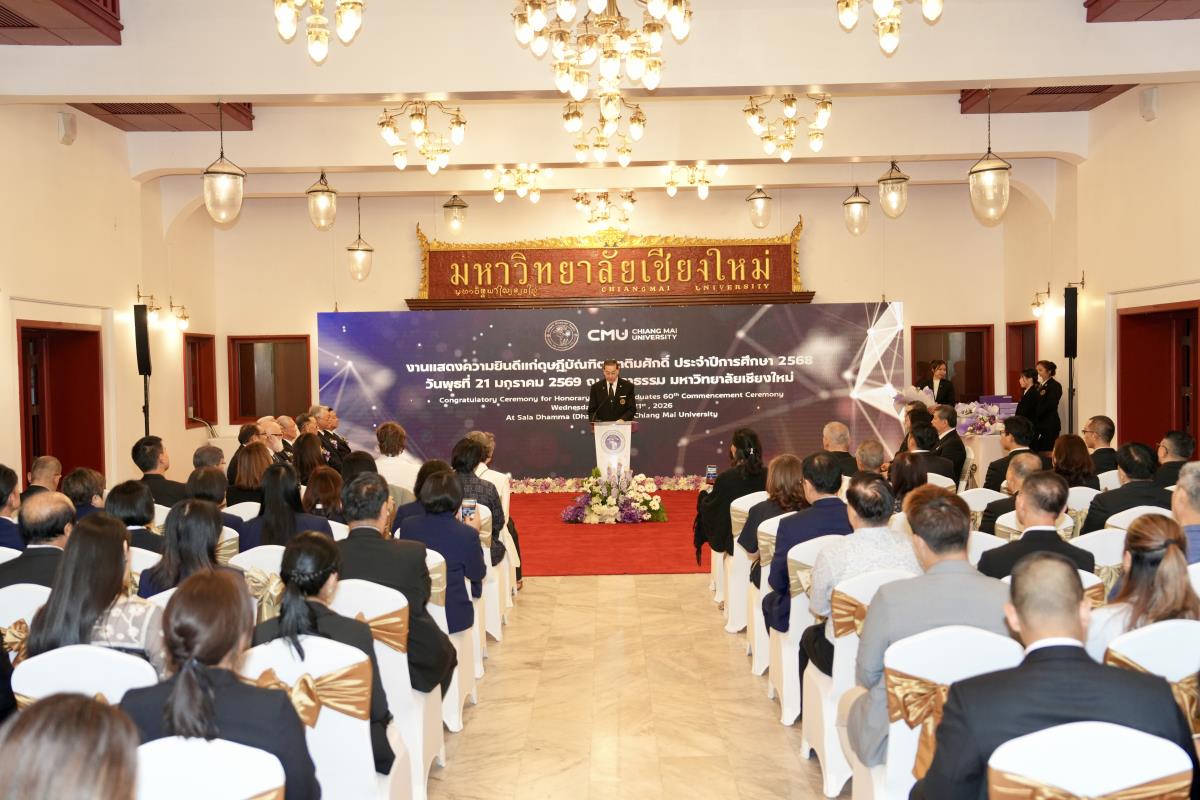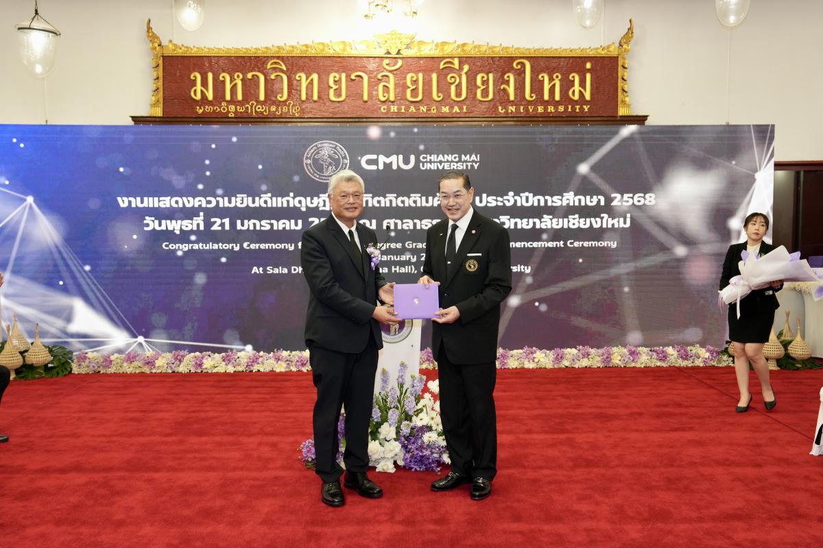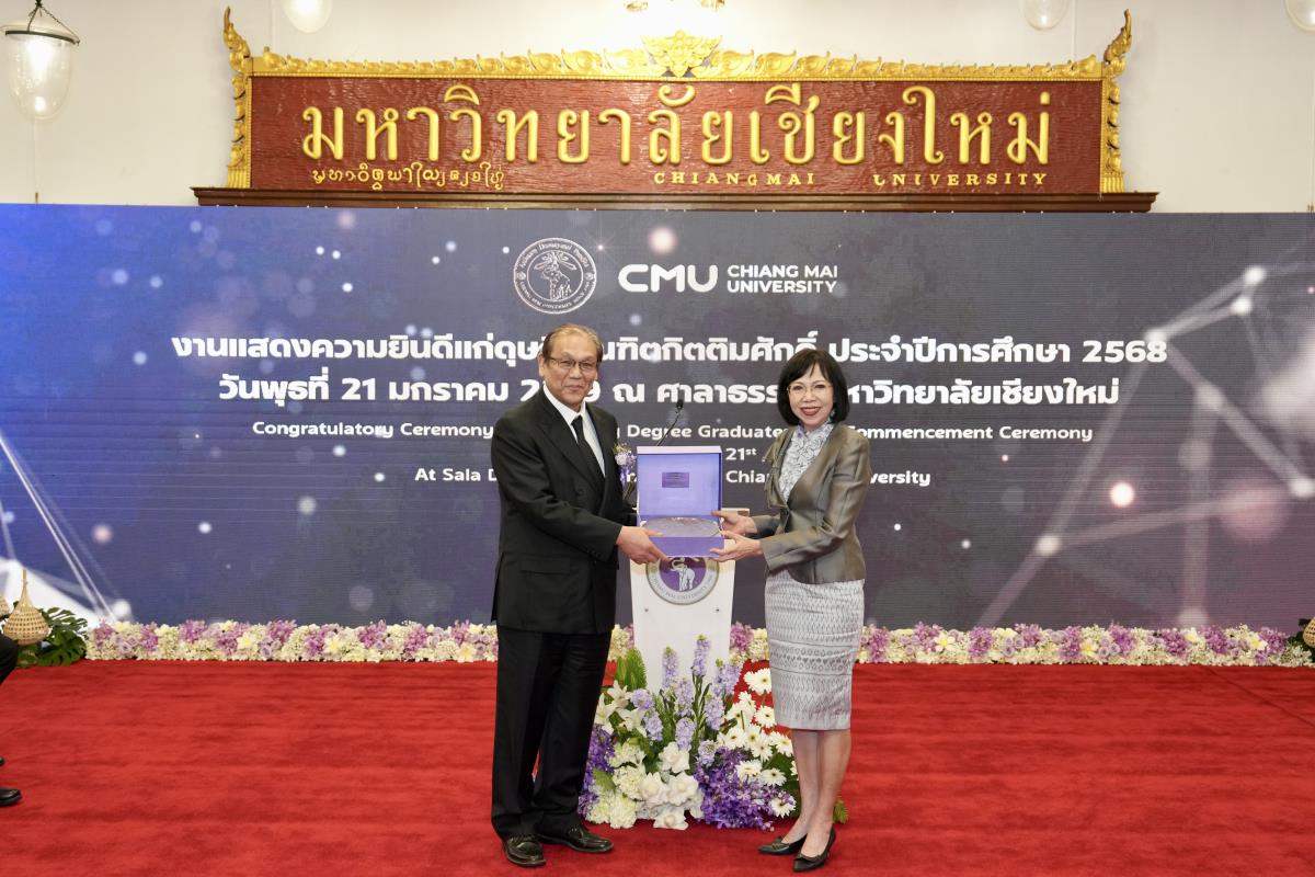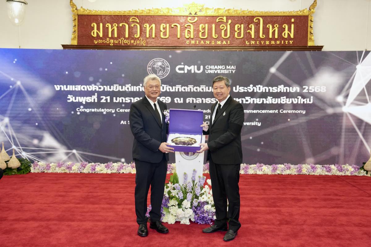 มหาวิทยาลัยเชียงใหม่ จัดงานแสดงความยินดีผู้ที่ได้รับพระราชทานปริญญากิตติมศักดิ์ ในงานพิธีพระราชทานปริญญาบัตร ครั้งที่ 60 ประจำปีการศึกษา 2567-2568 โดยมีศาสตราจารย์พิเศษ ดร.สุรเกียรติ์ เสถียรไทย นายกสภามหาวิทยาลัยเชียงใหม่ กล่าวแสดงความยินดี มอบเกียรติบัตร และมอบดอกไม้ ศาสตราจารย์ ดร.นพ.พงษ์รักษ์ ศรีบัณฑิตมงคล อธิการบดีมหาวิทยาลัยเชียงใหม่ มอบภาพถ่ายฯ พร้อมด้วย นายสุมิตร เพชราภิรัชต์ นายกสมาคมนักศึกษาเก่ามหาวิทยาลัยเชียงใหม่ คุณนารีรัตน์ จันทรมังกร ประธานกรรมการส่งเสริมมหาวิทยาลัยเชียงใหม่ มอบของที่ระลึก แก่ผู้ที่ได้รับพระราชทานปริญญากิตติมศักดิ์ ณ ศาลาธรรม มหาวิทยาลัยเชียงใหม่ เมื่อวันพุธที่ 21 มกราคม 2569