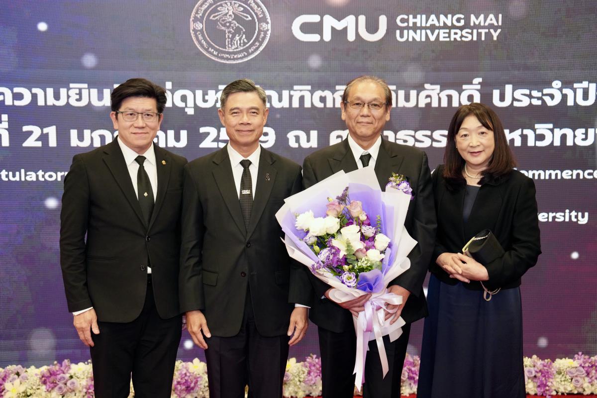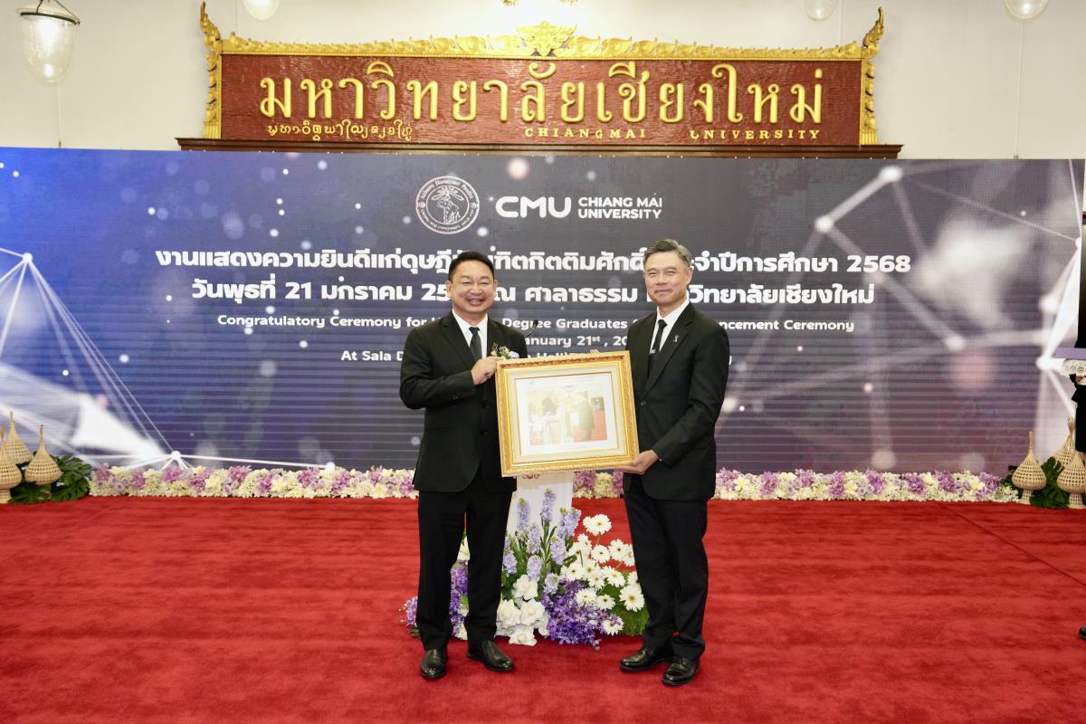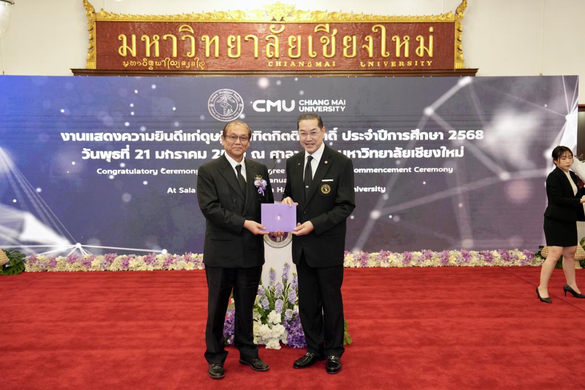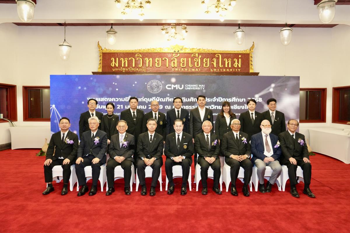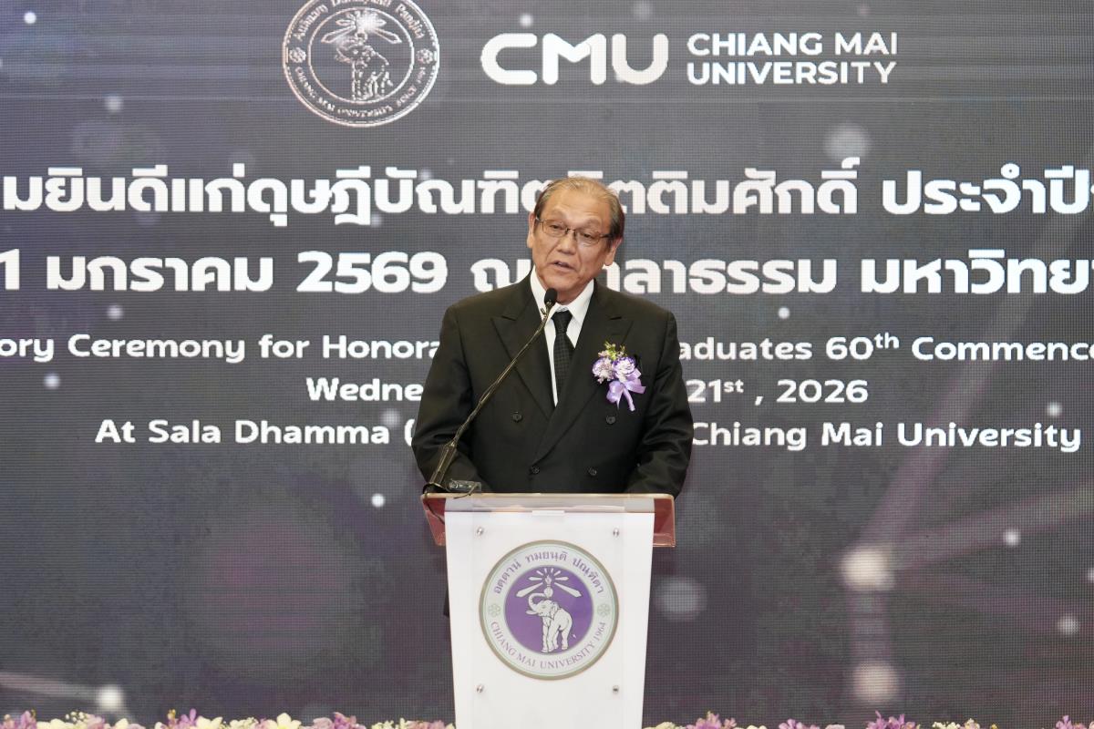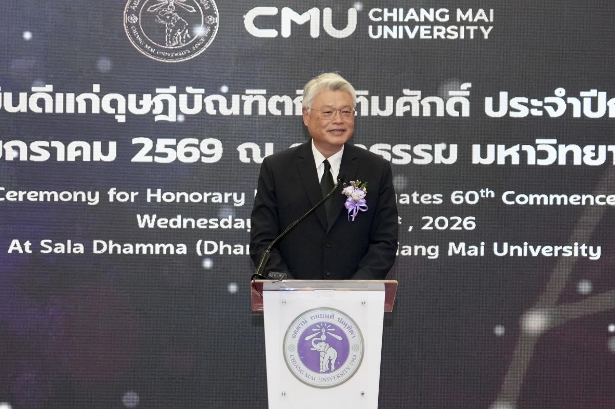 มหาวิทยาลัยเชียงใหม่ จัดงานแสดงความยินดีผู้ที่ได้รับพระราชทานปริญญากิตติมศักดิ์ ในงานพิธีพระราชทานปริญญาบัตร ครั้งที่ 60 ประจำปีการศึกษา 2567-2568 โดยมีศาสตราจารย์พิเศษ ดร.สุรเกียรติ์ เสถียรไทย นายกสภามหาวิทยาลัยเชียงใหม่ กล่าวแสดงความยินดี มอบเกียรติบัตร และมอบดอกไม้ ศาสตราจารย์ ดร.นพ.พงษ์รักษ์ ศรีบัณฑิตมงคล อธิการบดีมหาวิทยาลัยเชียงใหม่ มอบภาพถ่ายฯ พร้อมด้วย นายสุมิตร เพชราภิรัชต์ นายกสมาคมนักศึกษาเก่ามหาวิทยาลัยเชียงใหม่ คุณนารีรัตน์ จันทรมังกร ประธานกรรมการส่งเสริมมหาวิทยาลัยเชียงใหม่ มอบของที่ระลึก แก่ผู้ที่ได้รับพระราชทานปริญญากิตติมศักดิ์ ณ ศาลาธรรม มหาวิทยาลัยเชียงใหม่ เมื่อวันพุธที่ 21 มกราคม 2569