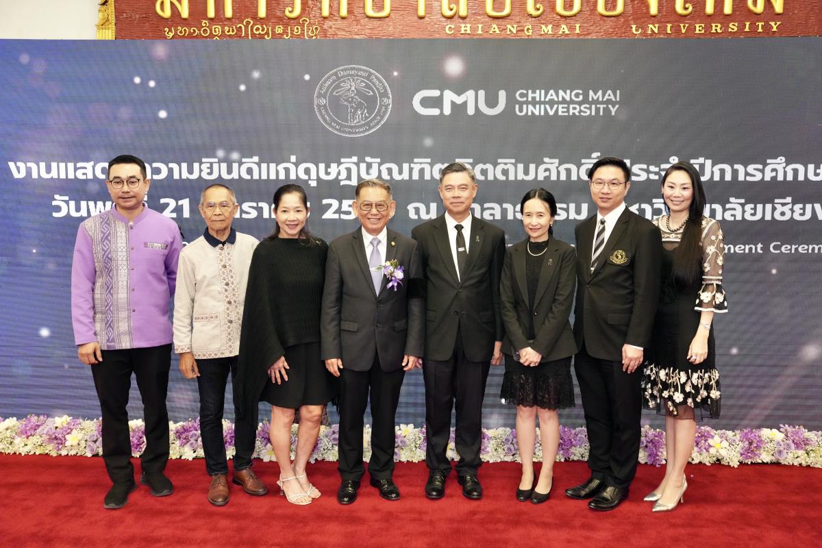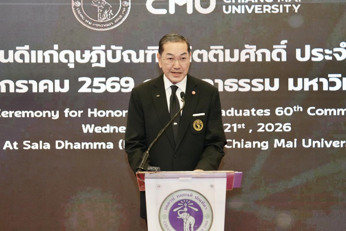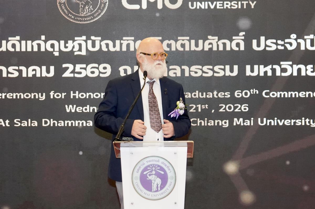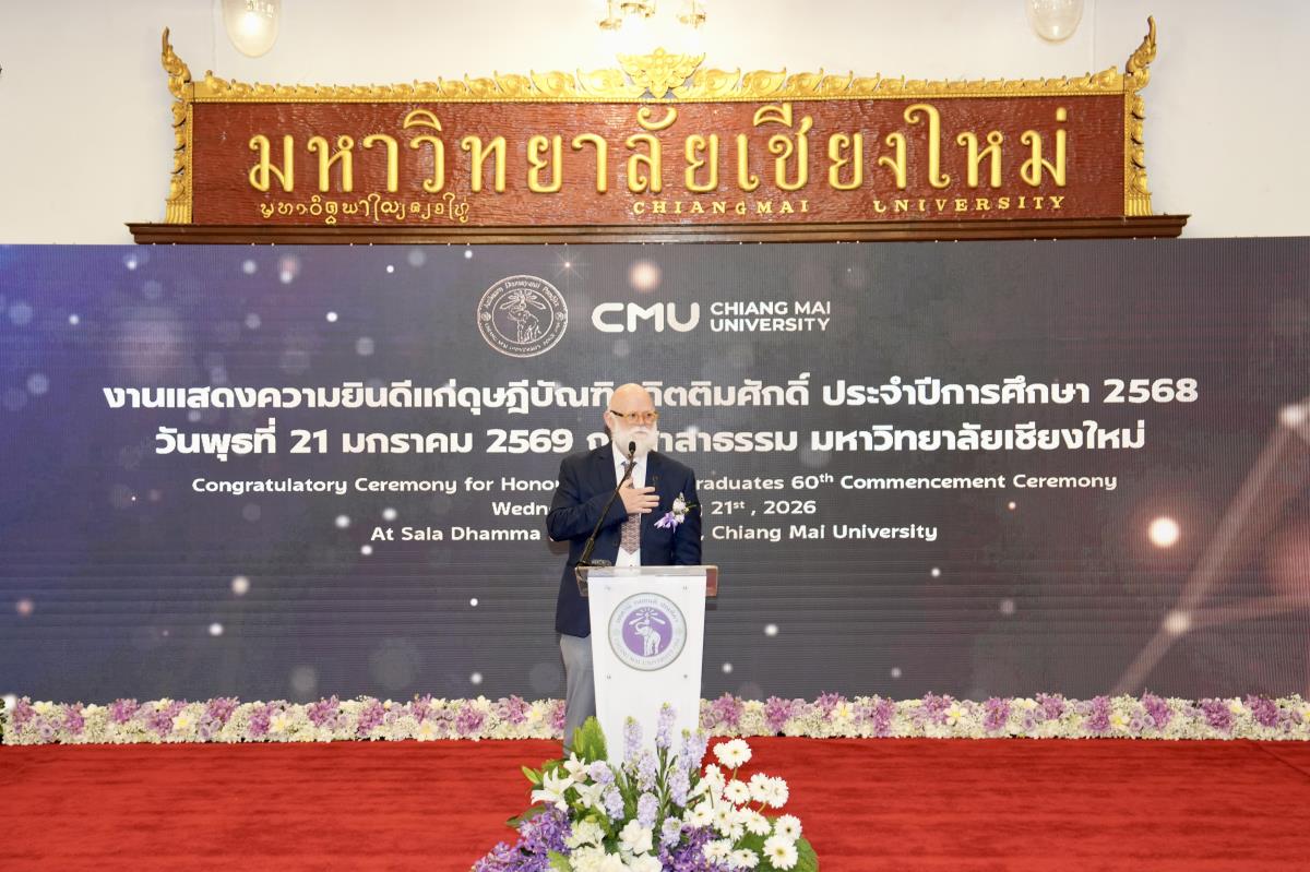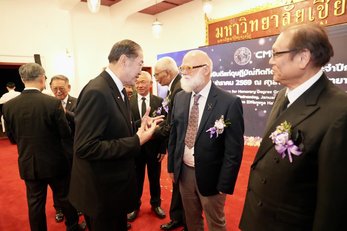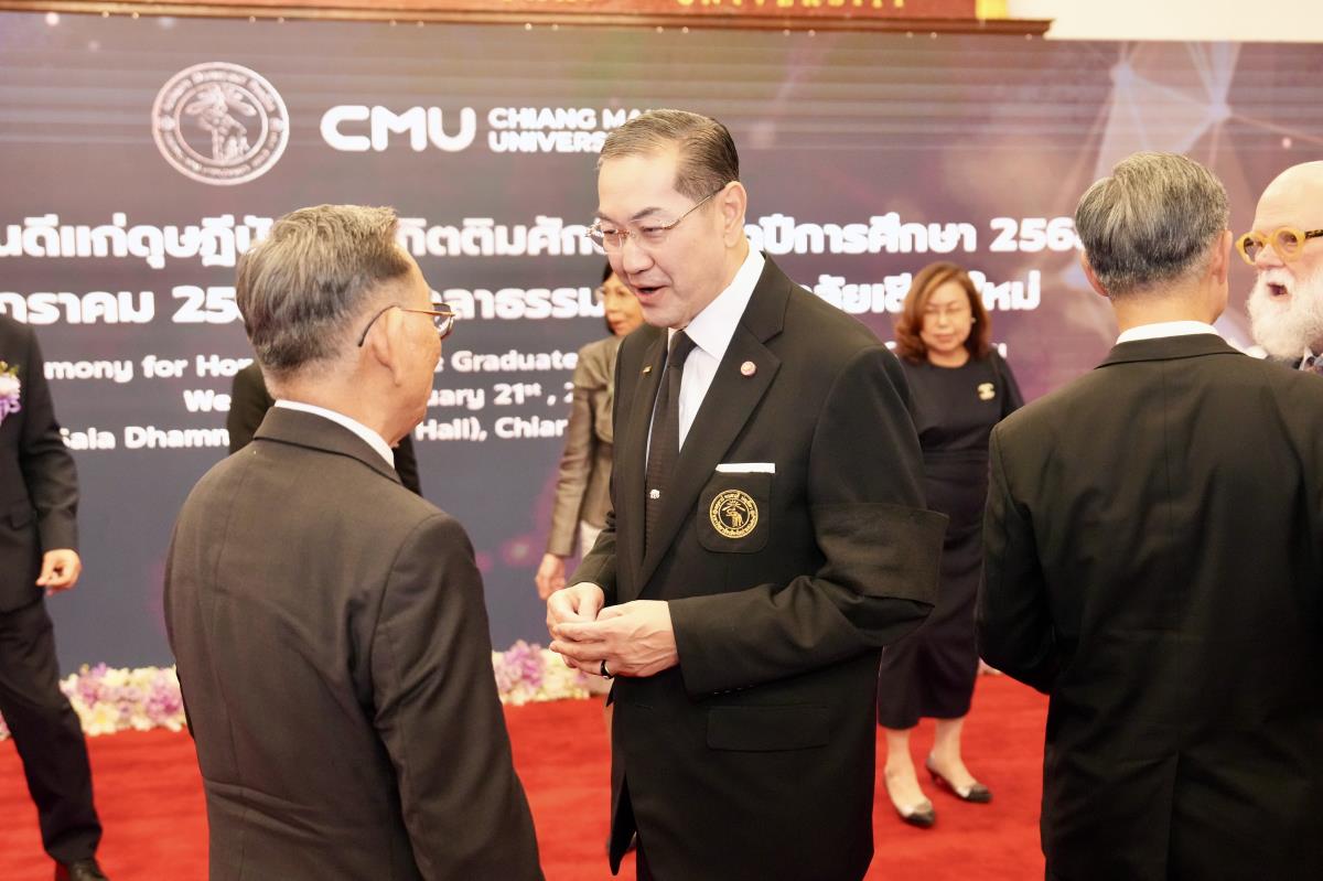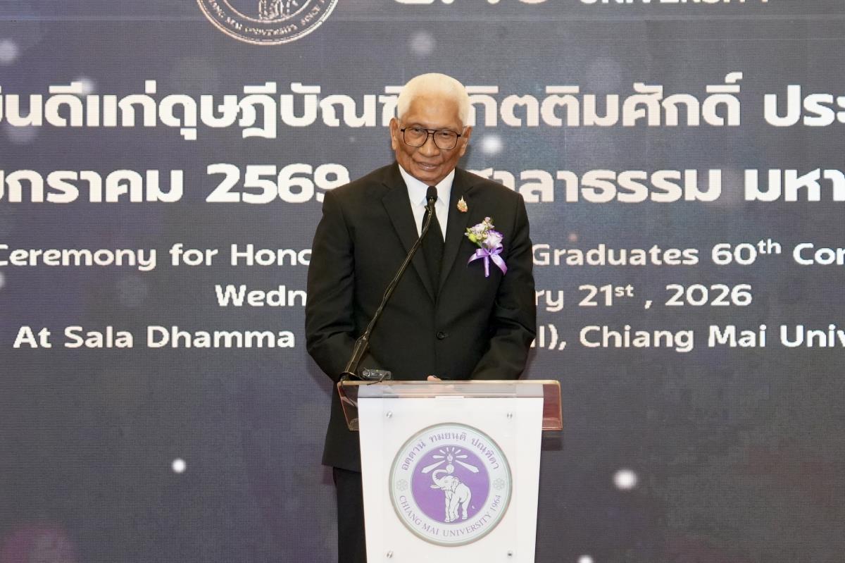 มหาวิทยาลัยเชียงใหม่ จัดงานแสดงความยินดีผู้ที่ได้รับพระราชทานปริญญากิตติมศักดิ์ ในงานพิธีพระราชทานปริญญาบัตร ครั้งที่ 60 ประจำปีการศึกษา 2567-2568 โดยมีศาสตราจารย์พิเศษ ดร.สุรเกียรติ์ เสถียรไทย นายกสภามหาวิทยาลัยเชียงใหม่ กล่าวแสดงความยินดี มอบเกียรติบัตร และมอบดอกไม้ ศาสตราจารย์ ดร.นพ.พงษ์รักษ์ ศรีบัณฑิตมงคล อธิการบดีมหาวิทยาลัยเชียงใหม่ มอบภาพถ่ายฯ พร้อมด้วย นายสุมิตร เพชราภิรัชต์ นายกสมาคมนักศึกษาเก่ามหาวิทยาลัยเชียงใหม่ คุณนารีรัตน์ จันทรมังกร ประธานกรรมการส่งเสริมมหาวิทยาลัยเชียงใหม่ มอบของที่ระลึก แก่ผู้ที่ได้รับพระราชทานปริญญากิตติมศักดิ์ ณ ศาลาธรรม มหาวิทยาลัยเชียงใหม่ เมื่อวันพุธที่ 21 มกราคม 2569