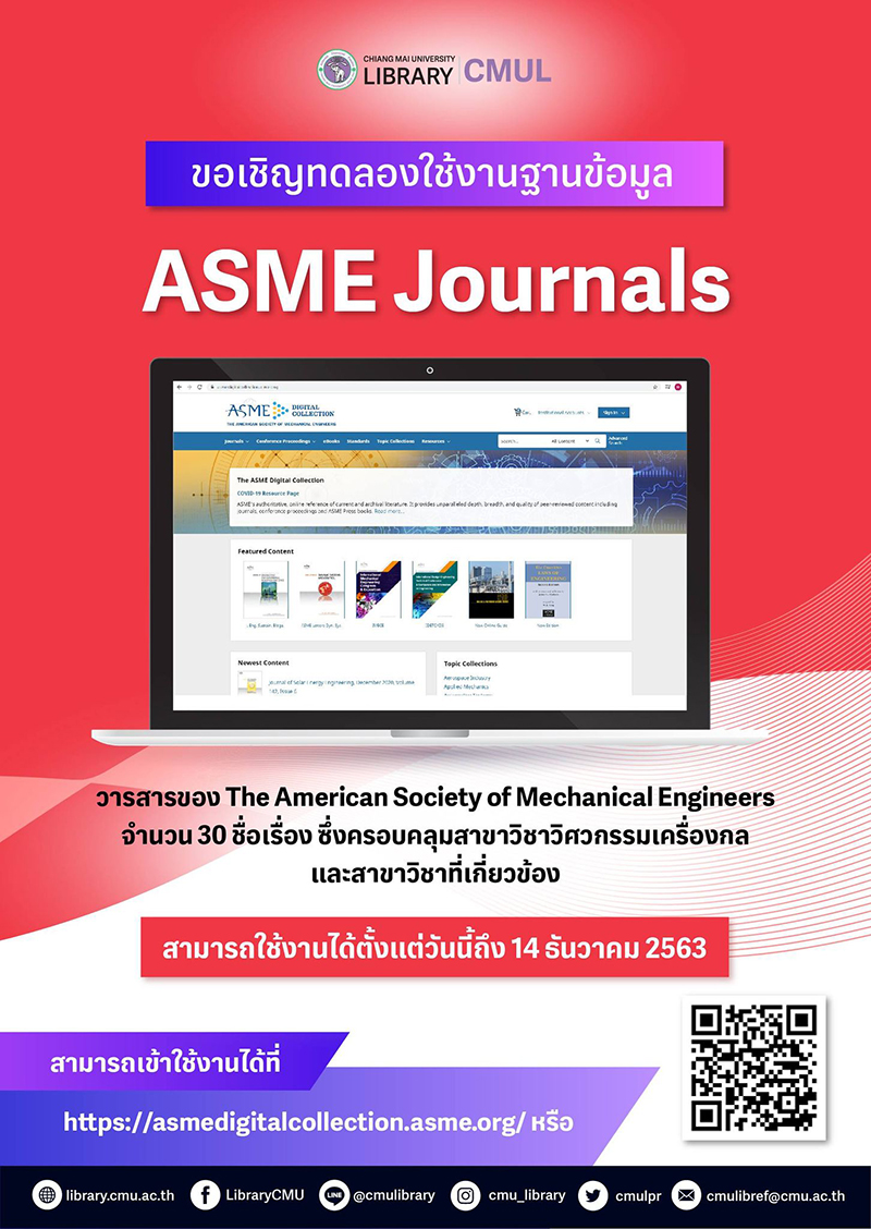 สำนักหอสมุด ขอเชิญชวนนักศึกษา และบุคลากรของมหาวิทยาลัยเชียงใหม่ เข้าใช้ฐานข้อมูล ASME Journals ฐานข้อมูลวารสารของ The American Society of Mechanical Engineers จำนวน 30 ชื่อเรื่อง ครอบคลุมสาขาวิชาวิศวกรรมเครื่องกล และสาขาวิชาที่เกี่ยวข้อง
