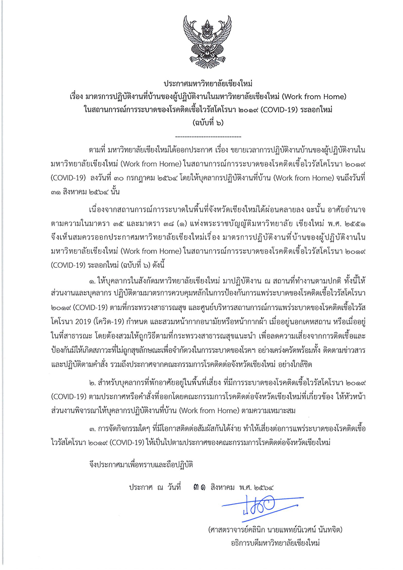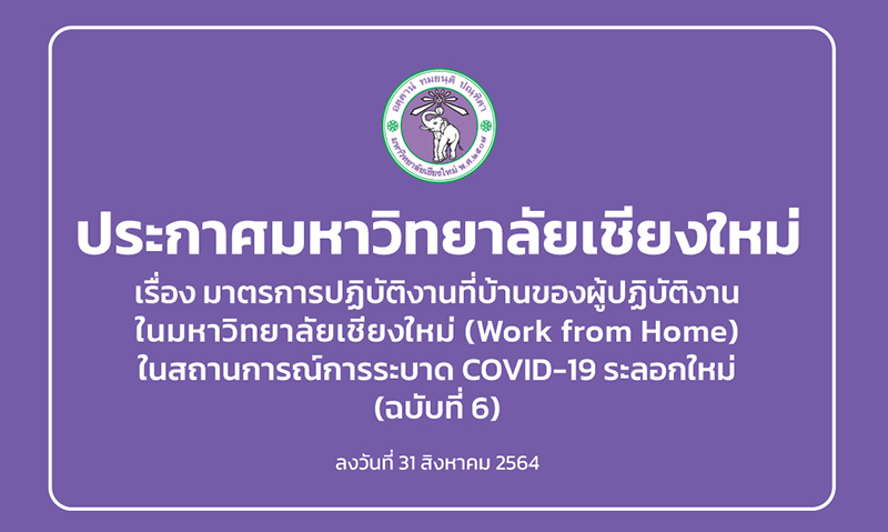 ประกาศ มาตรการปฏิบัติงานที่บ้านของผู้ปฏิบัติงานในมหาวิทยาลัยเชียงใหม่ ฯ ฉบับที่ 6