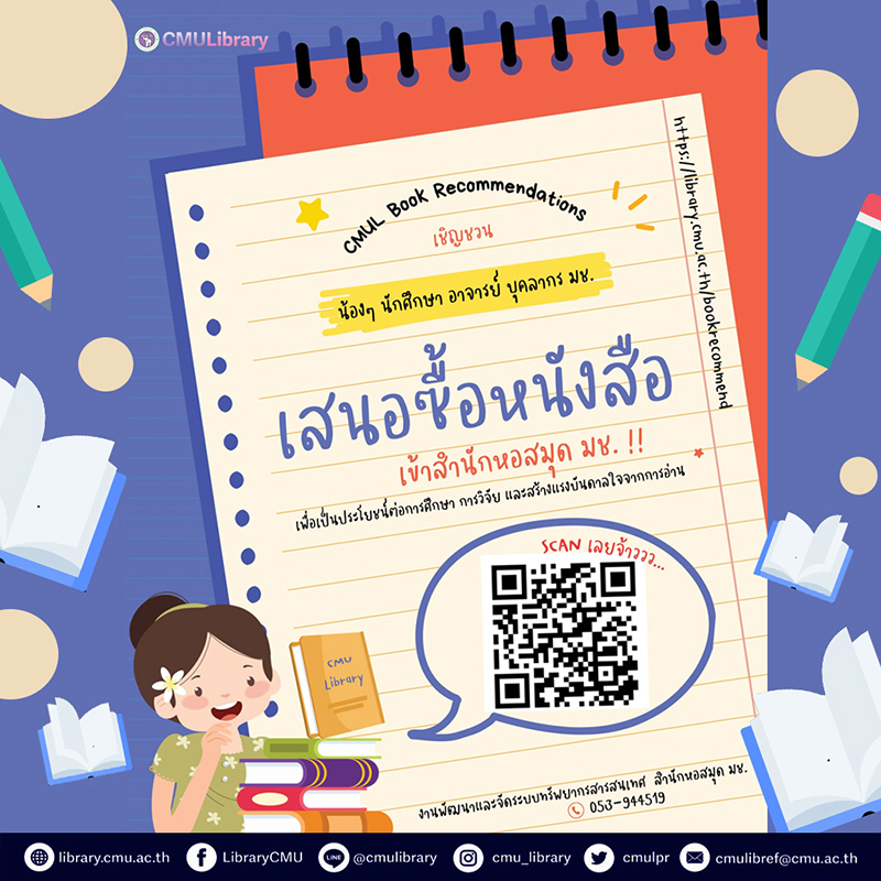สำนักหอสมุด เชิญชวนคณาจารย์ นักศึกษาและบุคลากร มหาวิทยาลัยเชียงใหม่ เสนอซื้อหนังสือเข้าห้องสมุด ผ่านบริการ CMUL Book Recommendations ได้ที่