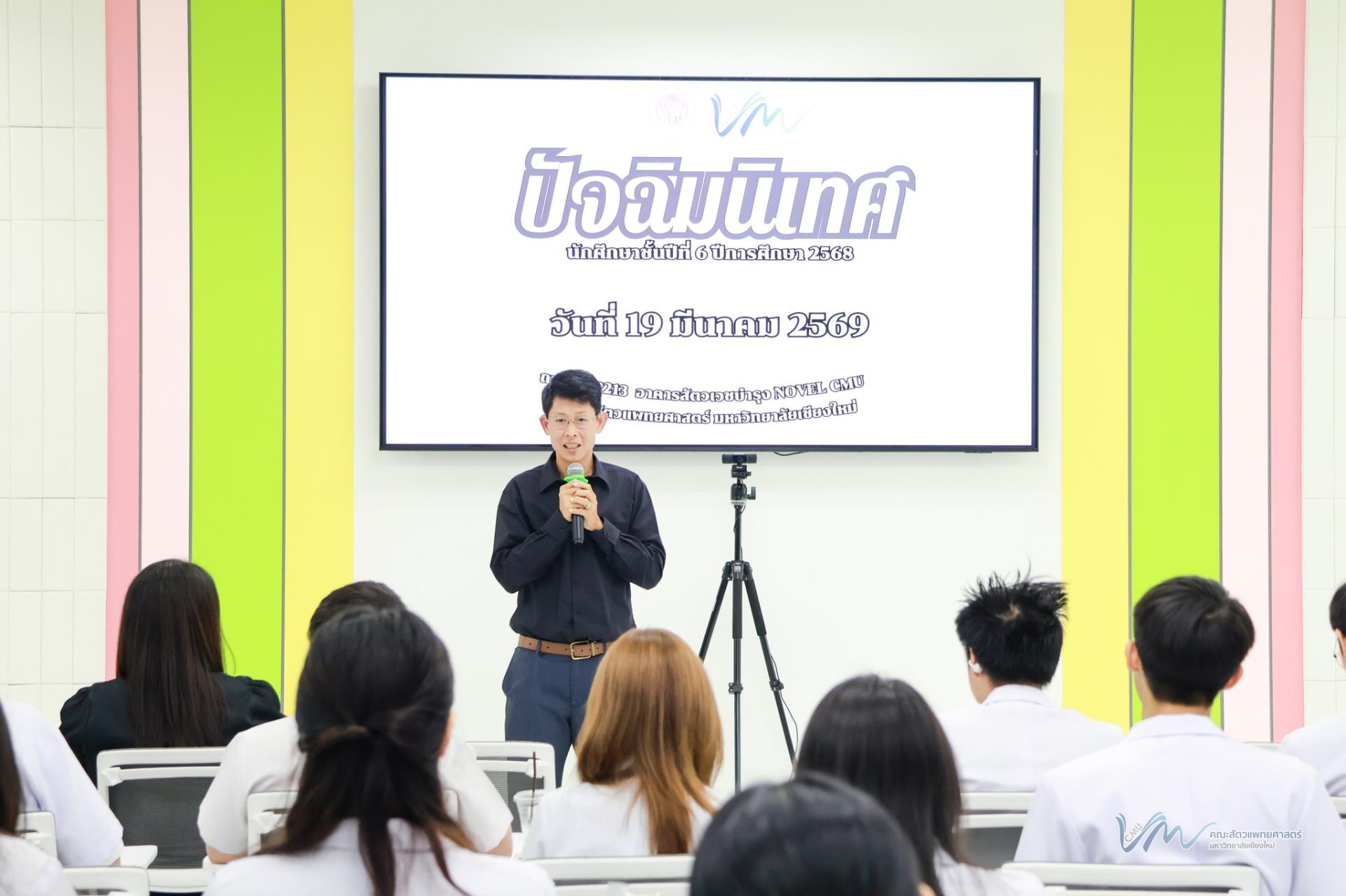 เมื่อวันที่ 19 มีนาคม 2569 คณะสัตวแพทยศาสตร์ มหาวิทยาลัยเชียงใหม่ ได้จัดโครงการปัจฉิมนิเทศนักศึกษาชั้นปีที่ 6 ประจำปีการศึกษา 2568 เพื่อแสดงความยินดีและเตรียมความพร้อมให้แก่นักศึกษาก่อนก้าวสู่เส้นทางวิชาชีพสัตวแพทย์ โดยได้รับเกียรติจาก ศ. (เชี่ยวชาญพิเศษ) ดร.น.สพ.กรกฎ งานวงศ์พาณิชย์ คณบดีคณะสัตวแพทยศาสตร์ มหาวิทยาลัยเชียงใหม่ พร้อมด้วย ผศ. ดร. น.สพ.ธวัชชัย สิงห์หล้า ผู้ช่วยคณบดีฝ่ายศิษย์เก่าและนักศึกษาสัมพันธ์ คณาจารย์ ตลอดจนหน่วยกิจการนักศึกษา และงานบริการการศึกษาและพัฒนาคุณภาพการศึกษา ร่วมแสดงความยินดี กล่าวอวยพร และให้ข้อคิดแก่นักศึกษาสัตวแพทย์ชั้นปีที่ 6 รุ่น VET’84 (VET CMU รุ่นที่ 25) ณ คณะสัตวแพทยศาสตร์ มหาวิทยาลัยเชียงใหม่