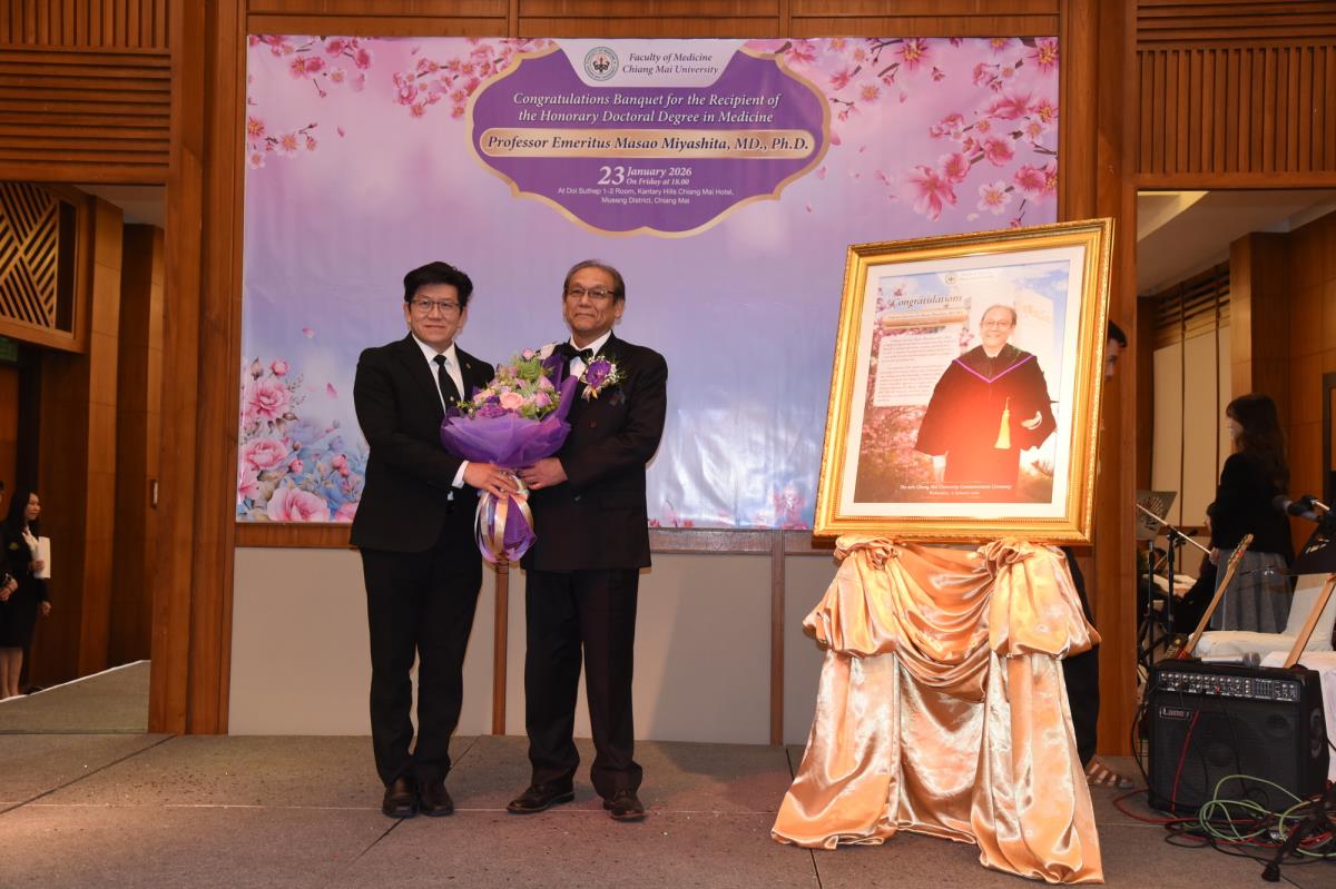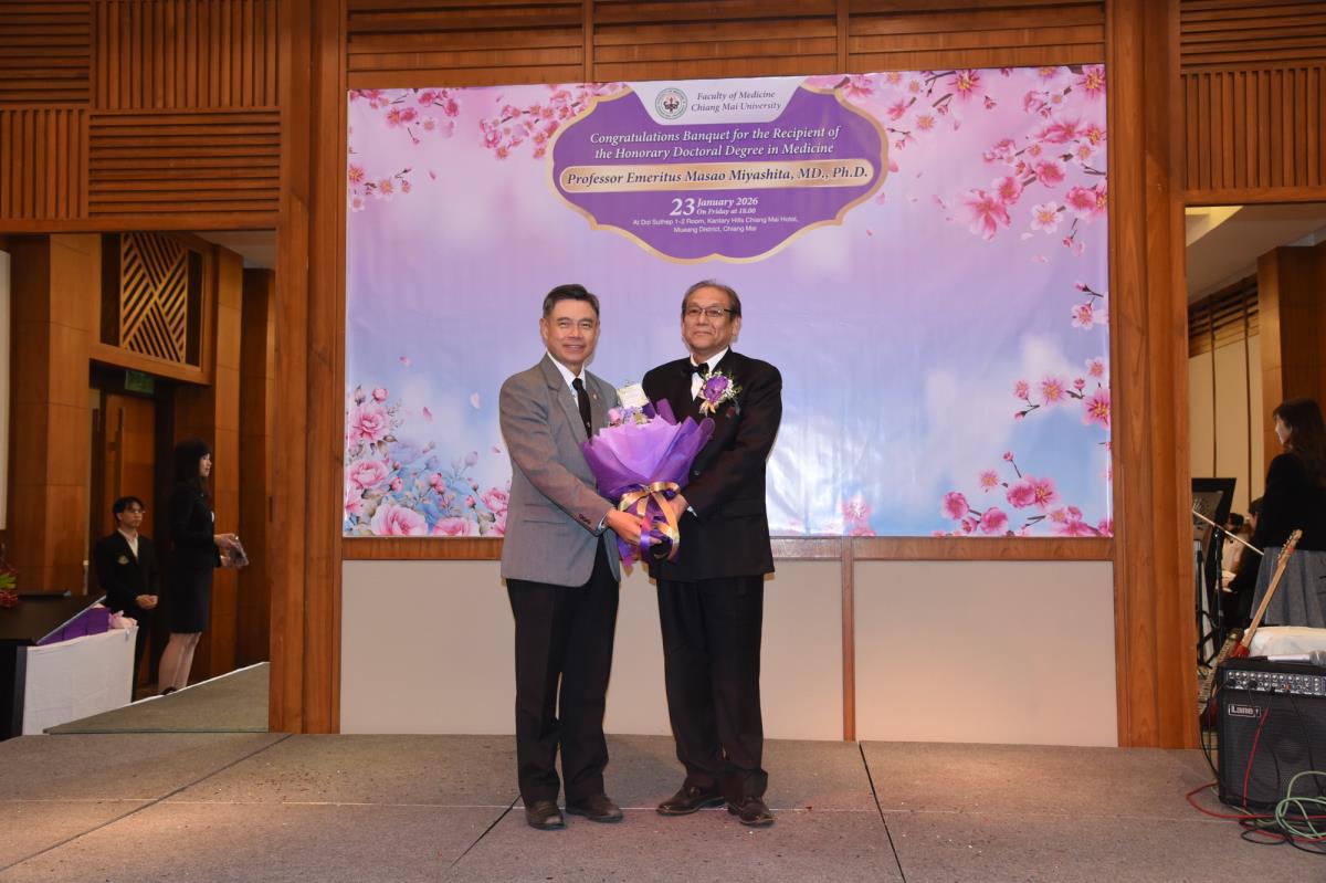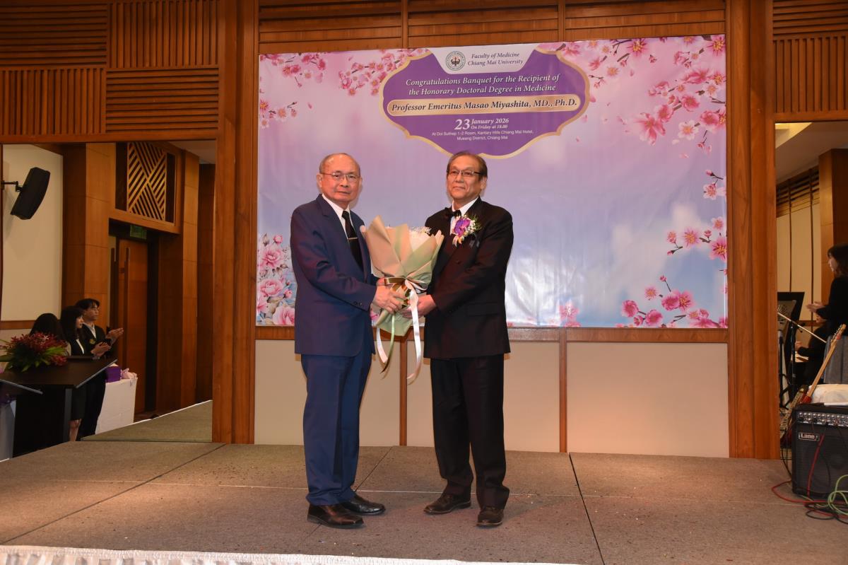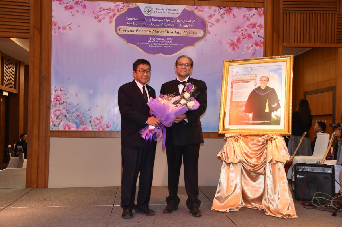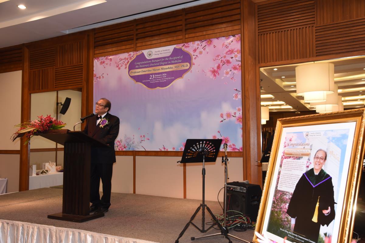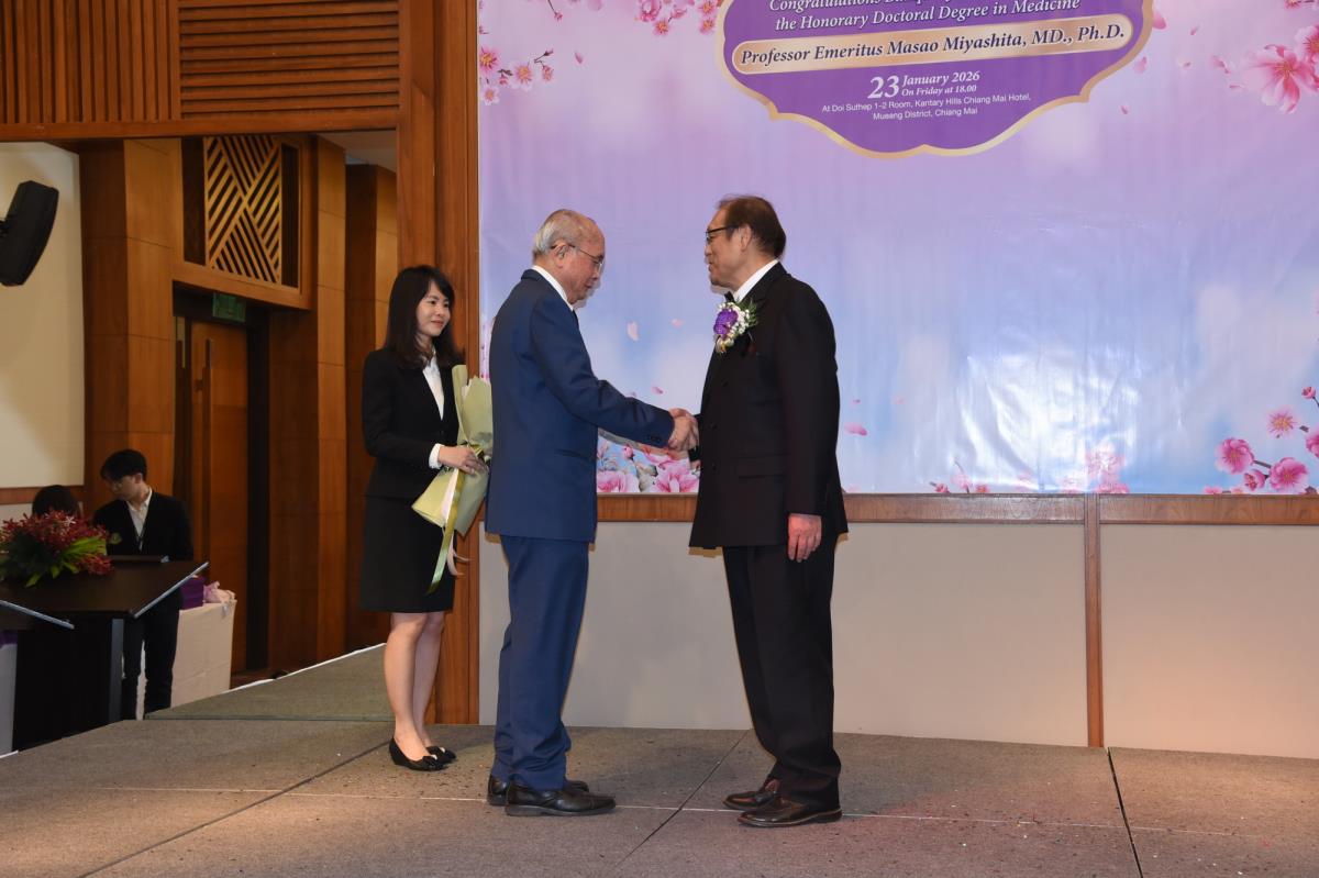 ศาสตราจารย์ ดร.นพ.พงษ์รักษ์ ศรีบัณฑิตมงคล อธิการบดีมหาวิทยาลัยเชียงใหม่ พร้อมด้วยศาสตราจารย์คลินิก นพ.นิเวศน์ นันทจิต เลขาธิการมูลนิธิขาเทียมในพระบรมราชูปถัมภ์ฯ อดีตอธิการบดีมหาวิทยาลัยเชียงใหม่ รองศาสตราจารย์ นายแพทย์นเรนทร์ โชติรสนิรมิต กล่าวแสดงความยินดีแก่ศาสตราจารย์กิตติคุณ นายแพทย์มาซาโอะ มิยาชิตะ (Professor Emeritus Masao Miyashita, MD, PhD) ในโอกาสที่ได้รับพระราชทานปริญญาบัตร ปริญญาปรัชญาดุษฎีบัณฑิตกิตติมศักดิ์ สาขาวิชาแพทยศาสตร์ (Honorary Doctoral Degree in Medicine) มหาวิทยาลัยเชียงใหม่ โดยมีคณะผู้บริหาร คณาจารย์ เจ้าหน้าที่ ร่วมพิธี ณ ห้องดอยสุเทพ 1-2 โรงแรมแคนทารี ฮิลส์ เชียงใหม่ วันศุกร์ที่ 23 มกราคม พ.ศ. 2569