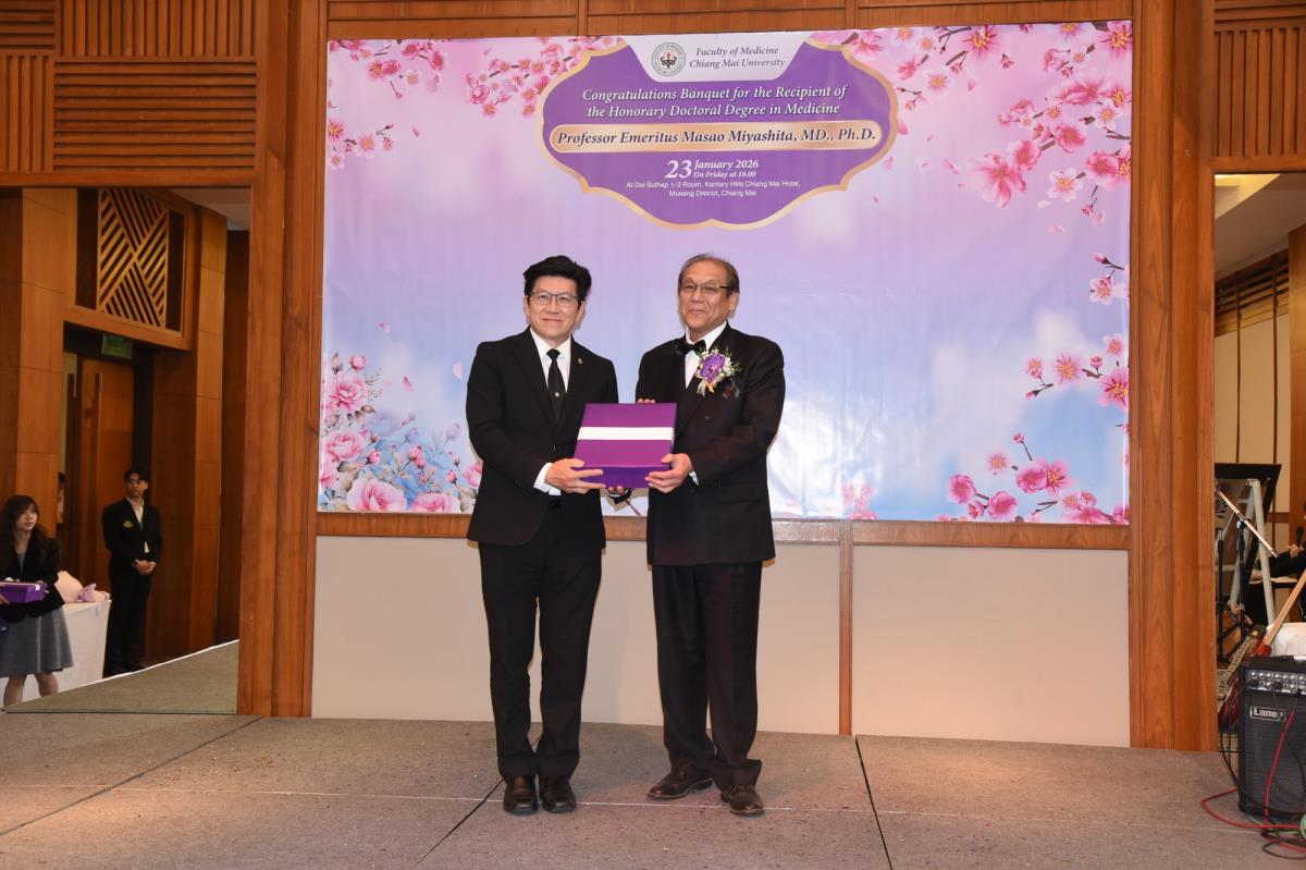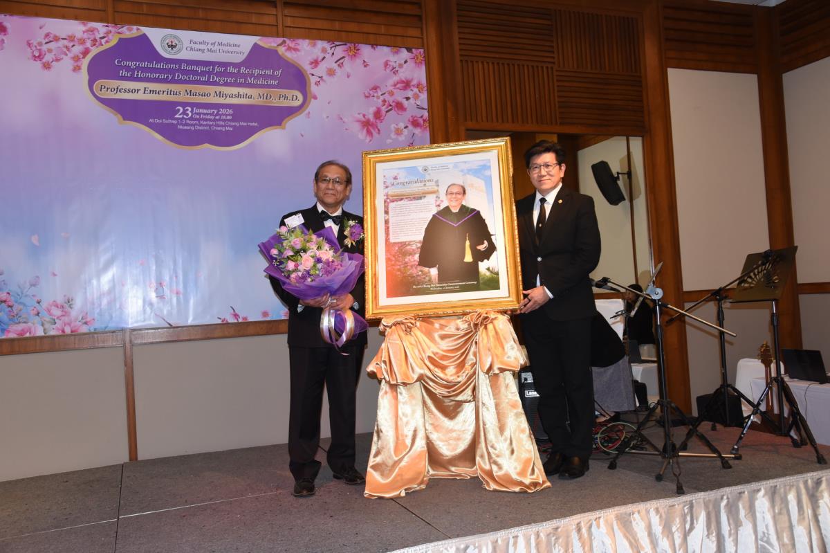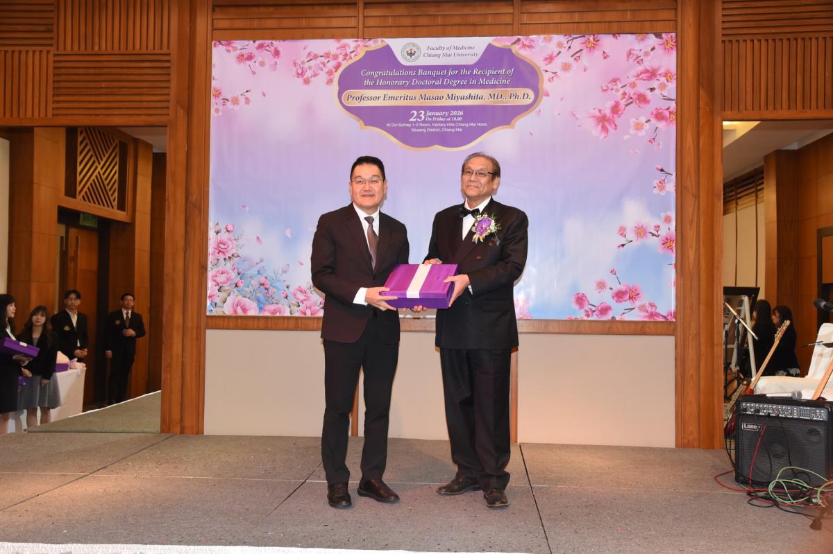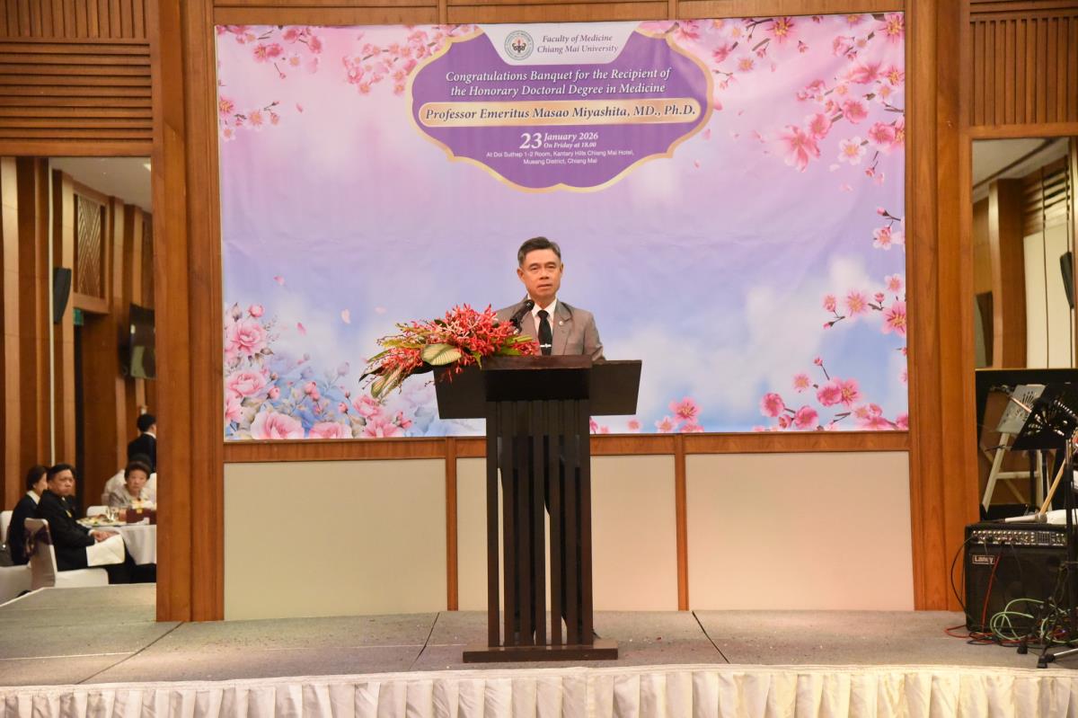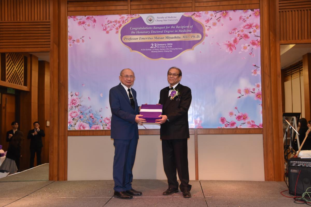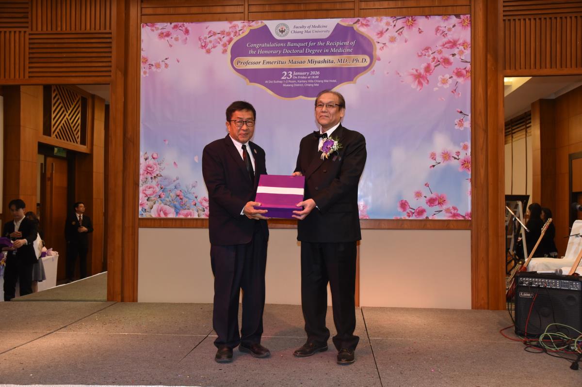 ศาสตราจารย์ ดร.นพ.พงษ์รักษ์ ศรีบัณฑิตมงคล อธิการบดีมหาวิทยาลัยเชียงใหม่ พร้อมด้วยศาสตราจารย์คลินิก นพ.นิเวศน์ นันทจิต เลขาธิการมูลนิธิขาเทียมในพระบรมราชูปถัมภ์ฯ อดีตอธิการบดีมหาวิทยาลัยเชียงใหม่ รองศาสตราจารย์ นายแพทย์นเรนทร์ โชติรสนิรมิต กล่าวแสดงความยินดีแก่ศาสตราจารย์กิตติคุณ นายแพทย์มาซาโอะ มิยาชิตะ (Professor Emeritus Masao Miyashita, MD, PhD) ในโอกาสที่ได้รับพระราชทานปริญญาบัตร ปริญญาปรัชญาดุษฎีบัณฑิตกิตติมศักดิ์ สาขาวิชาแพทยศาสตร์ (Honorary Doctoral Degree in Medicine) มหาวิทยาลัยเชียงใหม่ โดยมีคณะผู้บริหาร คณาจารย์ เจ้าหน้าที่ ร่วมพิธี ณ ห้องดอยสุเทพ 1-2 โรงแรมแคนทารี ฮิลส์ เชียงใหม่ วันศุกร์ที่ 23 มกราคม พ.ศ. 2569