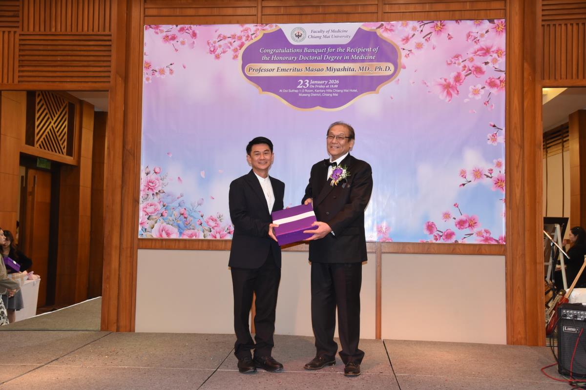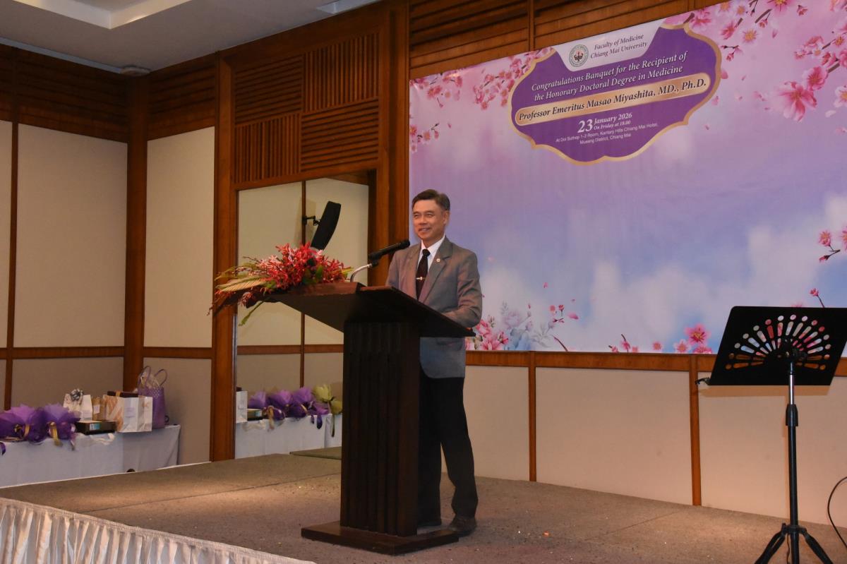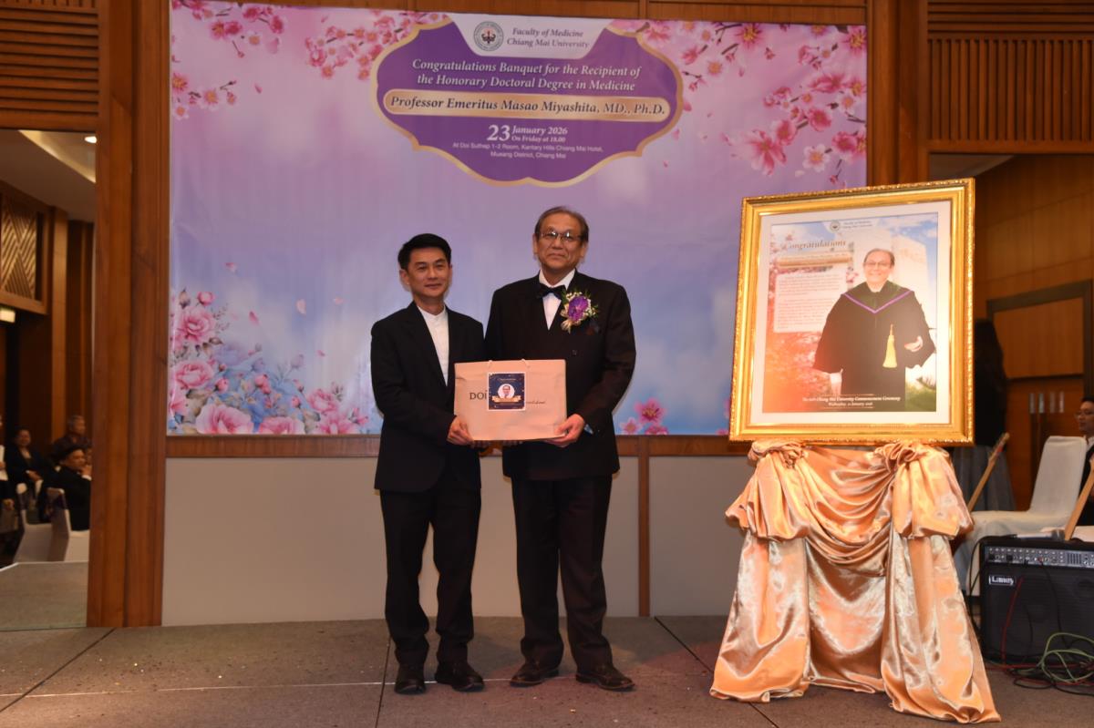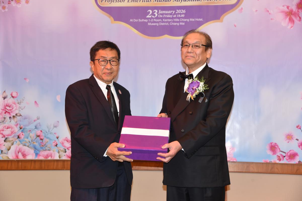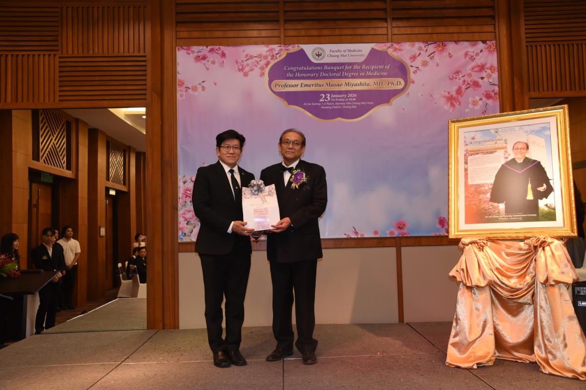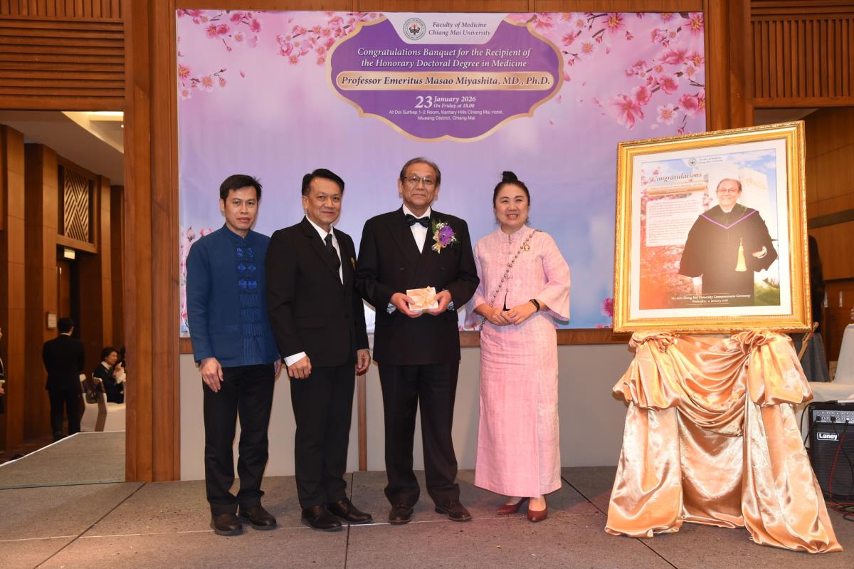 ศาสตราจารย์ ดร.นพ.พงษ์รักษ์ ศรีบัณฑิตมงคล อธิการบดีมหาวิทยาลัยเชียงใหม่ พร้อมด้วยศาสตราจารย์คลินิก นพ.นิเวศน์ นันทจิต เลขาธิการมูลนิธิขาเทียมในพระบรมราชูปถัมภ์ฯ อดีตอธิการบดีมหาวิทยาลัยเชียงใหม่ รองศาสตราจารย์ นายแพทย์นเรนทร์ โชติรสนิรมิต กล่าวแสดงความยินดีแก่ศาสตราจารย์กิตติคุณ นายแพทย์มาซาโอะ มิยาชิตะ (Professor Emeritus Masao Miyashita, MD, PhD) ในโอกาสที่ได้รับพระราชทานปริญญาบัตร ปริญญาปรัชญาดุษฎีบัณฑิตกิตติมศักดิ์ สาขาวิชาแพทยศาสตร์ (Honorary Doctoral Degree in Medicine) มหาวิทยาลัยเชียงใหม่ โดยมีคณะผู้บริหาร คณาจารย์ เจ้าหน้าที่ ร่วมพิธี ณ ห้องดอยสุเทพ 1-2 โรงแรมแคนทารี ฮิลส์ เชียงใหม่ วันศุกร์ที่ 23 มกราคม พ.ศ. 2569