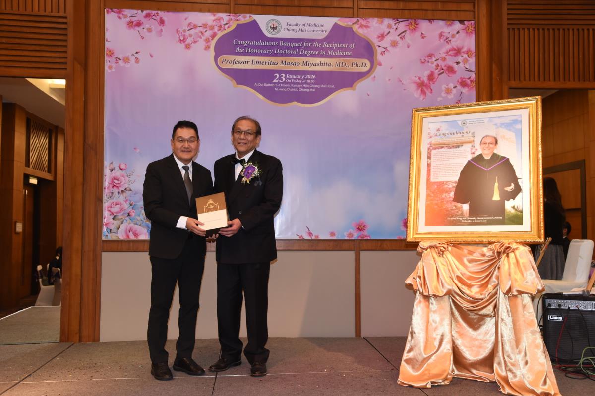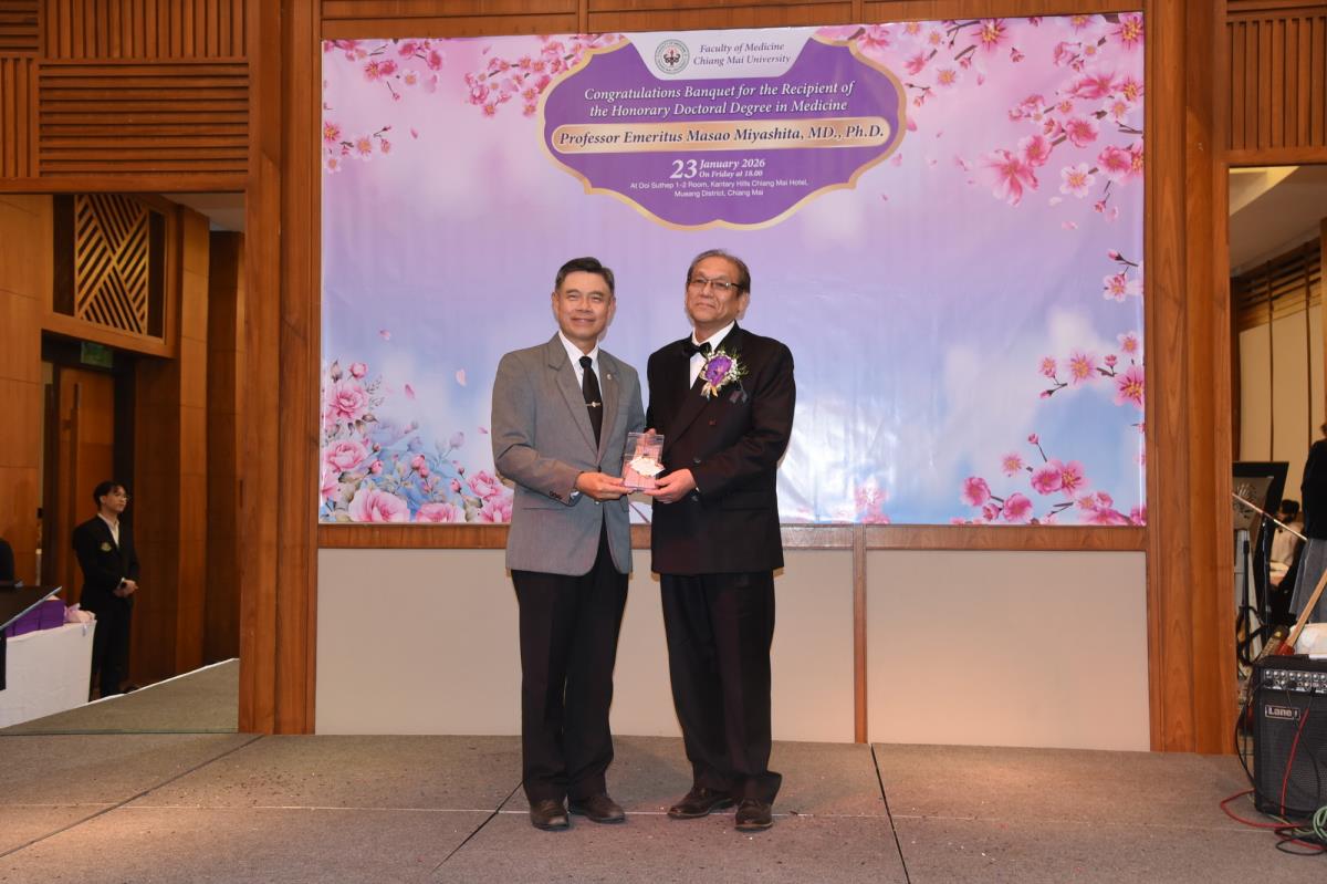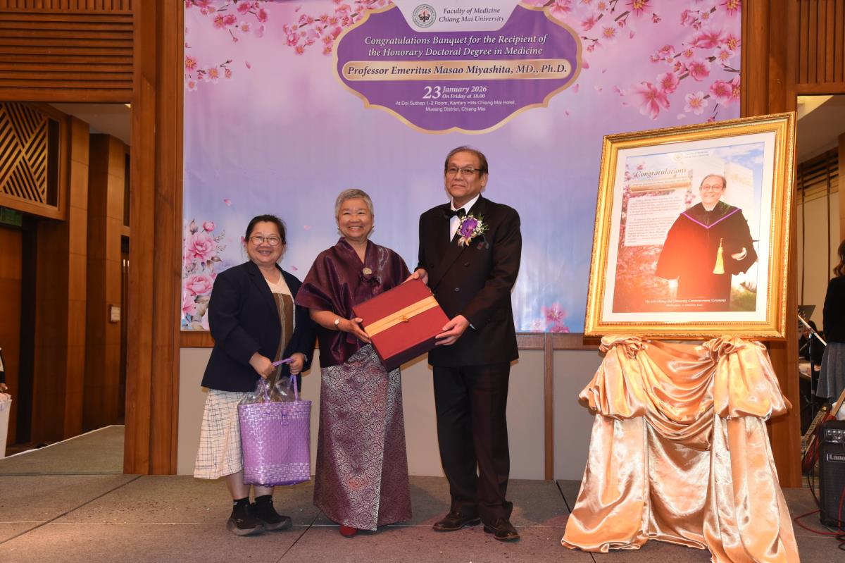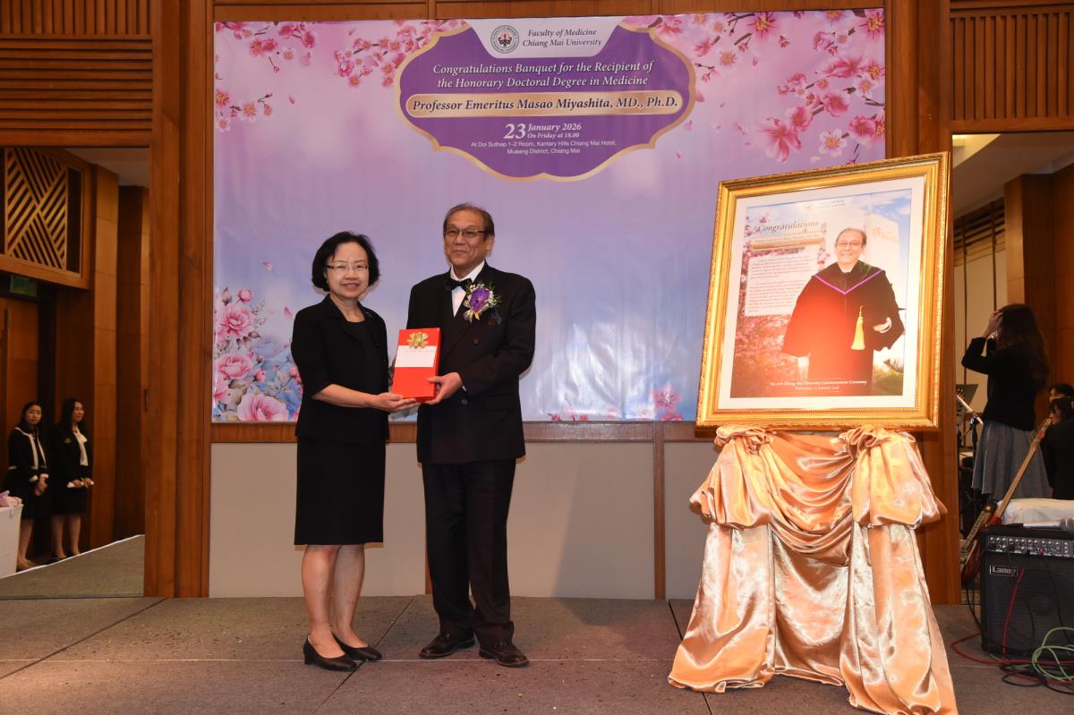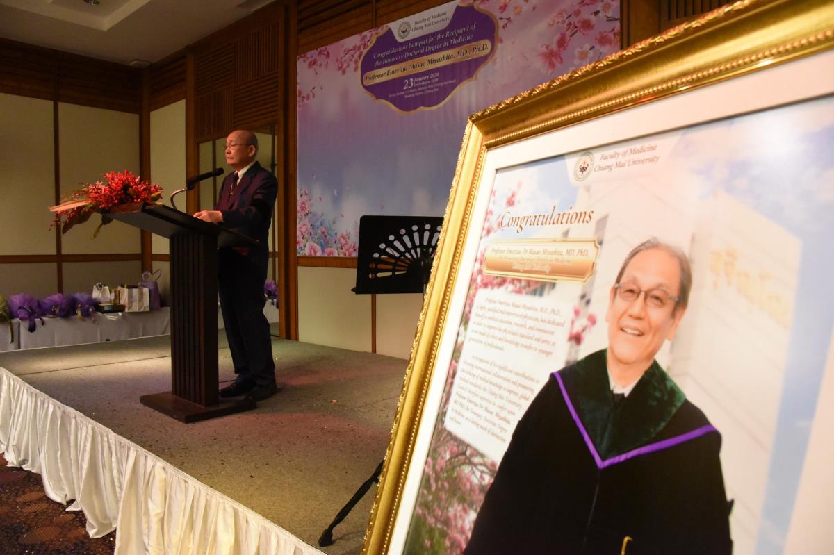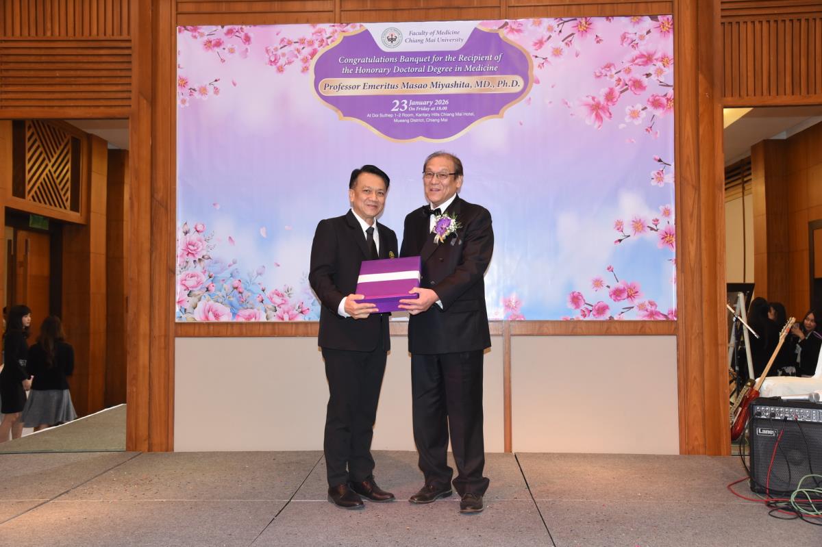 ศาสตราจารย์ ดร.นพ.พงษ์รักษ์ ศรีบัณฑิตมงคล อธิการบดีมหาวิทยาลัยเชียงใหม่ พร้อมด้วยศาสตราจารย์คลินิก นพ.นิเวศน์ นันทจิต เลขาธิการมูลนิธิขาเทียมในพระบรมราชูปถัมภ์ฯ อดีตอธิการบดีมหาวิทยาลัยเชียงใหม่ รองศาสตราจารย์ นายแพทย์นเรนทร์ โชติรสนิรมิต กล่าวแสดงความยินดีแก่ศาสตราจารย์กิตติคุณ นายแพทย์มาซาโอะ มิยาชิตะ (Professor Emeritus Masao Miyashita, MD, PhD) ในโอกาสที่ได้รับพระราชทานปริญญาบัตร ปริญญาปรัชญาดุษฎีบัณฑิตกิตติมศักดิ์ สาขาวิชาแพทยศาสตร์ (Honorary Doctoral Degree in Medicine) มหาวิทยาลัยเชียงใหม่ โดยมีคณะผู้บริหาร คณาจารย์ เจ้าหน้าที่ ร่วมพิธี ณ ห้องดอยสุเทพ 1-2 โรงแรมแคนทารี ฮิลส์ เชียงใหม่ วันศุกร์ที่ 23 มกราคม พ.ศ. 2569