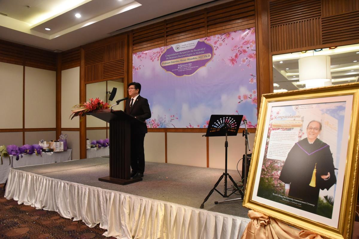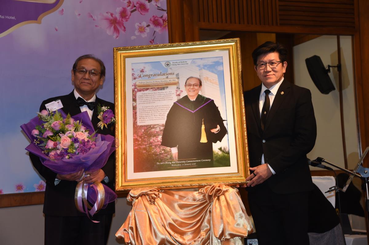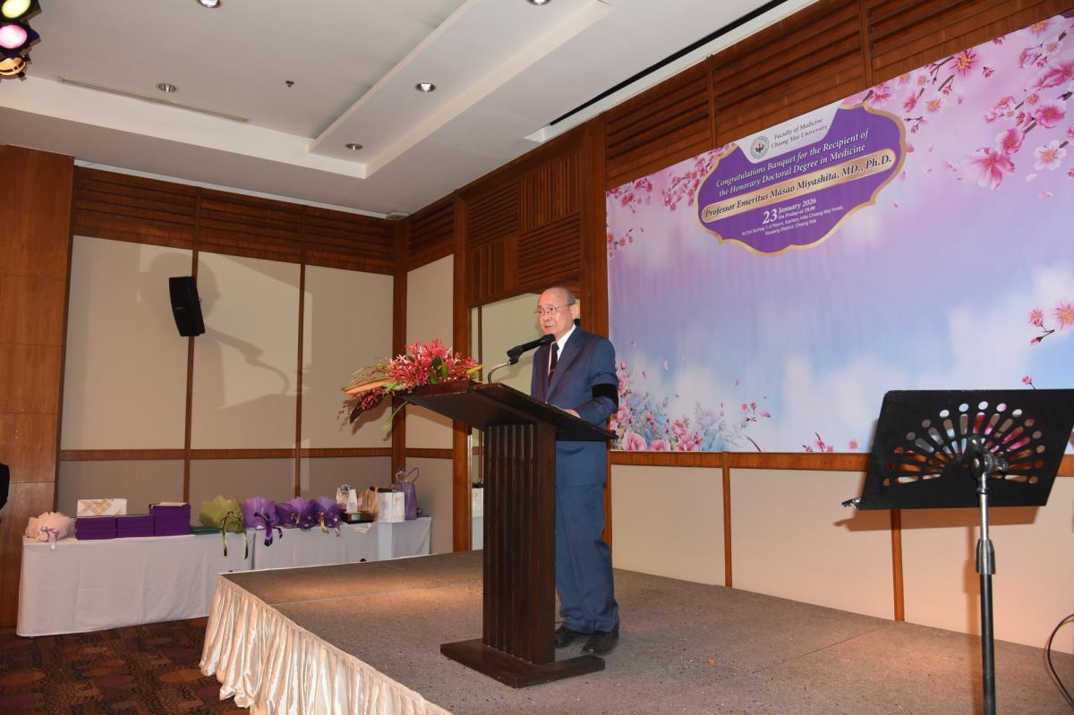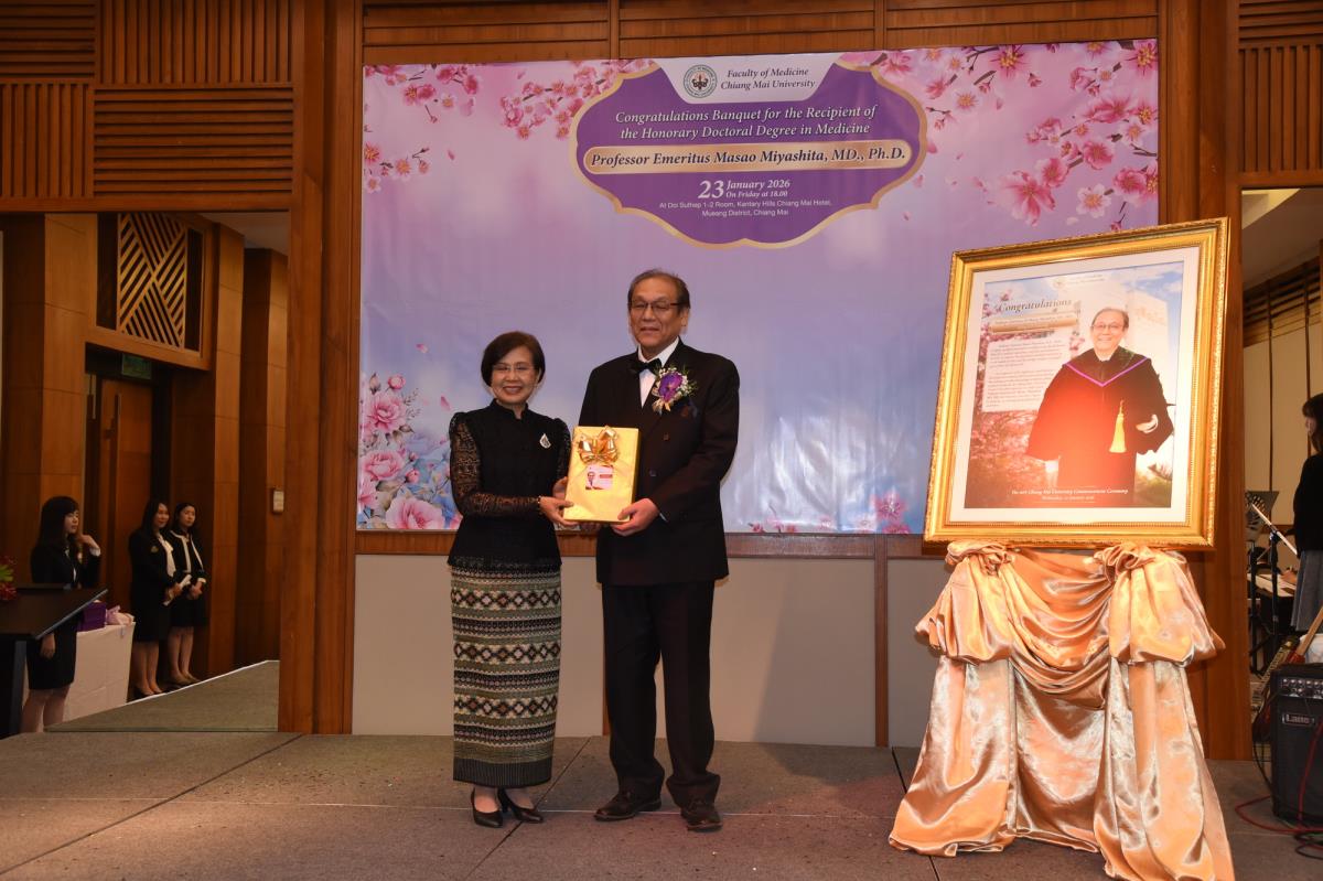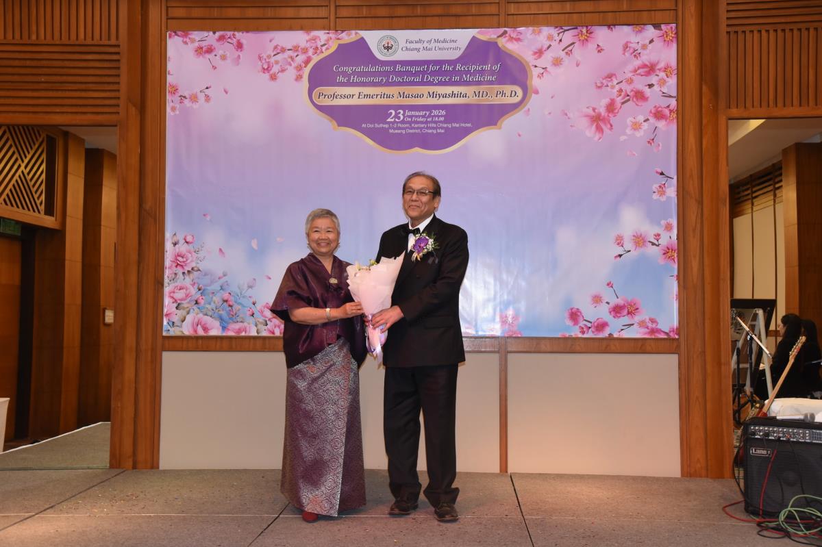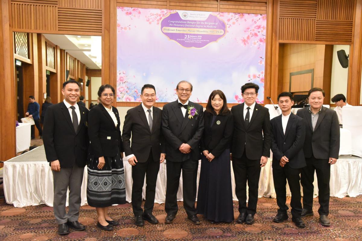 ศาสตราจารย์ ดร.นพ.พงษ์รักษ์ ศรีบัณฑิตมงคล อธิการบดีมหาวิทยาลัยเชียงใหม่ พร้อมด้วยศาสตราจารย์คลินิก นพ.นิเวศน์ นันทจิต เลขาธิการมูลนิธิขาเทียมในพระบรมราชูปถัมภ์ฯ อดีตอธิการบดีมหาวิทยาลัยเชียงใหม่ รองศาสตราจารย์ นายแพทย์นเรนทร์ โชติรสนิรมิต กล่าวแสดงความยินดีแก่ศาสตราจารย์กิตติคุณ นายแพทย์มาซาโอะ มิยาชิตะ (Professor Emeritus Masao Miyashita, MD, PhD) ในโอกาสที่ได้รับพระราชทานปริญญาบัตร ปริญญาปรัชญาดุษฎีบัณฑิตกิตติมศักดิ์ สาขาวิชาแพทยศาสตร์ (Honorary Doctoral Degree in Medicine) มหาวิทยาลัยเชียงใหม่ โดยมีคณะผู้บริหาร คณาจารย์ เจ้าหน้าที่ ร่วมพิธี ณ ห้องดอยสุเทพ 1-2 โรงแรมแคนทารี ฮิลส์ เชียงใหม่ วันศุกร์ที่ 23 มกราคม พ.ศ. 2569
