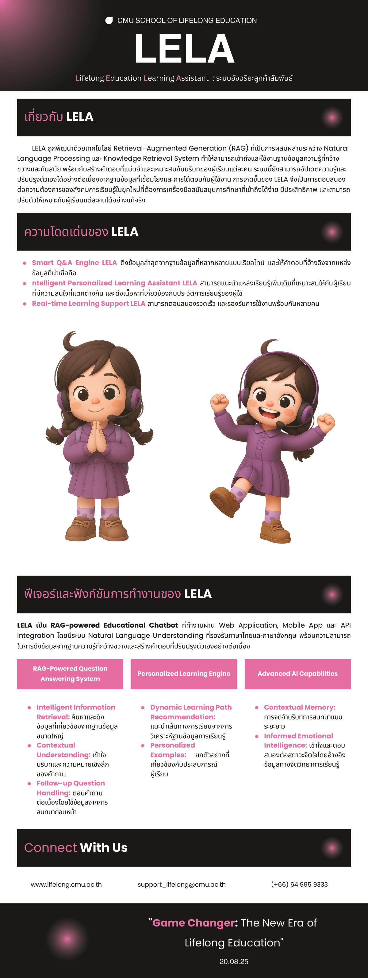 • LELA (Lifelong Education Learning Assistant) : แชตบอทอัจฉริยะตอบคำถามผู้เรียนตลอด 24 ชั่วโมง เหมือนพูดคุยกับเจ้าหน้าที่จริง