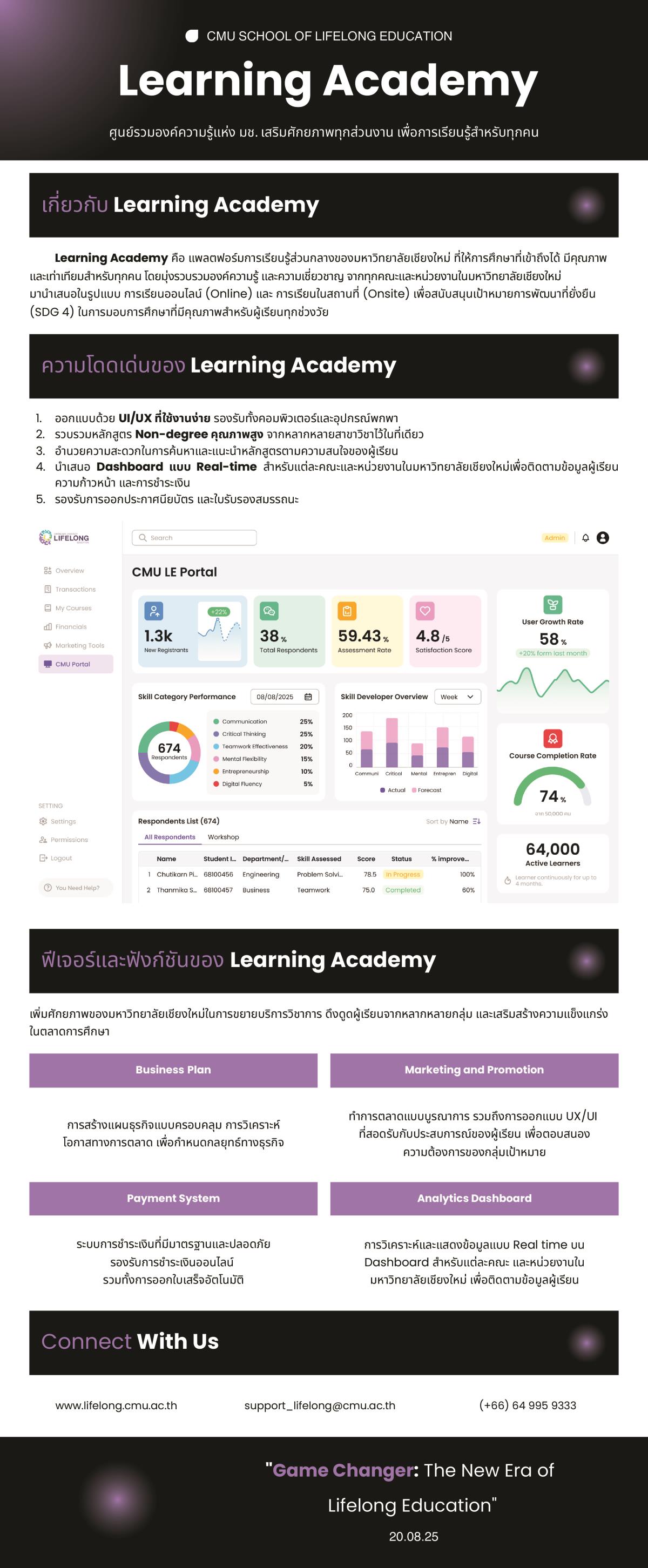 • Learning Academy : แพลตฟอร์มสำหรับคณะ/หน่วยงานที่ต้องการเปิดหลักสูตรเอง พร้อมแดชบอร์ดข้อมูลเรียลไทม์