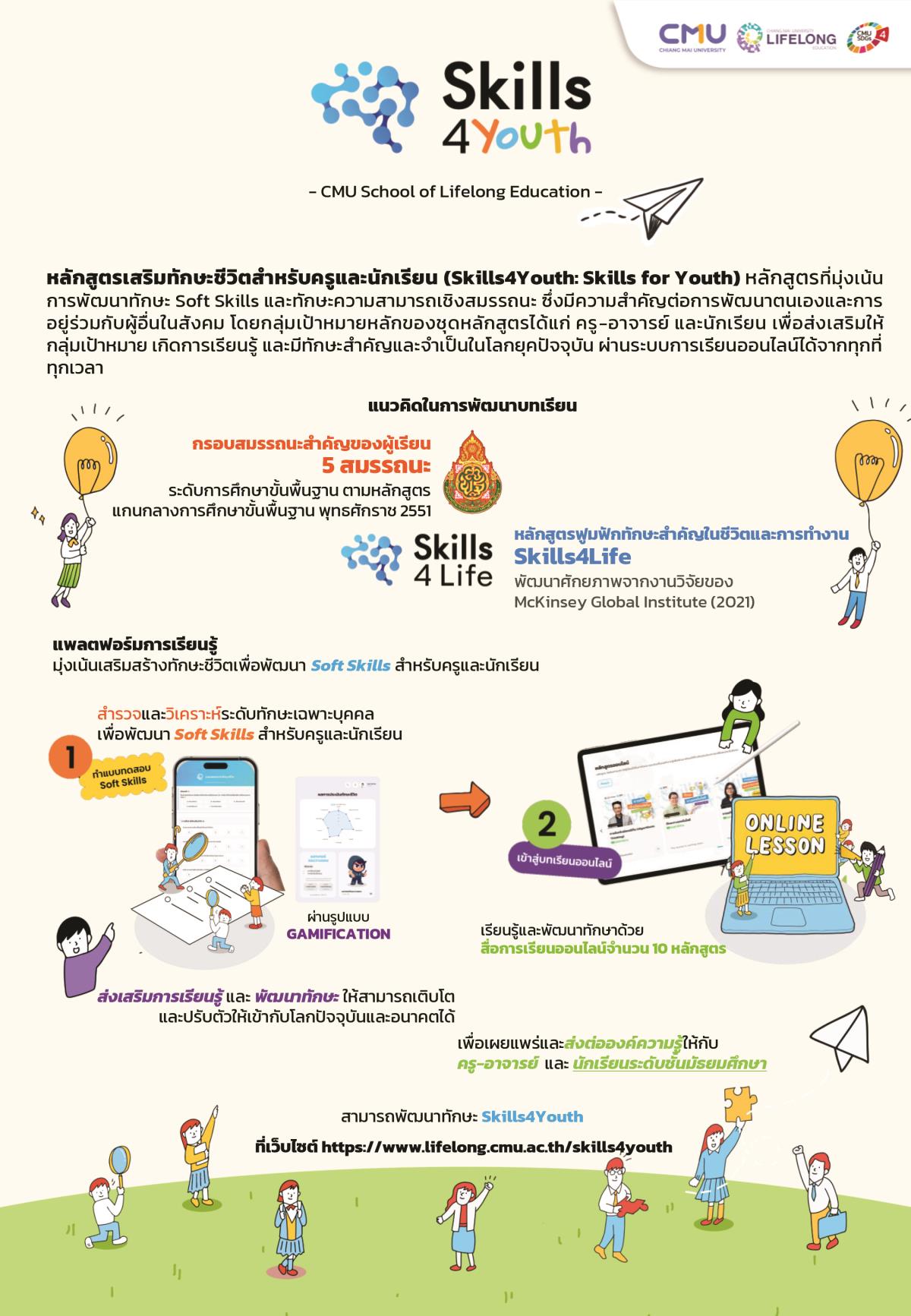 • Skills4Youth : แพลตฟอร์มออนไลน์สำหรับเยาวชน เรียนฟรีผ่าน Self-Assessment ในรูปแบบเกม RPG ผู้เรียนจะได้รับ "ตัวละคร" ที่สะท้อนศักยภาพของตนเอง