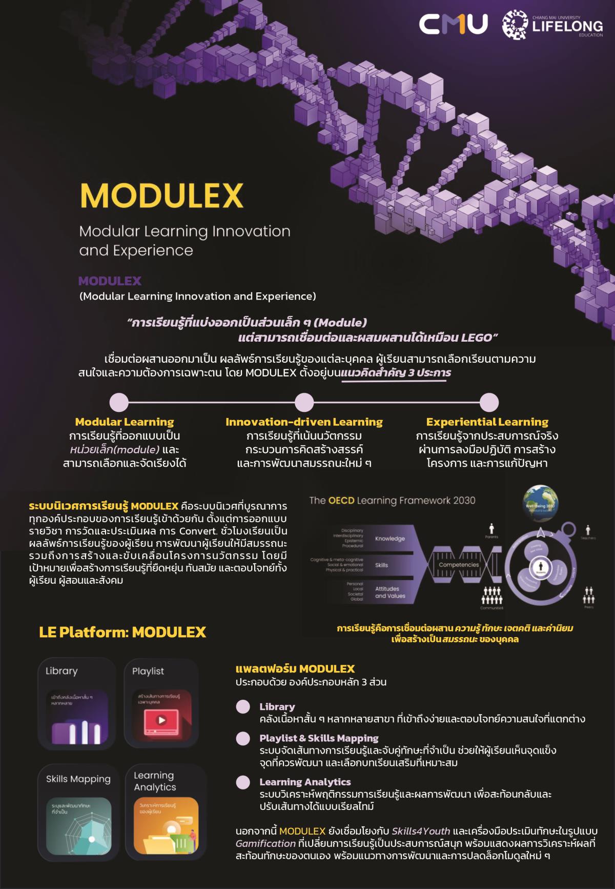 • MODULEX - Micro Learning Revolution : แพลตฟอร์มการเรียนรู้แบบ "โมดูลย่อย" เปรียบเสมือน "LEGO Baseplate" ที่เชื่อมต่อบทเรียนขนาดเล็กอย่างมีระบบ ตอบโจทย์สมาธิผู้เรียนยุคใหม่ที่สั้นลงเหลือเพียง 8 นาที