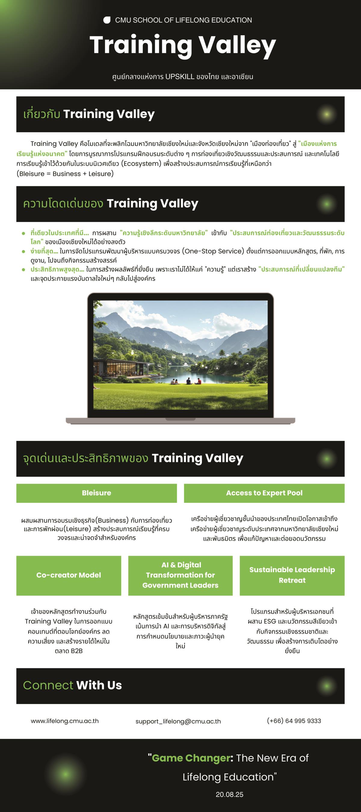 • Training Valley : โมเดลใหม่ "เรียน + พัก + เที่ยว" เปลี่ยนเชียงใหม่ให้กลายเป็น "ศูนย์กลางแห่งการ Upskill ของไทยและอาเซียน" CMU Lifelong กำลังจะพาเชียงใหม่ก้าวไปอีกขั้น สู่การเป็น 'เมืองแห่งการเรียนรู้และการพัฒนาคน' ที่ไม่เหมือนใครในภูมิภาค"
