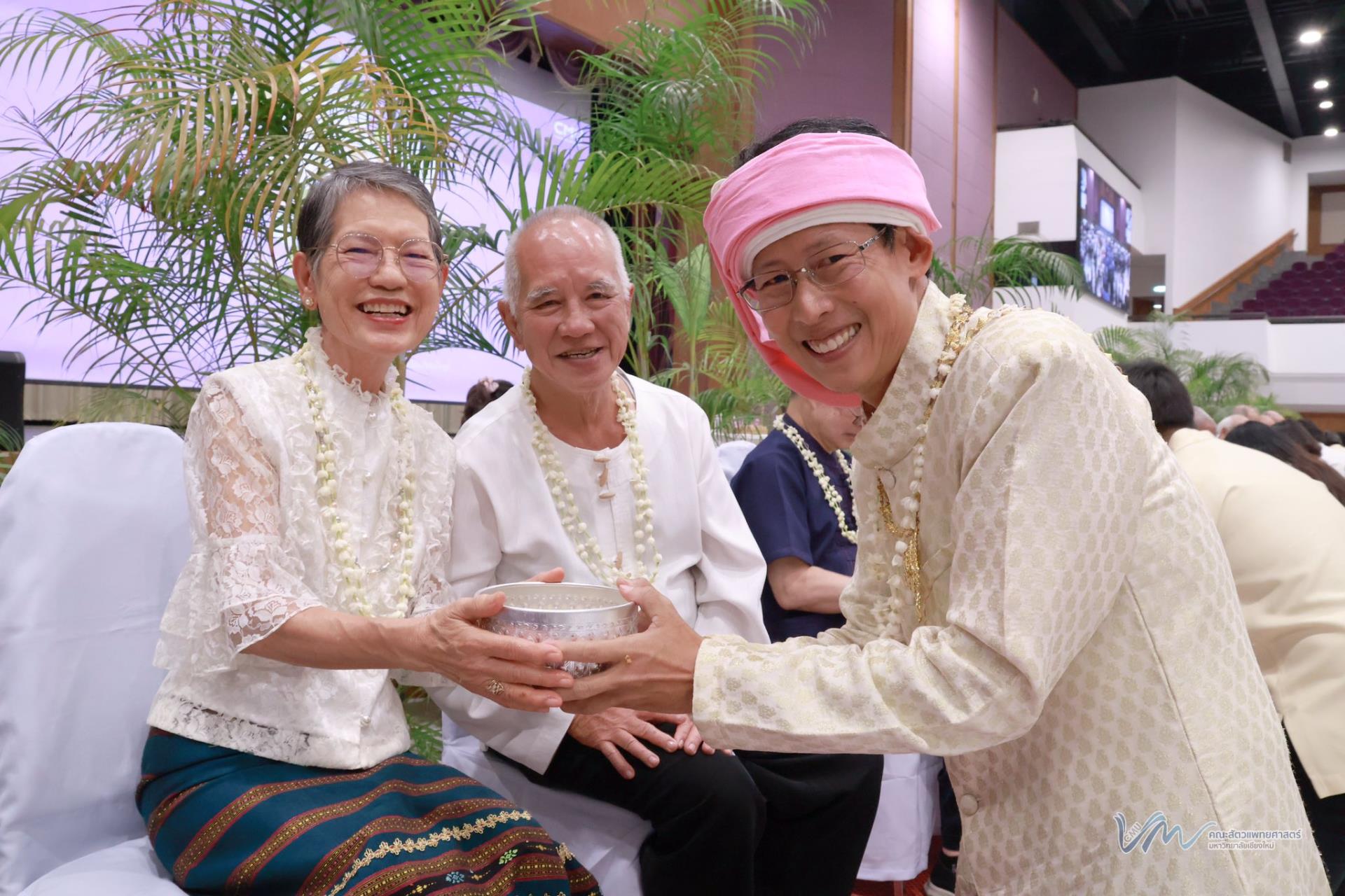 คณะสัตวแพทยศาสตร์ มหาวิทยาลัยเชียงใหม่ นำโดย ศ.(เชี่ยวชาญพิเศษ) ดร. น.สพ.กรกฎ งานวงศ์พาณิชย์ คณบดีคณะสัตวแพทยศาสตร์ พร้อมด้วยคณะผู้บริหาร คณาจารย์ และบุคลากร เข้าร่วม “พิธีดำหัวอธิการบดี อดีตอธิการบดี และคณาจารย์อาวุโส มหาวิทยาลัยเชียงใหม่” เนื่องในโอกาสวันขึ้นปีใหม่เมือง ประจำปี 2569 ณ หอประชุมมหาวิทยาลัยเชียงใหม่ เมื่อวันที่ 24 เมษายน 2569 ภายในพิธี ศ. ดร. นพ.พงษ์รักษ์ ศรีบัณฑิตมงคล อธิการบดีมหาวิทยาลัยเชียงใหม่ ได้กล่าวคำสูมาคารวะและขอพรจากคณาจารย์อาวุโส เพื่อความเป็นสิริมงคลแก่บุคลากรและชาวมหาวิทยาลัยเชียงใหม่ พร้อมรับฟังโอวาทและคำอวยพรจาก ศ.พิเศษ ดร. สุรเกียรติ์ เสถียรไทย นายกสภามหาวิทยาลัยเชียงใหม่ ซึ่งเป็นถ้อยคำอันทรงคุณค่าและสร้างพลังใจแก่ผู้เข้าร่วมงาน
