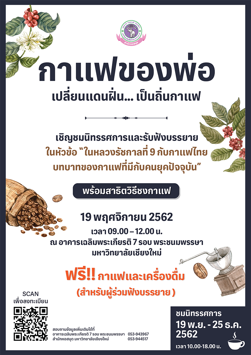 โอกาสนี้ ขอเชิญผู้สนใจเข้าร่วมพิธีเปิดนิทรรศการเรื่อง “กาแฟของพ่อ เปลี่ยนแดนฝิ่น เป็นถิ่นกาแฟ” ในวันอังคารที่ 19 พฤศจิกายน 2562 เวลา 9.00-12.00 น. ณ อาคารเฉลิมพระเกียรติ 7 รอบ พระชนมพรรษา มหาวิทยาลัยเชียงใหม่ และร่วมรับฟังการบรรยายในหัวข้อ "ในหลวงรัชการที่ 9 กับกาแฟไทย และบทบาทของกาแฟที่มีกับคนยุคปัจจุบัน” พร้อมกิจกรรมสาธิตวิธีการชงกาแฟในรูปแบบต่าง ๆ ผู้สนใจสามารถลงทะเบียนเข้าร่วมงาน ได้ที่