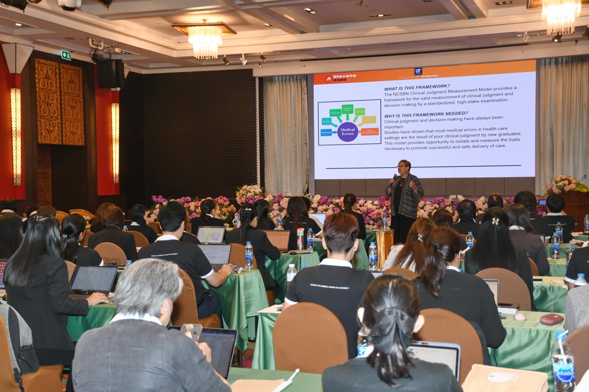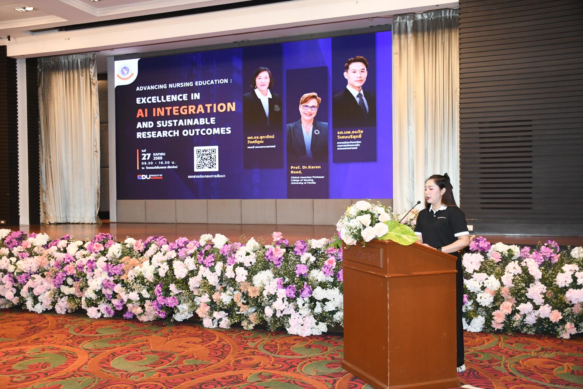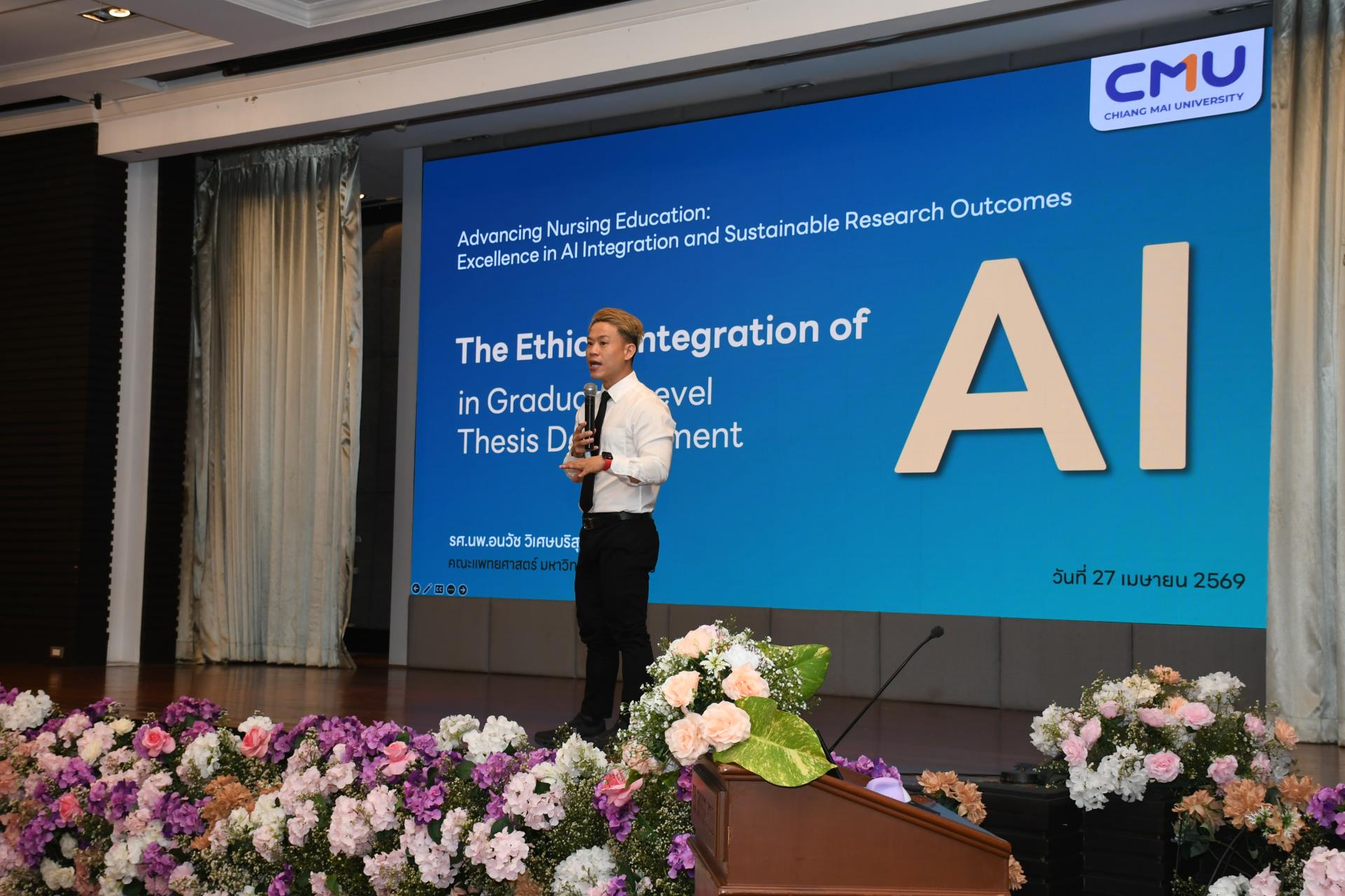 วันจันทร์ที่ 27 เมษายน 2569 ผู้ช่วยศาสตราจารย์ ดร.สุภารัตน์ วังศรีคูณ คณบดีคณะพยาบาลศาสตร์ มหาวิทยาลัยเชียงใหม่ เป็นประธานกล่าวเปิดโครงการสัมมนาวิชาการและการประเมินผลการจัดการเรียนการสอน ประจำปีการศึกษา 2568 เรื่อง "Advancing Nursing Education: Excellence in AI Integration and Sustainable Research Outcomes" พร้อมกันนี้ได้เป็นวิทยากรบรรยายหัวข้อ "นโยบายการศึกษาระดับปริญญาตรีและบัณฑิตศึกษา คณะพยาบาลศาสตร์ มช." ณ ห้องอิมพีเรียล บอลรูม โรงแรมดิเอ็มเพรส เชียงใหม่