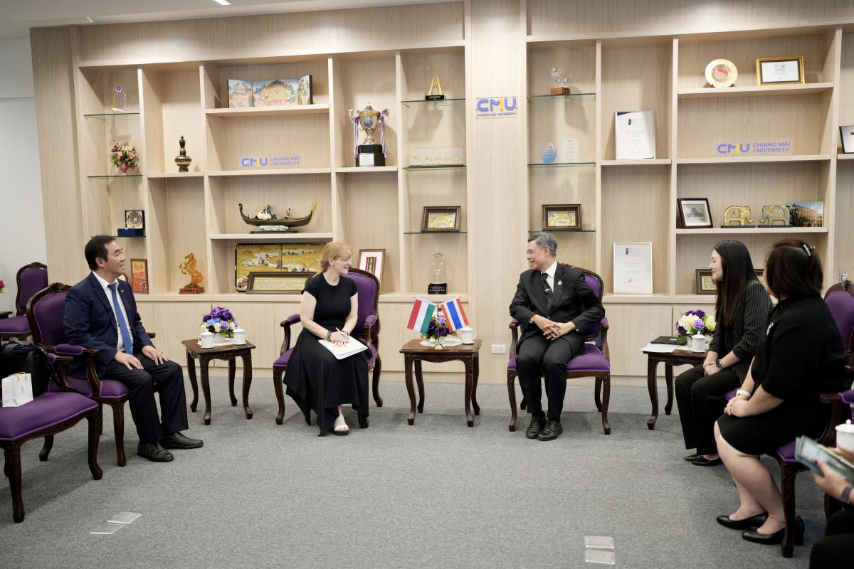 ศาสตราจารย์ ดร.นพ.พงษ์รักษ์ ศรีบัณฑิตมงคล อธิการบดีมหาวิทยาลัยเชียงใหม่ พร้อมด้วยคณะผู้บริหารมหาวิทยาลัยเชียงใหม่ ให้การต้อนรับ H.E.Dr. Szilvia Szaloki เอกอัครราชทูตฮังการี ประจำประเทศไทย และคุณวโรดม ปิฏกานนท์ กงสุลกิตติมศักดิ์ฮังการี ณ จังหวัดเชียงใหม่ ในโอกาสเยี่ยมชมมหาวิทยาลัยเชียงใหม่ และเข้าเยี่ยมคารวะผู้บริหาร พร้อมทั้งปรึกษาหารือการเสริมสร้างความร่วมมือด้าน การศึกษา การวิจัย และการแลกเปลี่ยนวัฒนธรรม พร้อมทั้งการจัดกิจกรรมเฉลิมฉลอง ครบรอบ 50 ปีความสัมพันธ์ทางการทูตไทย–ฮังการี เมื่อวันศุกร์ที่ 26 ธันวาคม พ.ศ. 2568 ณ ห้องรับรอง ม.ล.ปิ่น มาลากุล สำนักงานมหาวิทยาลัย มหาวิทยาลัยเชียงใหม่