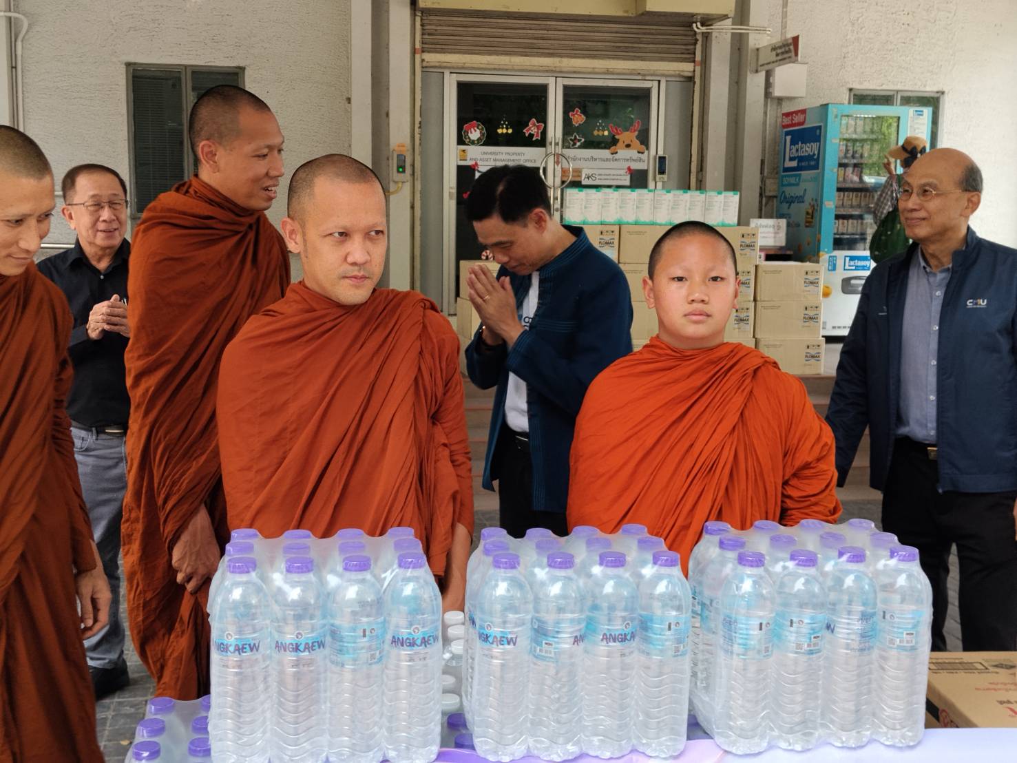 ศาสตราจารย์ ดร.นพ.พงษ์รักษ์ ศรีบัณฑิตมงคล อธิการบดี พร้อมด้วยคณะผู้บริหารมหาวิทยาลัยเชียงใหม่ และมูลนิธิพัฒนามหาวิทยาลัยเชียงใหม่ ถวายเครื่องเป่าใบไม้ น้ำดื่ม และหน้ากากอนามัย แด่พระครูปลัดจารุภัทร อาภากโร ดร. เจ้าคณะ ต.แม่แตง (ธรรมยุต) เจ้าอาวาสวัดป่านาบุญ อ.แม่แตง จ.เชียงใหม่ เพื่อสนับสนุนและช่วยเหลือการปฏิบัติงานของเจ้าหน้าที่ ในการบรรเทาปัญหาไฟป่า และสถานการณ์ปัญหาฝุ่นหมอกควัน PM 2.5 ณ สำนักงานบริหารและจัดการทรัพย์สิน มหาวิทยาลัยเชียงใหม่ วันพุธที่ 8 เมษายน พ.ศ. 2569