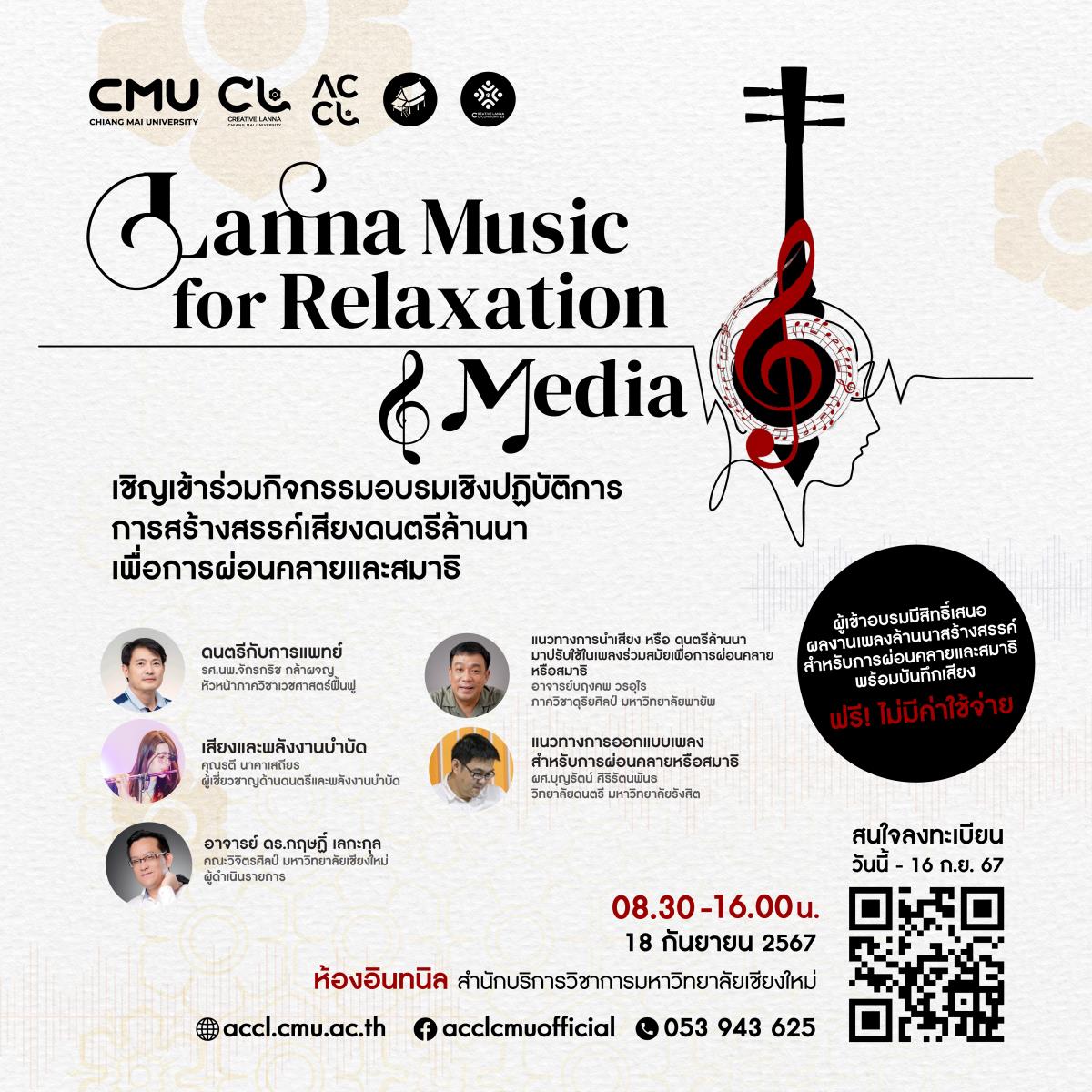 โดยจะมีการฝึกอบรมการสร้างสรรค์เสียงดนตรีล้านนาเพื่อการผ่อนคลายและดนตรีเพื่อสมาธิ ซึ่งเป็นกิจกรรมให้ความรู้เรื่องดนตรีล้านนาร่วมสมัย เพื่อประโยชน์ในแนวทางสุขภาพทางเลือก ที่สร้างความผ่อนคลาย เน้นการรับรู้ การฟังเสียง การตอบสนองของสมอง ระบบประสาท และร่างกาย โดยแพทย์ผู้เชี่ยวชาญด้านเวชศาสตร์ฟื้นฟู นักดนตรีบำบัด นักประพันธ์เพลงล้านนาร่วมสมัย และผู้เชี่ยวชาญด้านการบันทึกเสียงดนตรี เพื่อนำองค์ความรู้ที่ได้จากการฝึกอบรมต่อยอดในการสร้างสรรค์เสียงดนตรีล้านนาเพื่อการสมาธิและการผ่อนคลาย ในวันที่ 18 กันยายน 2567 ณ ห้องอินทนิล สำนักบริการวิชาการ มหาวิทยาลัยเชียงใหม่
