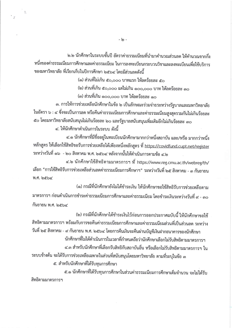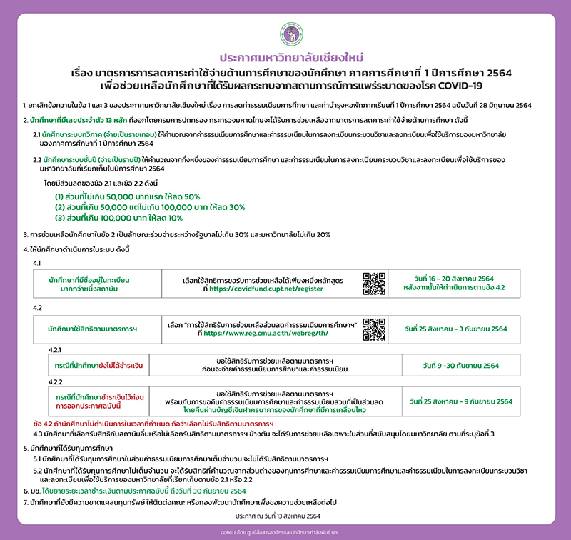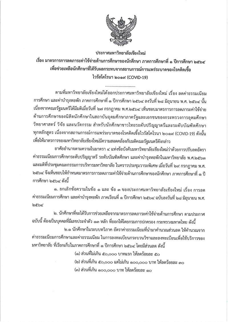 เรื่อง มาตรการการลดภาระค่าใช้จ่ายด้านการศึกษาของนักศึกษา ภาคการศึกษาที่ 1 ปีการศึกษา 2564