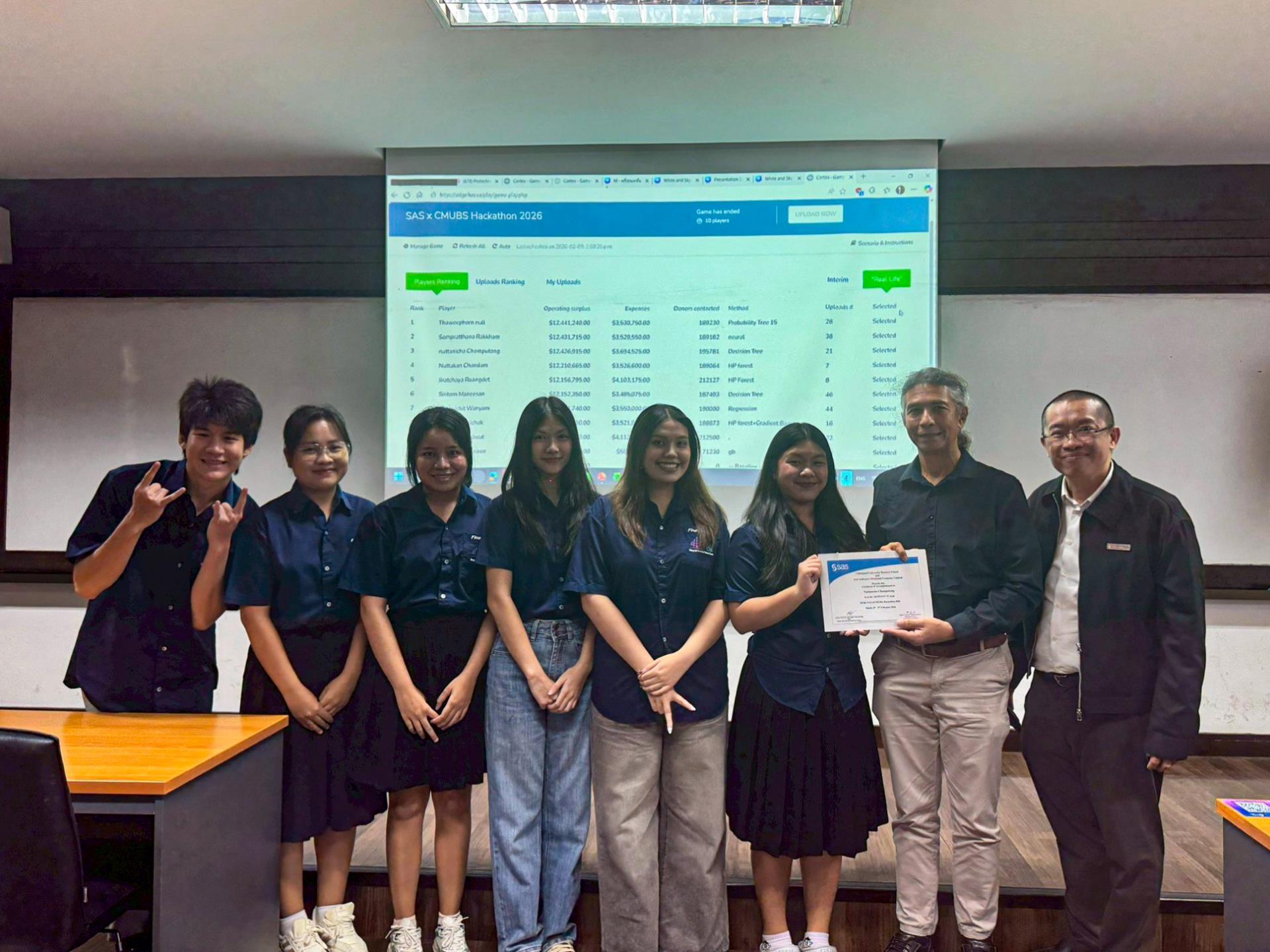 การแข่งขันดังกล่าว ดำเนินการโดย รศ. ดร.รวี ลงกานี อาจารย์ประจำภาควิชาการเงิน คณะบริหารธุรกิจ มหาวิทยาลัยเชียงใหม่ ร่วมกับคุณณรงค์ศักดิ์ ดิษฐสกุล Senior Customer Training Advisor บริษัท แซส ซอฟท์แวร์ (ไทยแลนด์) จำกัด โดยเป็นการทดสอบทักษะด้าน Data Analytics และ AI ผ่านโจทย์ธุรกิจจริงในรูปแบบ Hackathon ภายใต้บรรยากาศการแข่งขันที่เข้มข้นต่อเนื่องตลอด 4 วัน ทีมผู้ชนะได้แสดงให้เห็นถึงความสามารถในการคิดวิเคราะห์เชิงลึก การนำเสนอแนวทางแก้ไขปัญหาอย่างสร้างสรรค์ และการทำงานเป็นทีมอย่างมีประสิทธิภาพ สะท้อนศักยภาพของนักศึกษา CMUBS ในการบูรณาการองค์ความรู้ด้านการเงินและธุรกิจกับเทคโนโลยีสมัยใหม่ และตอกย้ำแนวทางของคณะฯ ในการพัฒนานักการเงินและนักบริหารรุ่นใหม่ในเวทีระดับสากล