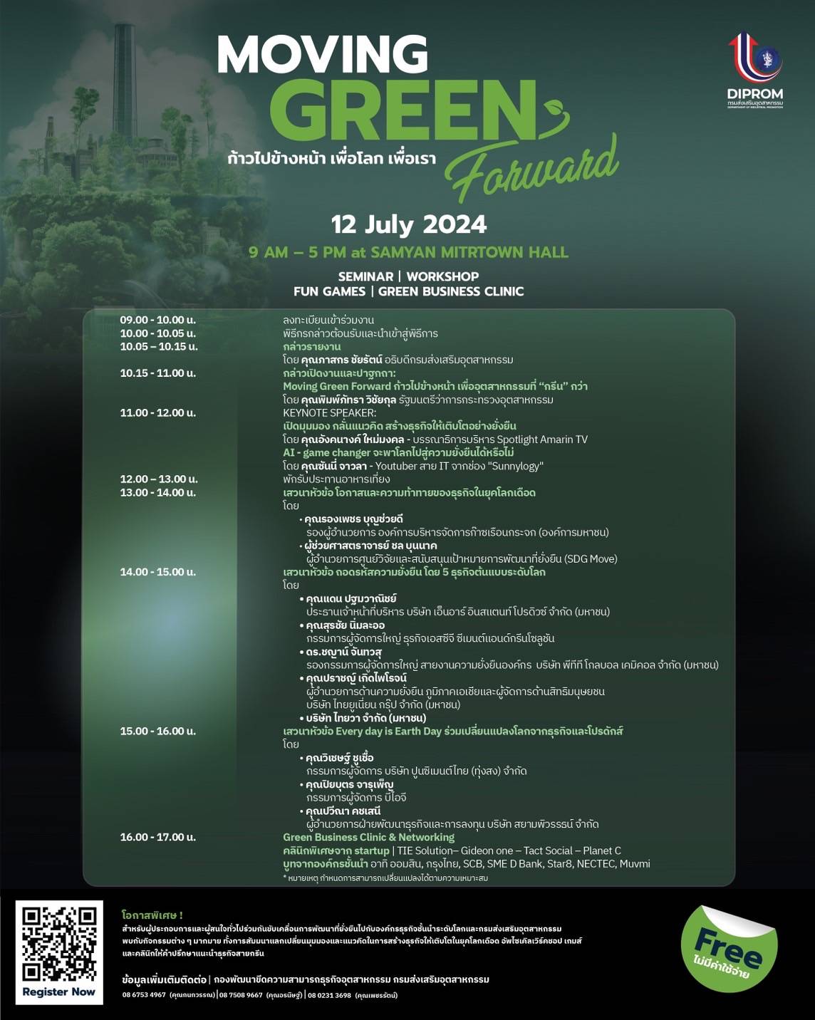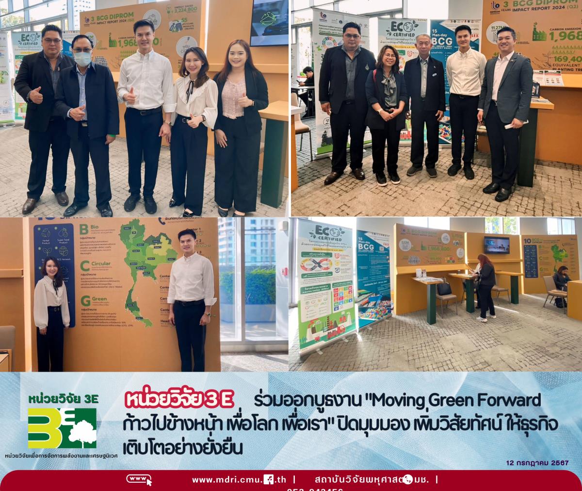 ?? วันนี้ 12 กรกฎาคม 2567 เวลา 09.00 – 17.00 น. รศ.ดร.เศรษฐ์ สัมภัตตะกุล รักษาการผู้อำนวยการสำนักบริการวิชาการ และหัวหน้าหน่วยวิจัยเพื่อการจัดการพลังงานและเศรษฐนิเวศ (3E) สถาบันวิจัยพหุศาสตร์ มหาวิทยาลัยเชียงใหม่ พร้อมด้วย ดร.รัตชยุดา กองบุญ รองหัวหน้าหน่วยวิจัยฯ และนางสาวณัฐวรรณ สืบนันตา นักวิจัย ร่วมออกบูธงาน "Moving Green Forward ก้าวไปข้างหน้า เพื่อโลก เพื่อเรา” เปิดมุมมอง เพิ่มวิสัยทัศน์ ให้ธุรกิจเติบโตอย่างยั่งยืน ซึ่งเป็นกิจกรรมสำหรับผู้ที่สนใจด้านความยั่งยืน จัดโดย กรมส่งเสริมอุตสาหกรรม ณ ศูนย์การค้าสามย่านมิตรทาวน์ สามย่านมิตรทาวน์ฮอลล์ 1 ชั้น 5
